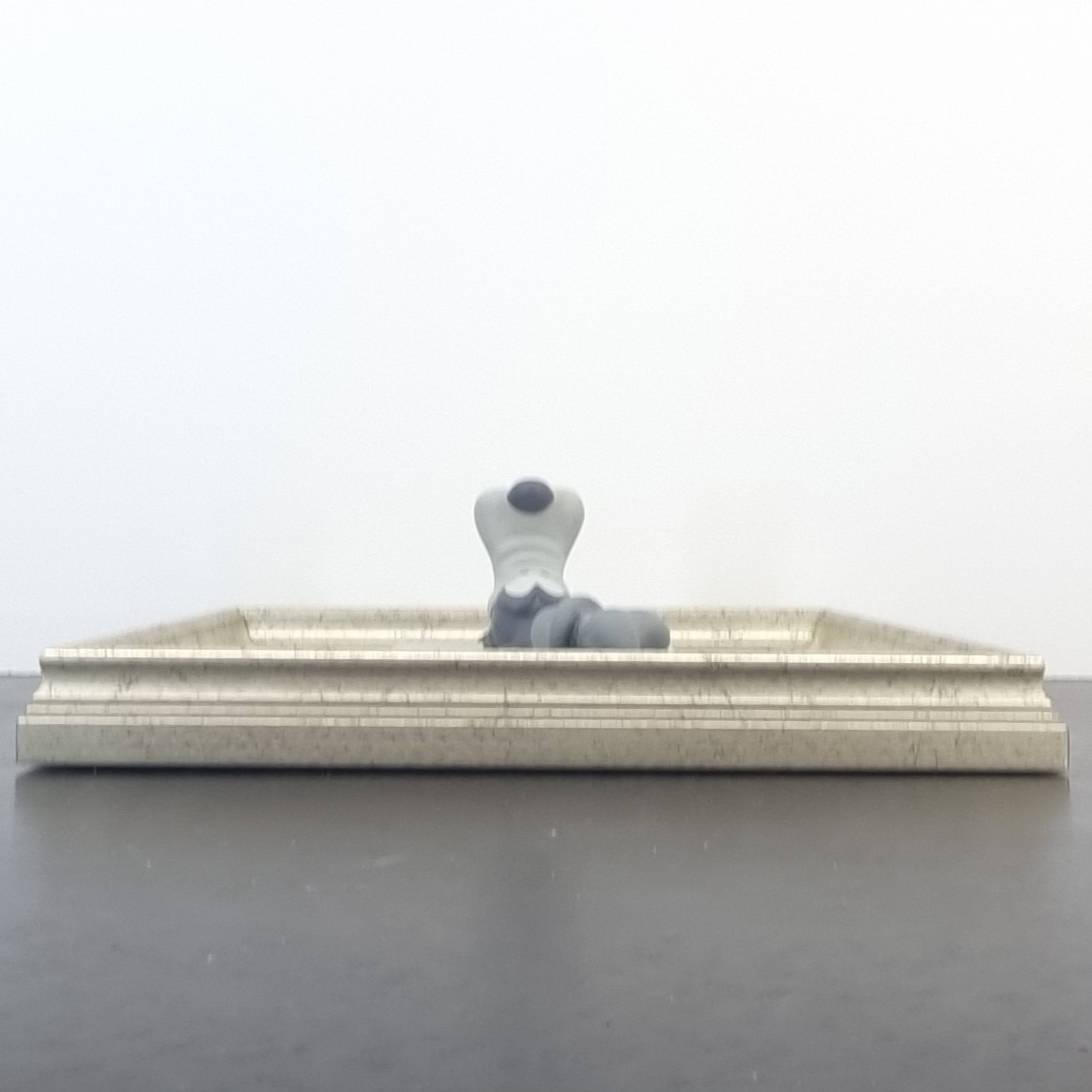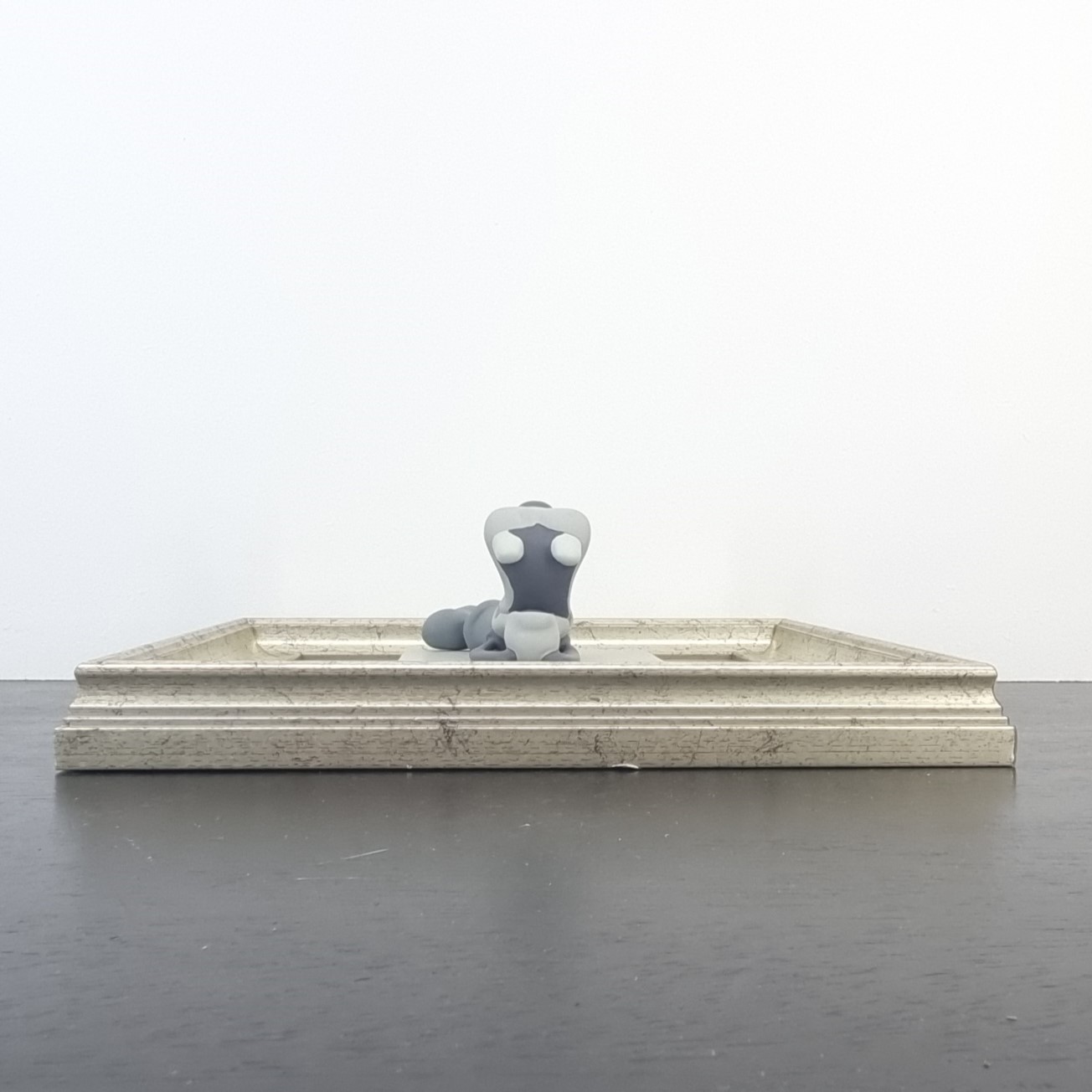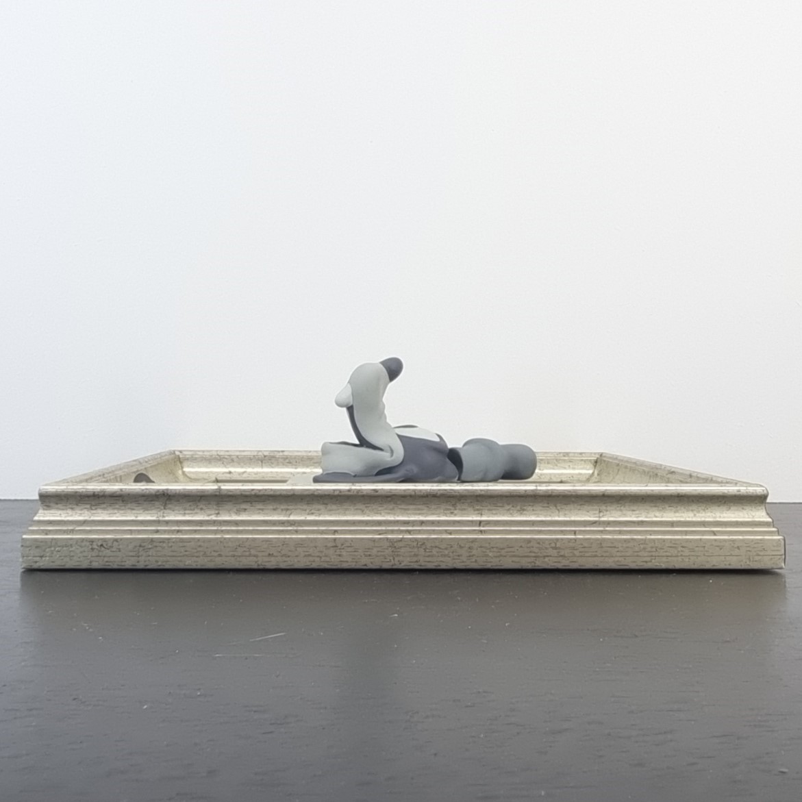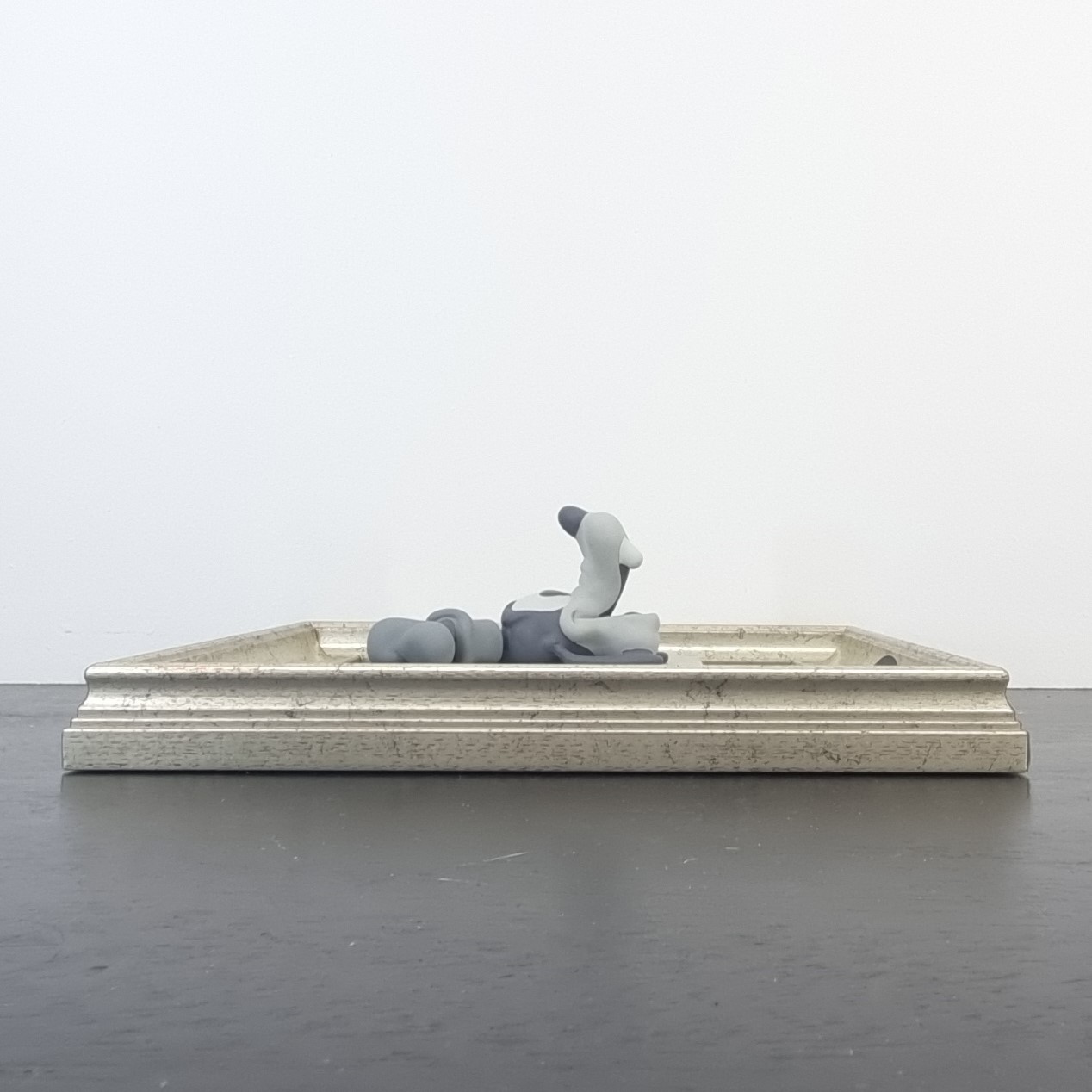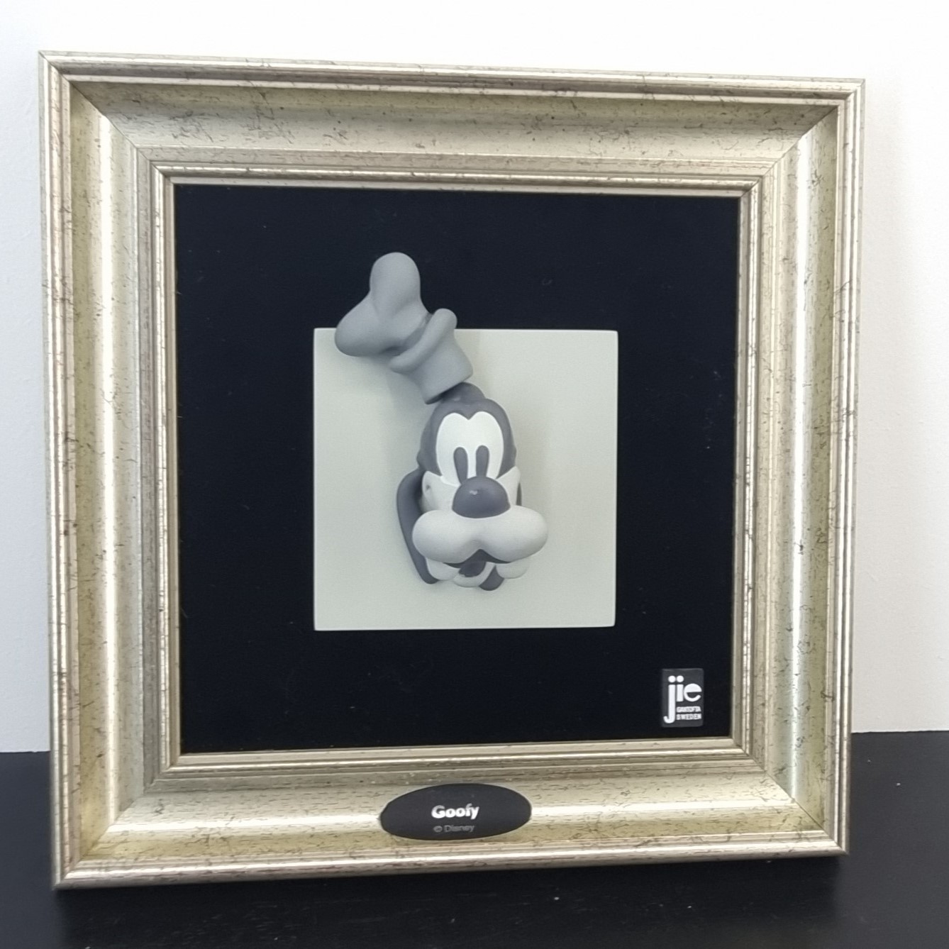 The outer dimension of this Goofy artwork is approximately 26 cm in height, crafted from durable resin, and placed in a wooden frame.
