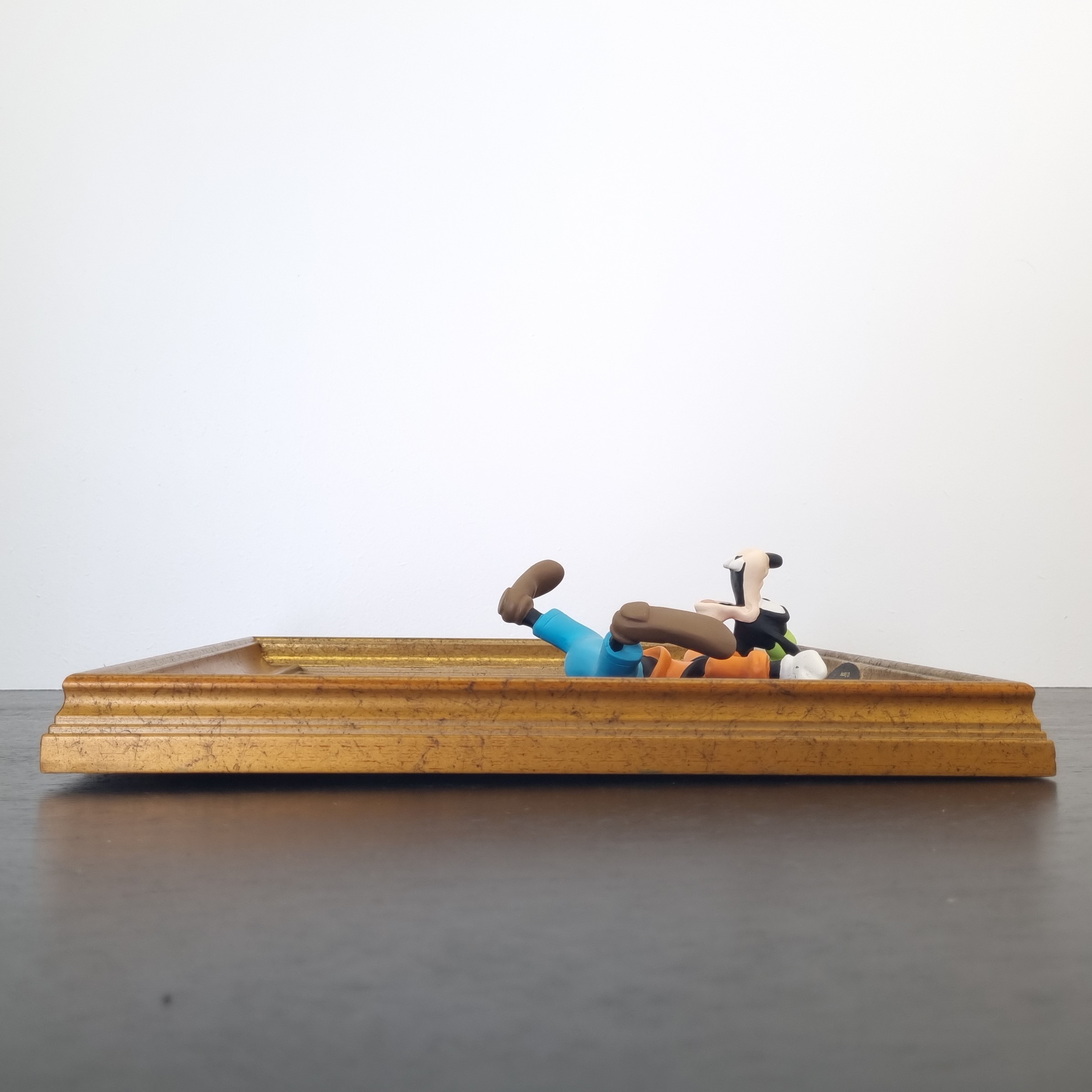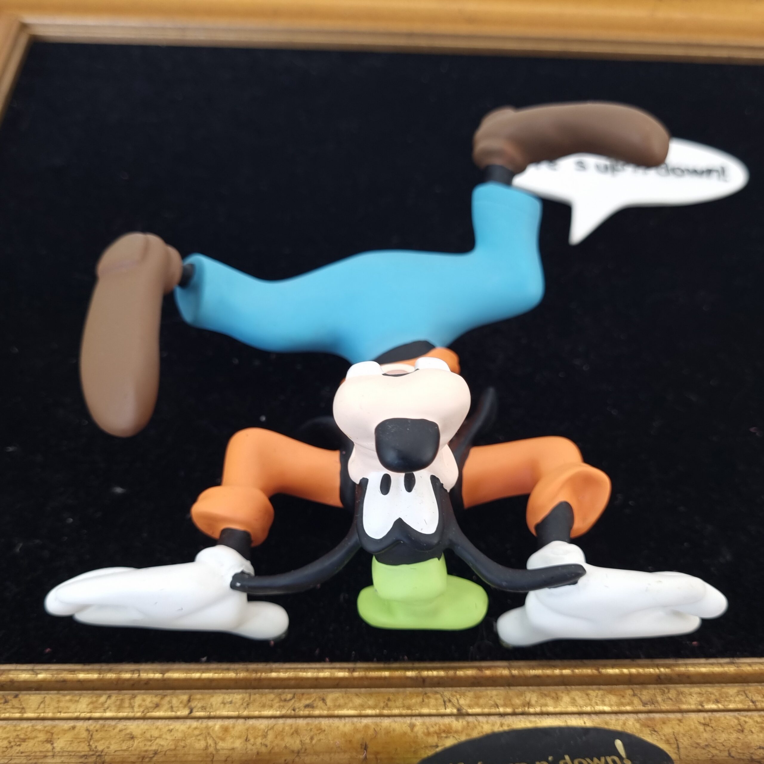 The outer dimension of this Goofy artwork is approximately 31 cm in height, crafted from durable resin, and placed in a wooden frame.