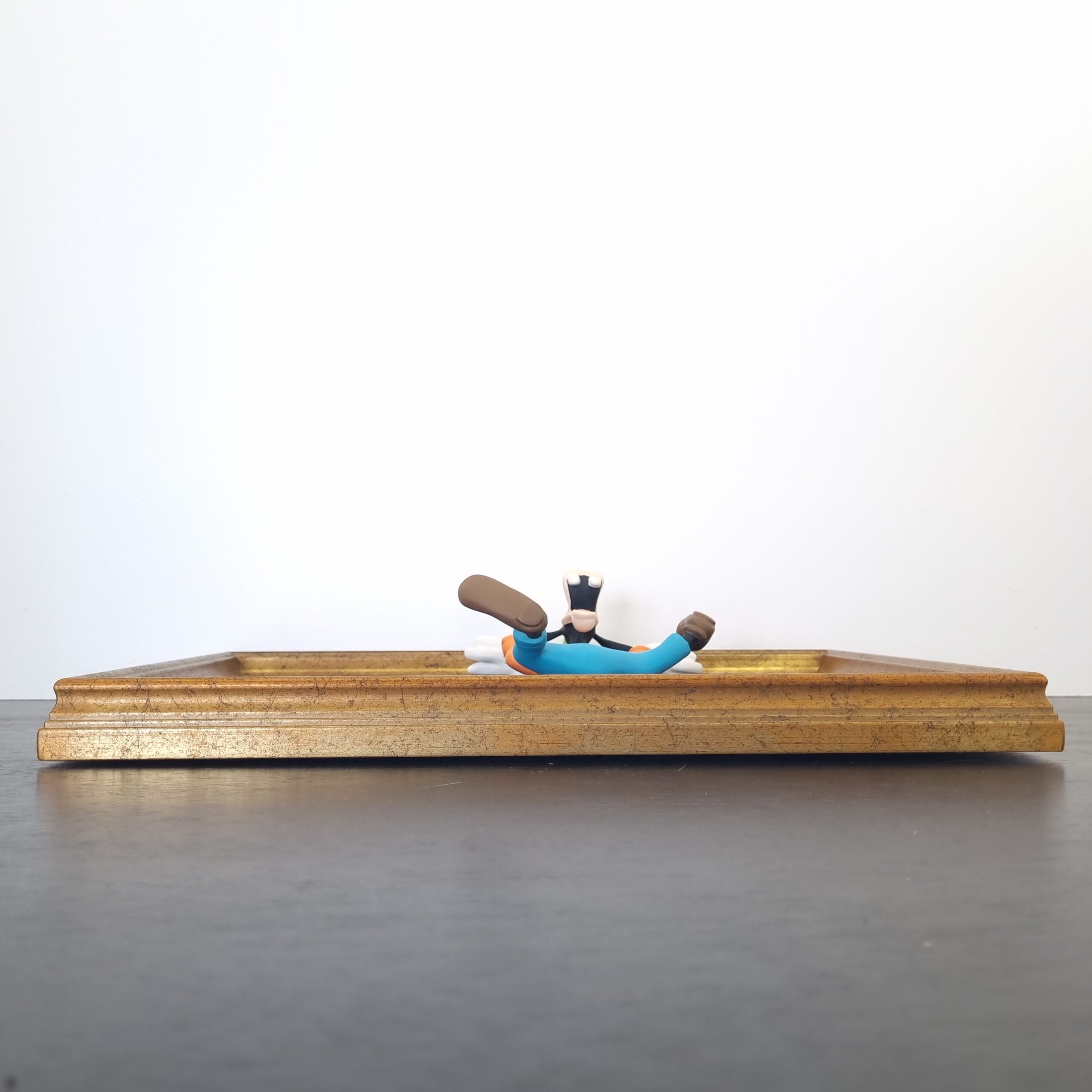 This three-dimensional wall art, featuring the beloved character Goofy, is a collectible from Jie Art under license from Walt Disney. Crafted from high-quality resin, it sits against a black cloth background. Additionally, a wooden frame encases it. Joakim Lindstrup designed this piece in the late 1980s to early 1990s. Consequently, this vintage Walt Disney collectible remains in excellent condition. The piece showcases a stunning 3D depiction of Goofy and is called; Life’s up n’down!. Furthermore, a gold-painted frame enhances its overall appeal.