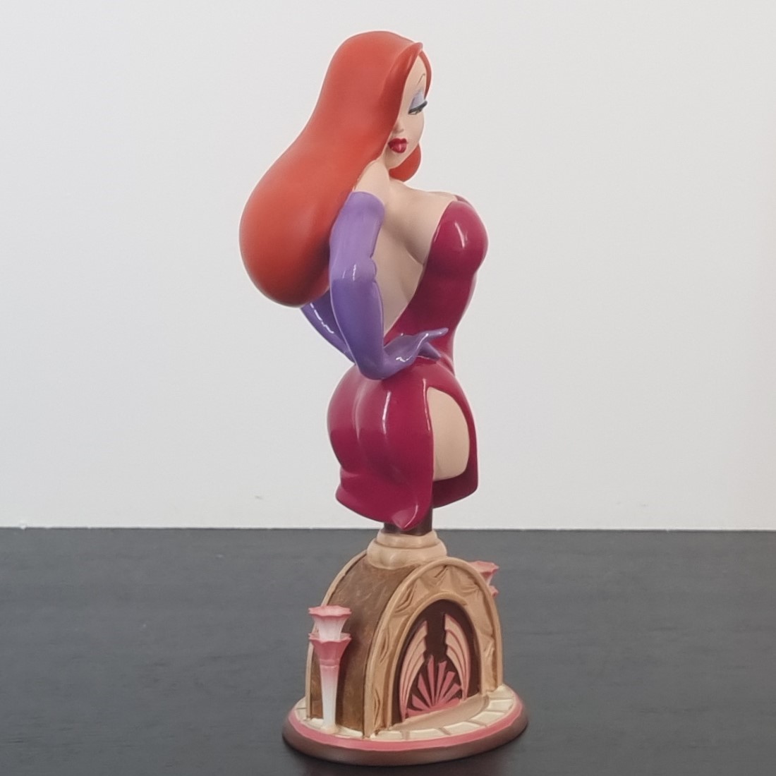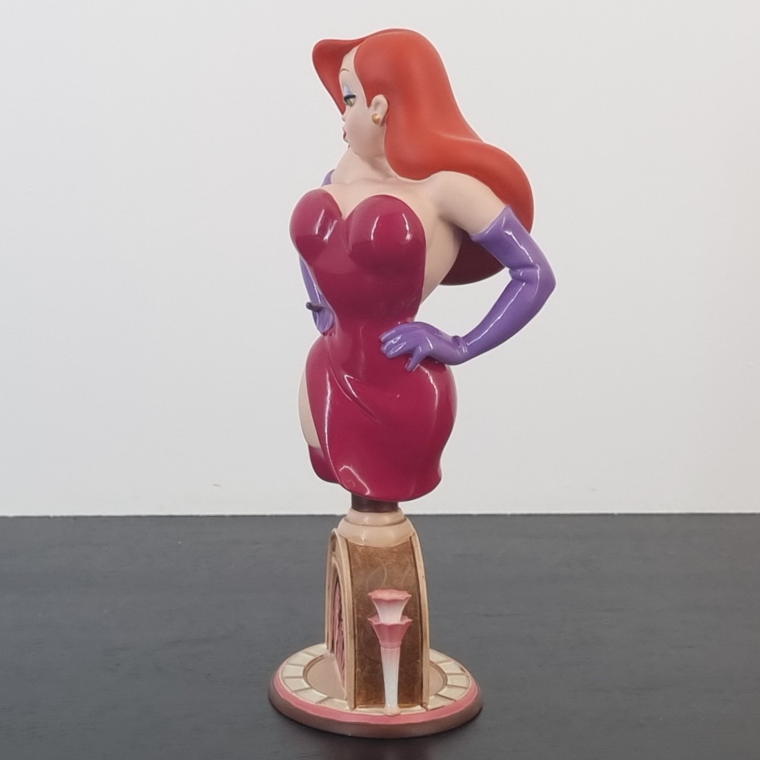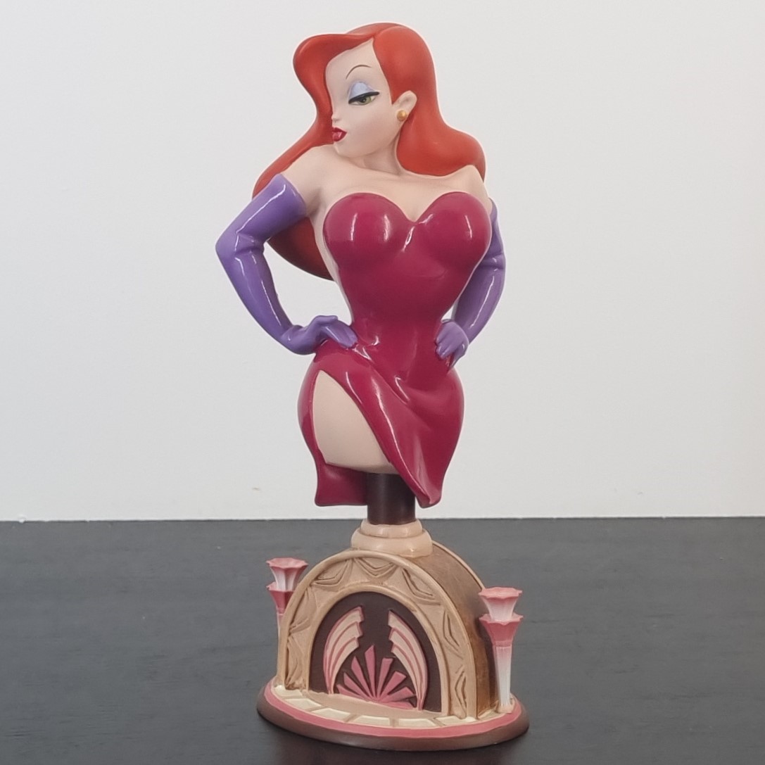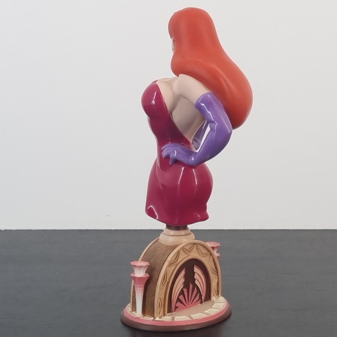 This unique bust from Jessica Rabbit of Who Framed Roger Rabbit was sculpted by Ruben Procopio under Walt Disney’s license. It was taken in production by Enesco for their Grand Jester collection. Dates back to 2009. Made from durable resin, it remains in excellent condition. Elevate your collection with the alluring bust of Jessica Rabbit! This stunning piece captures Jessica’s iconic glamour, with her striking pose and mesmerizing gaze. The exquisite details and vibrant colors bring her character to life, making it a must-have for any fan. Perfect for display, this bust adds a touch of sophistication and Hollywood charm to any space.