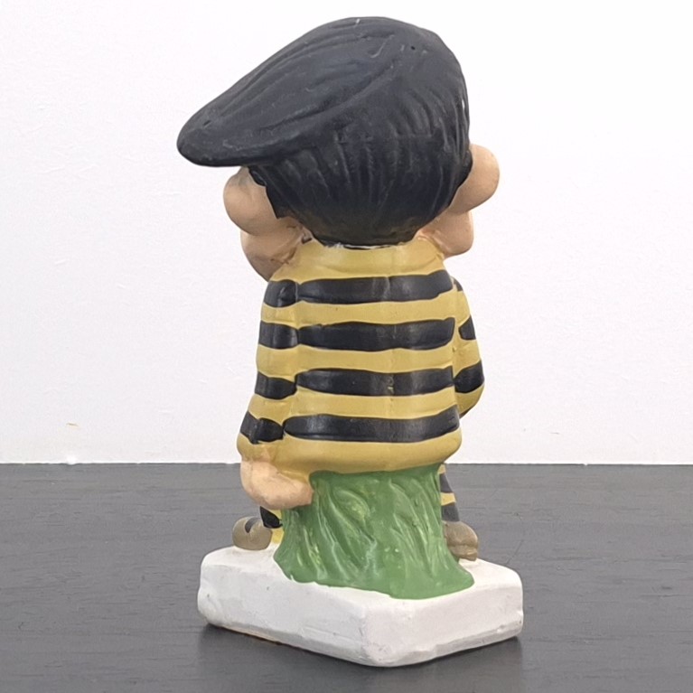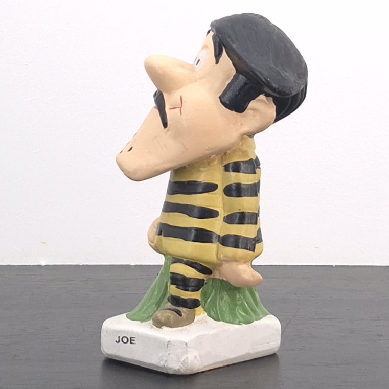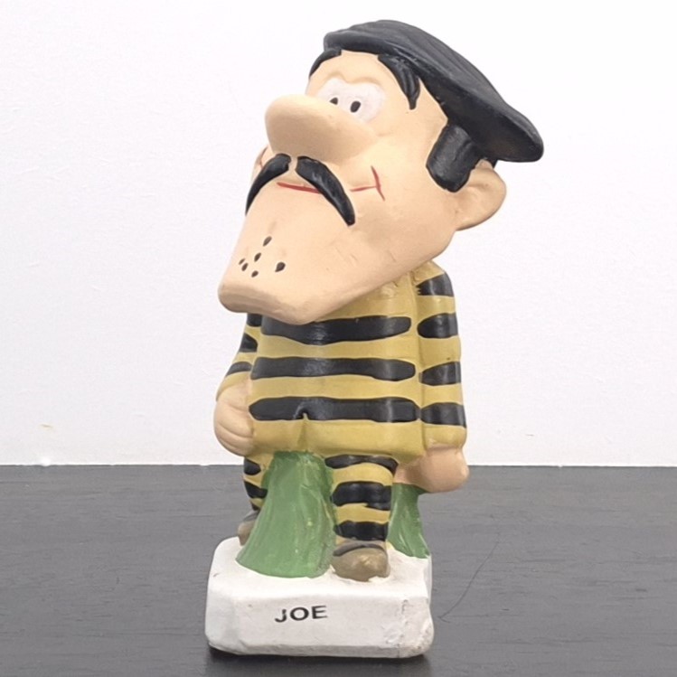 This statue from Joe Dalton was produced by Lucky Luke Licensing. Dates back to 1997. Crafted from durable ceramic, it remains in very good condition. Add a dash of mischief to your collection with this intricately detailed statue of Joe Dalton. Depicting him taking a stroll, this statue captures his fiery personality and roguish charm. Perfect for fans of the notorious Dalton brothers, this piece brings a touch of Western flair and nostalgia to any display. Celebrate the infamous outlaw with this striking addition to your home decor!