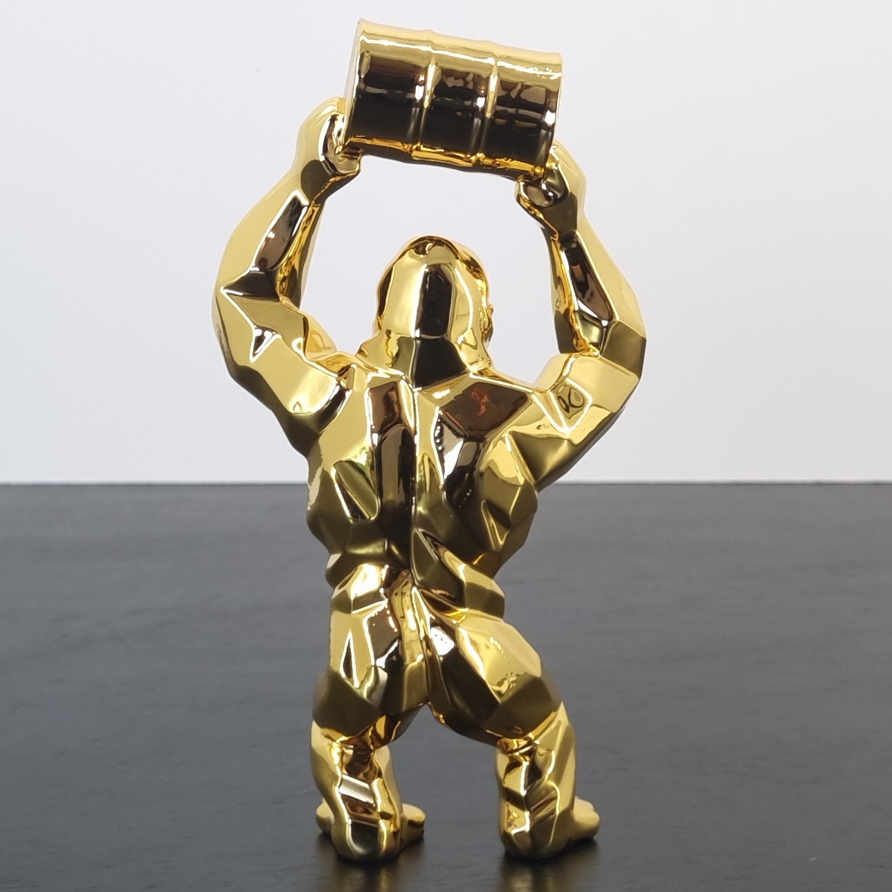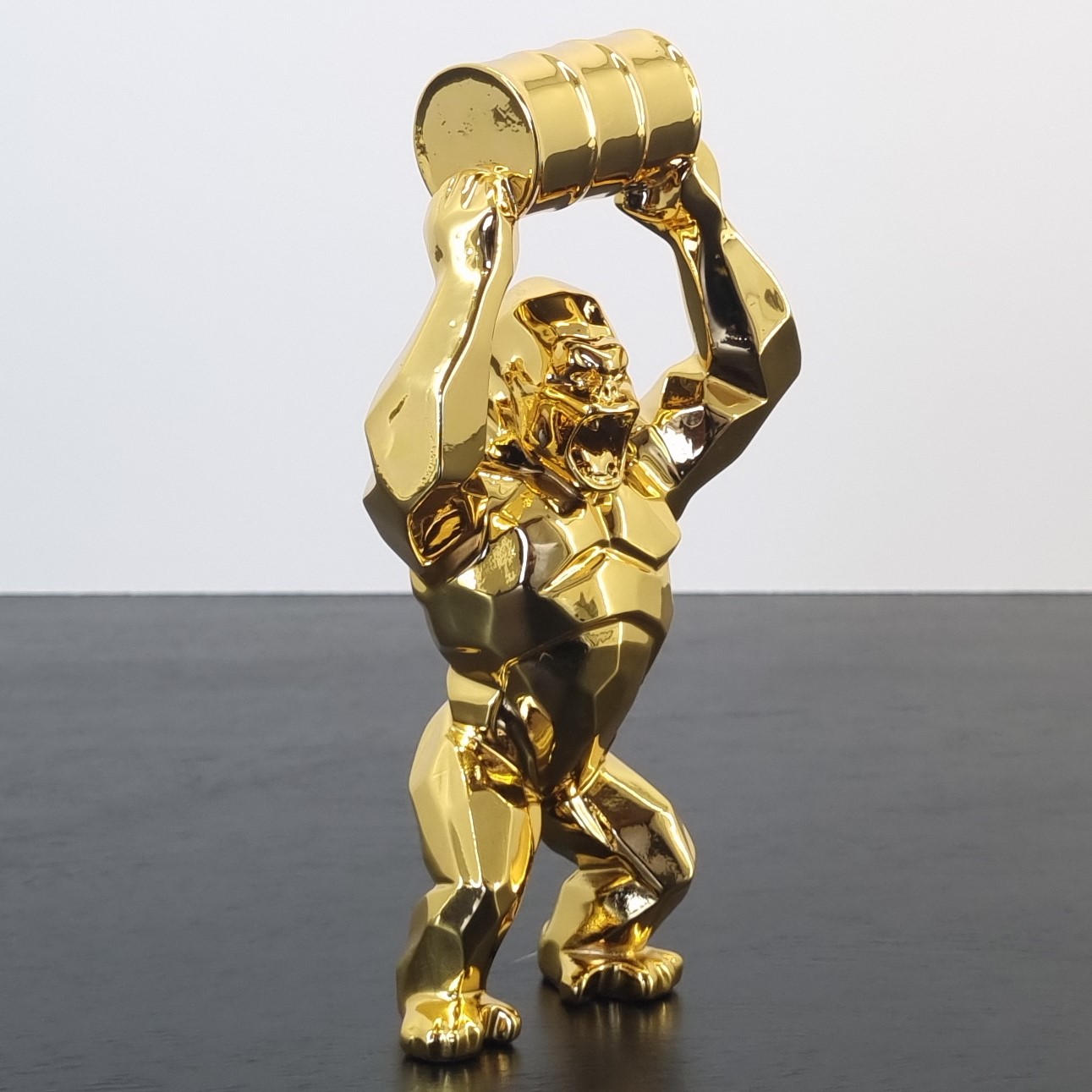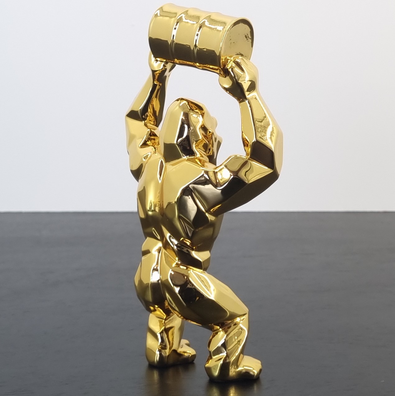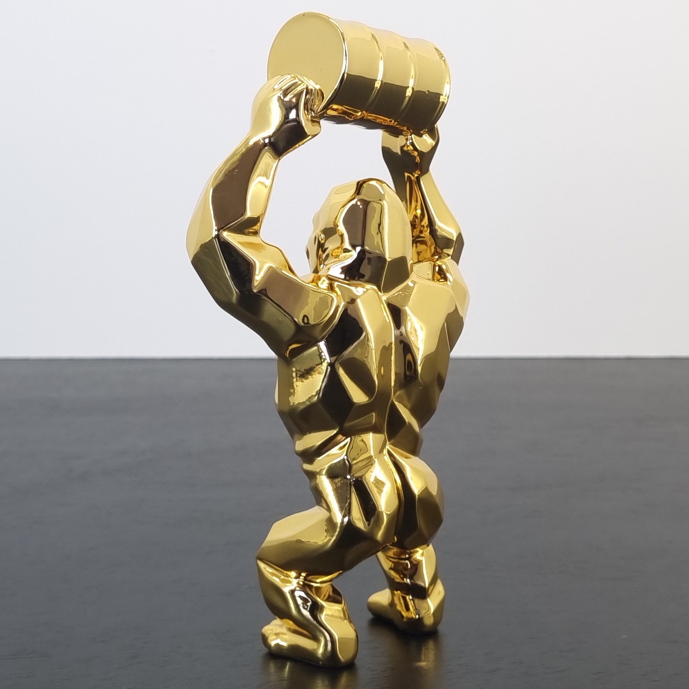 This unique sculpture from Kong was sculpted by Richard Orlinski. Dates back to 2022. Experience the raw energy of the Richard Orlinski Gold Kong Spirit Statue, where the might of Kong is immortalized in gold. With an oil drum triumphantly hoisted above his head, this statue is a powerful representation of dominance and strength. Richard Orlinski’s signature style is evident in the detailed craftsmanship, turning this piece into a commanding presence in any room. This gold-colored statue is not just a work of art; it’s a statement of resilience and the indomitable spirit of Kong.