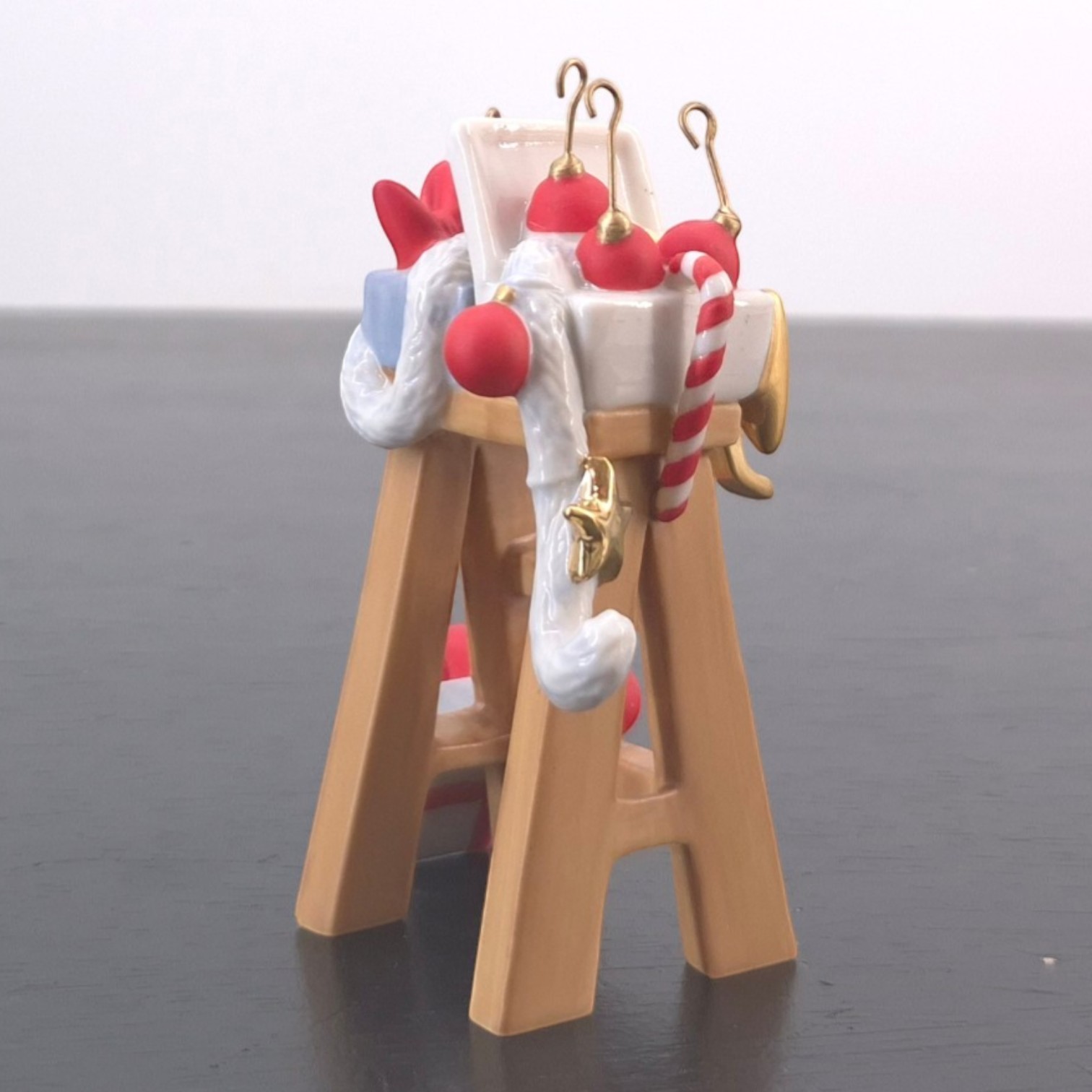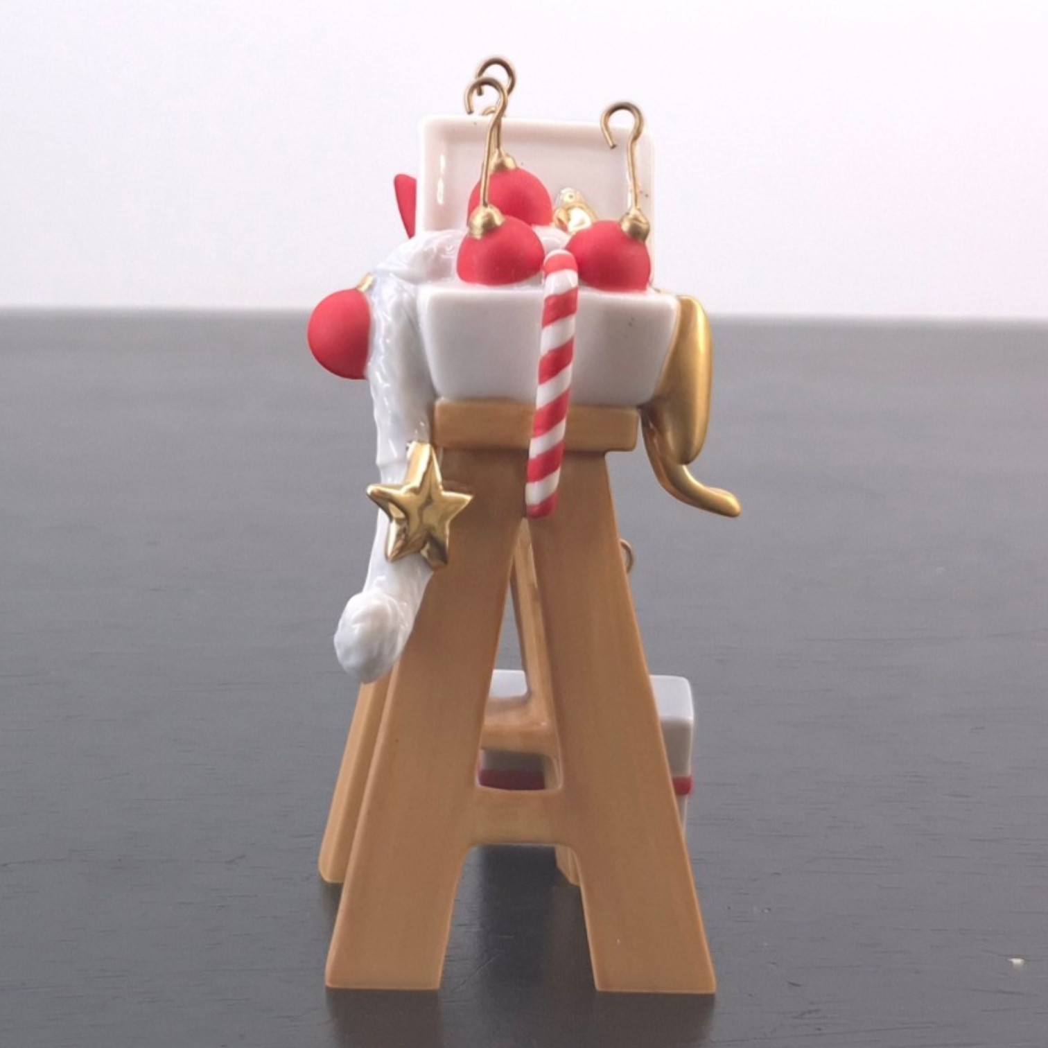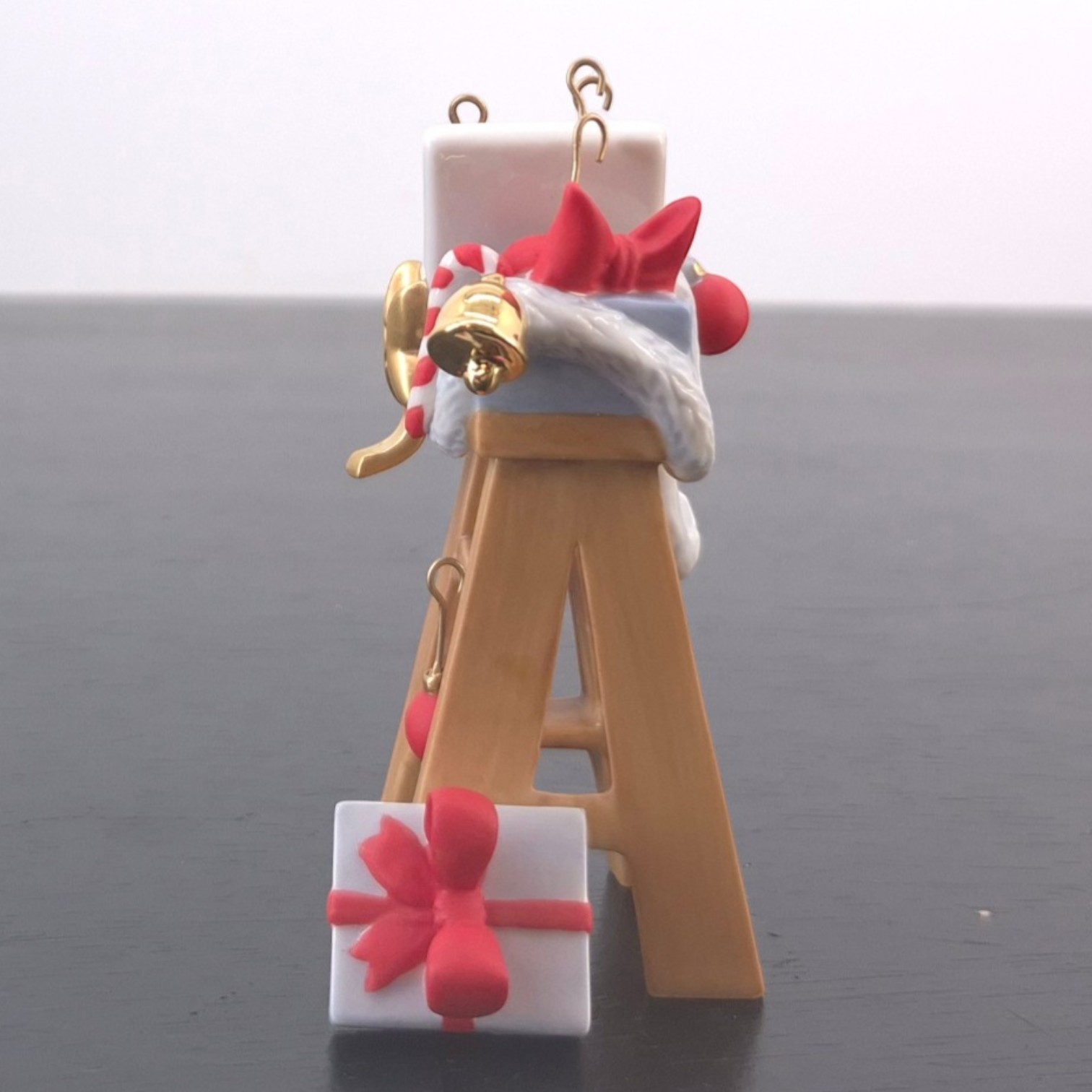 This ladder with Christmas decorations is part of Mickey’s Christmas Eve (Musses Julafton), a festive display set from Stefan Lindahl’s Disney Collection created under Disney’s license and issued by Fyrklövern. Dates back to the 2000s. Crafted from durable porcelain, it remains in excellent condition. This element adds important narrative detail to the full scene. It suggests the decorating process around the Christmas tree and helps connect the character figures with the wider festive setting. On its own, it works as an attractive miniature Christmas collectible; as part of the complete display, it strengthens the storytelling and visual balance of Mickey’s Christmas Eve.