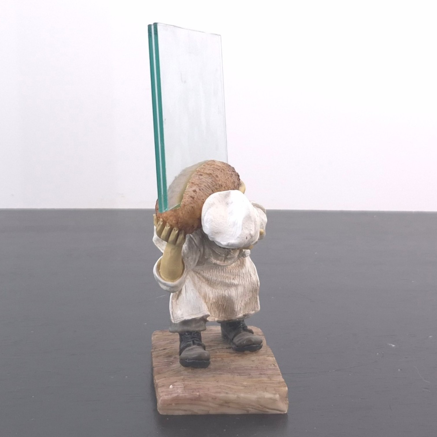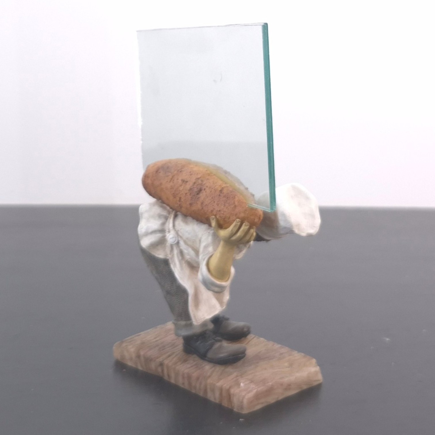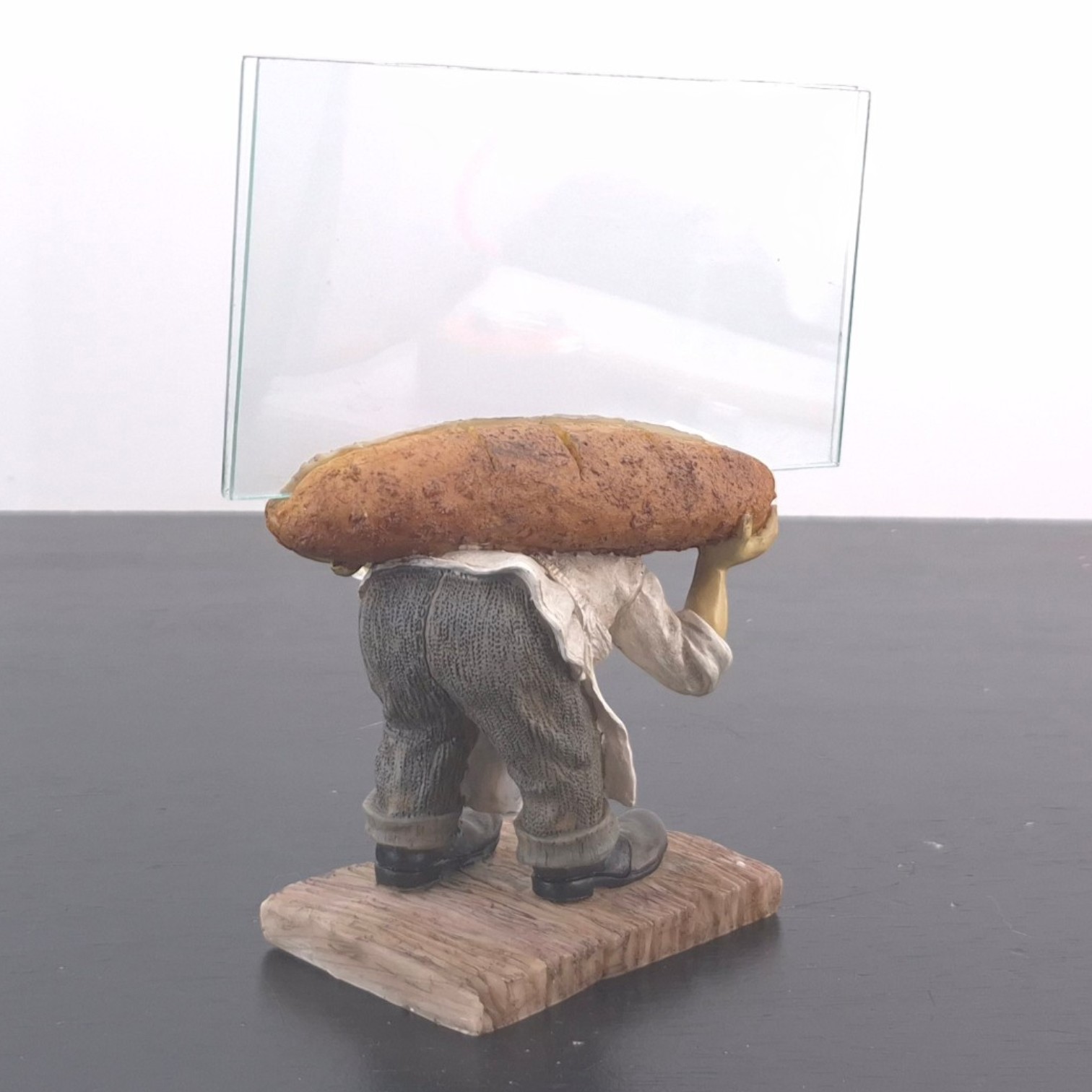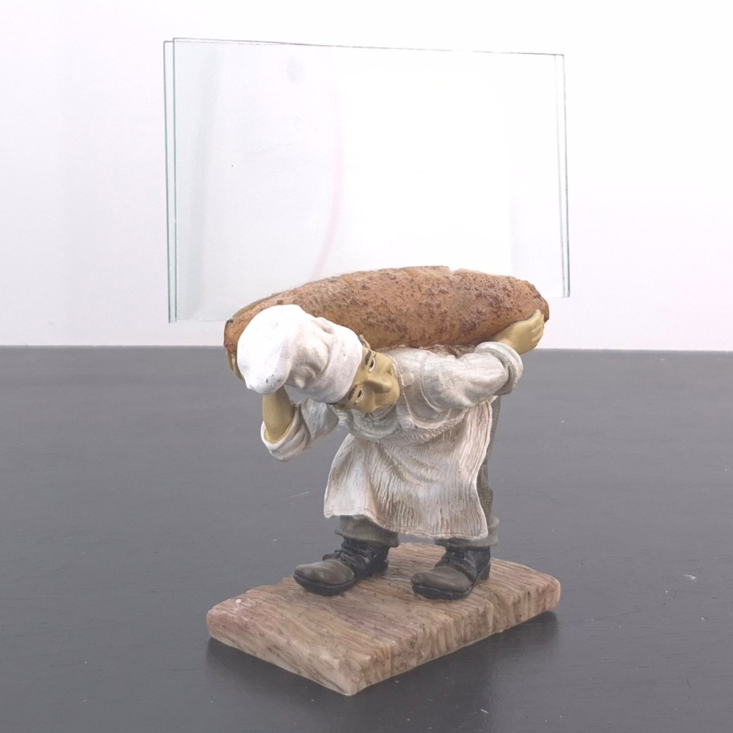 This vintage Stanley Laurel Hardy picture frame was sculpted under license from Larry Harmon Pictures Corporation. Dates back to the 1990s. Made from durable resin, it remains in excellent condition. This Laurel photo frame presents the character in a playful baker-themed scene, carrying a large baguette while leaning forward on a wood-effect base. The clear photo panel behind the figure gives the piece a practical display function while keeping the sculpted character detail as the visual focus. Its humorous pose, warm bakery styling, and compact presentation make it well suited for a character collection, film memorabilia display, or vintage-inspired interior.