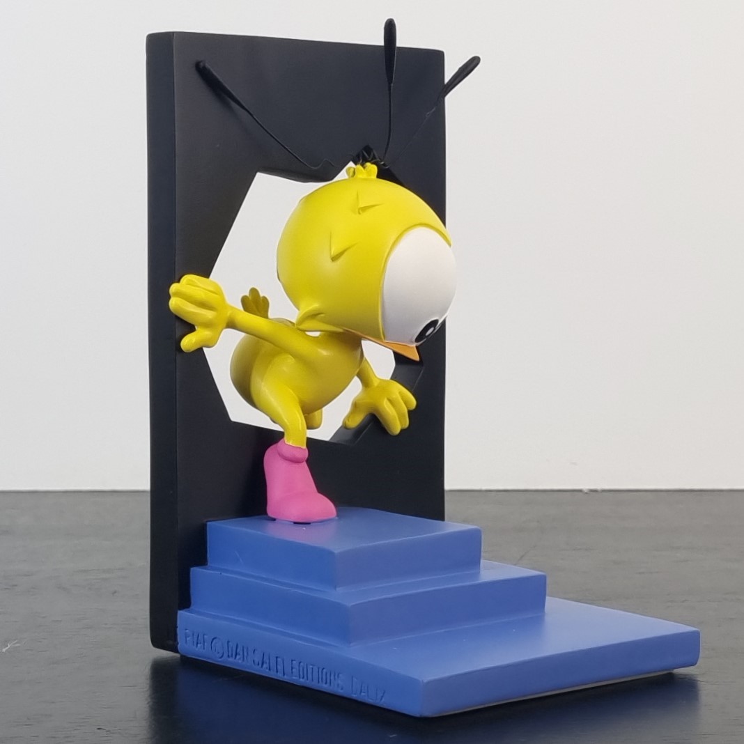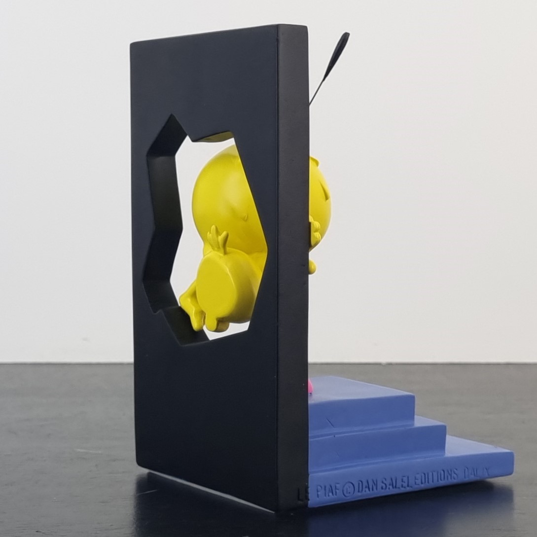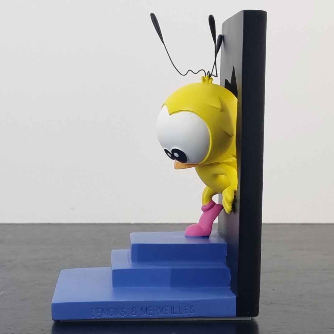 Vintage bookend of Le Piaf, crafted by Demon and Merveilles under Dan Salel’s license. Dates back to 2004. Crafted from durable resin, it remains in excellent condition. Emerging from the breach with wide eyes and careful footing, Le Piaf reveals a world of wonder on your shelf. His curious gaze and precise step evoke a story mid-unfolding, where hesitation meets intrigue. Every detail—from the sculpted feathers to the stone textures—adds depth to his cautious advance. It’s a quiet narrative, told in posture and expression, that transforms function into emotion.
