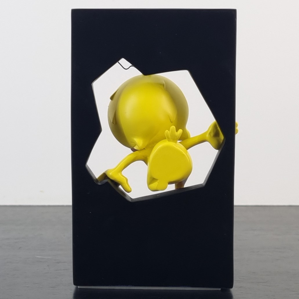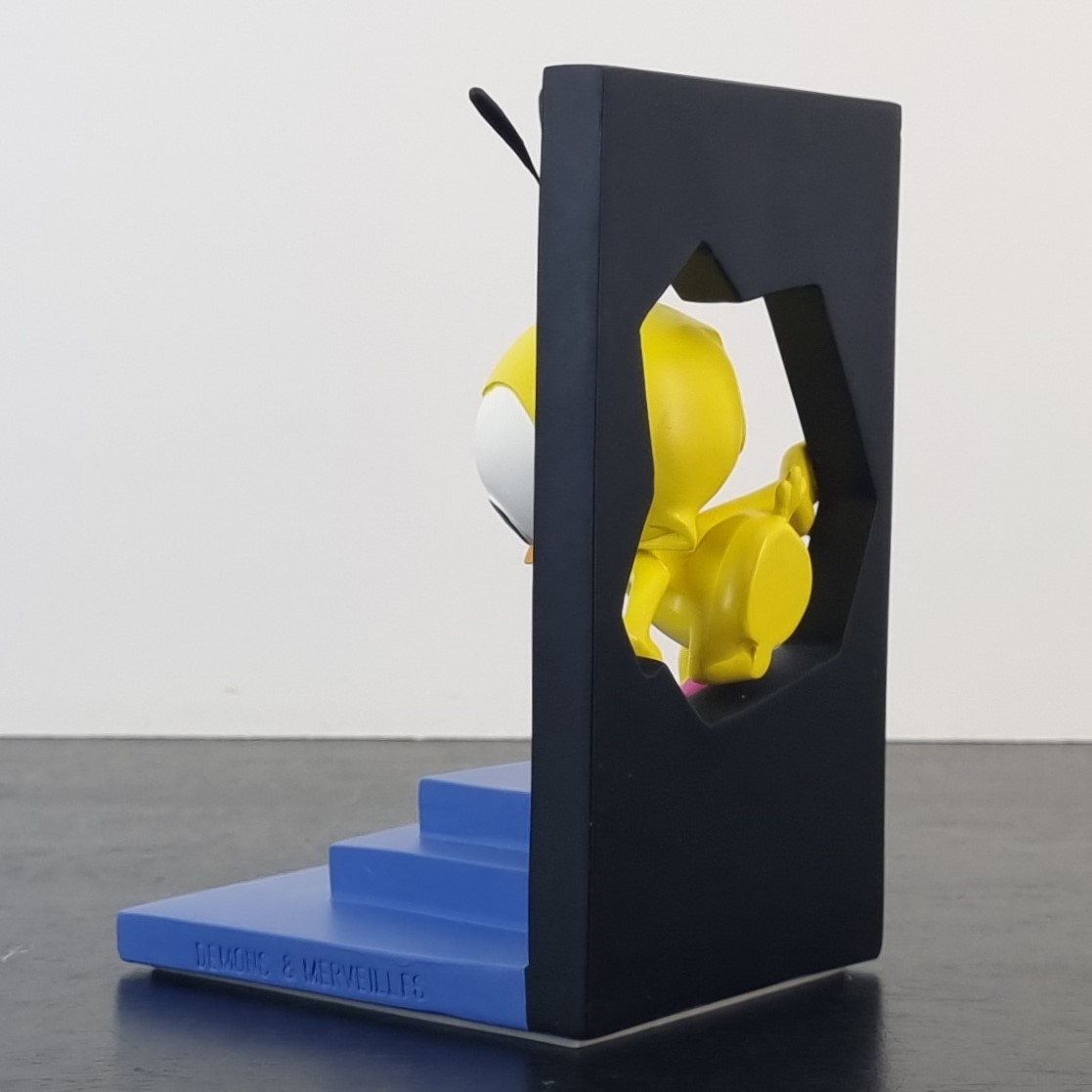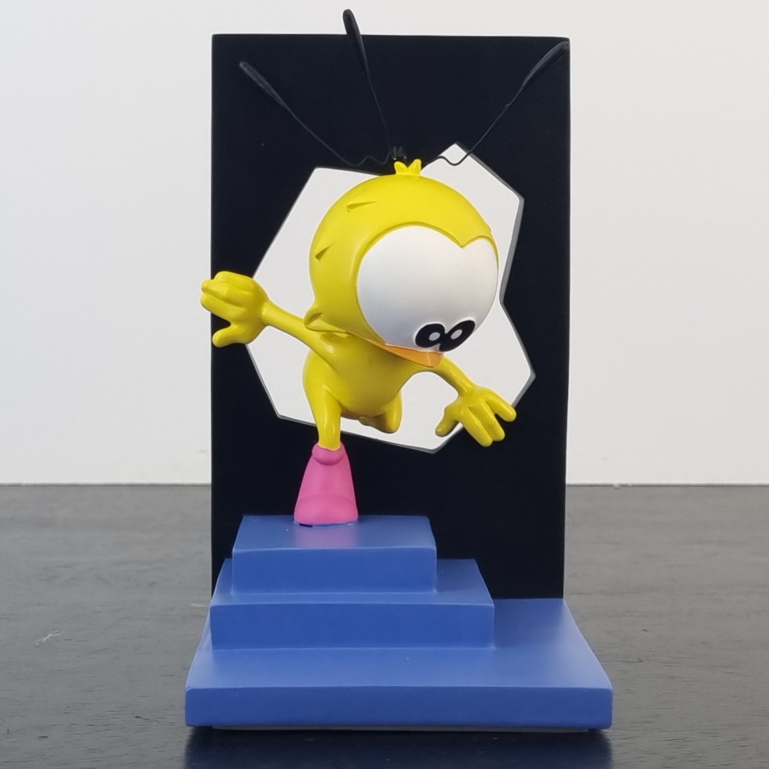 Vintage bookend of Le Piaf, crafted by Demon and Merveilles under Dan Salel’s license. Dates back to 2004. Crafted from durable resin, it remains in excellent condition. Emerging from the breach with wide eyes and careful footing, Le Piaf reveals a world of wonder on your shelf. His curious gaze and precise step evoke a story mid-unfolding, where hesitation meets intrigue. Every detail—from the sculpted feathers to the stone textures—adds depth to his cautious advance. It’s a quiet narrative, told in posture and expression, that transforms function into emotion.