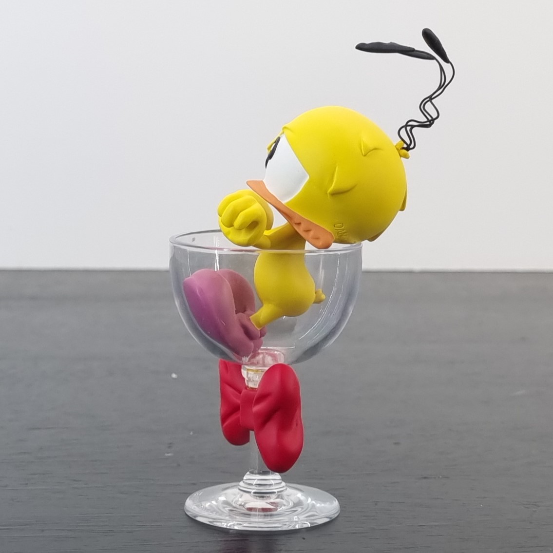 A vintage figurine of Le Piaf, crafted by Demons and Merveilles under Dan Salel’s license. Dates back to 2003. Made from durable resin, it remains in excellent condition. Le Piaf is kicking back, totally sloshed, in that glass!