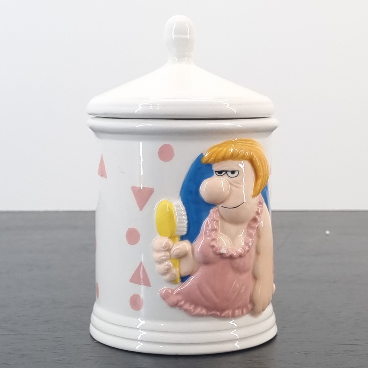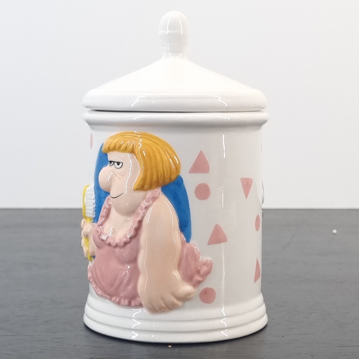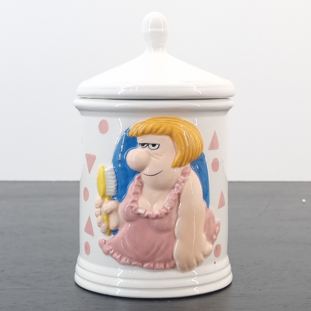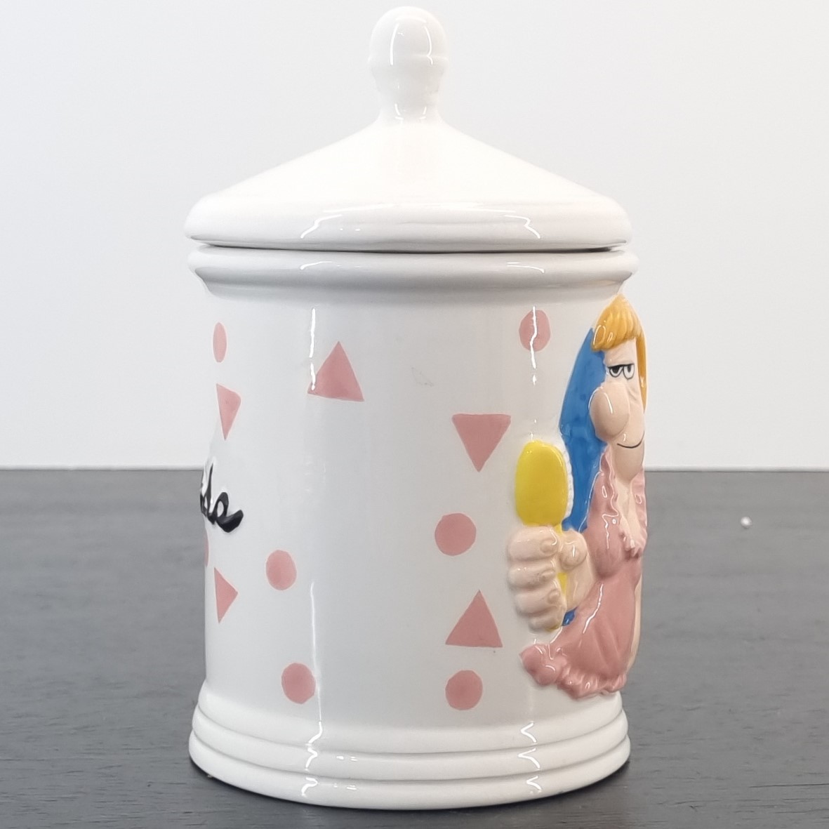 Vintage storage jar featuring Mrs. Les Bidochons, produced by Tropico Diffusion.