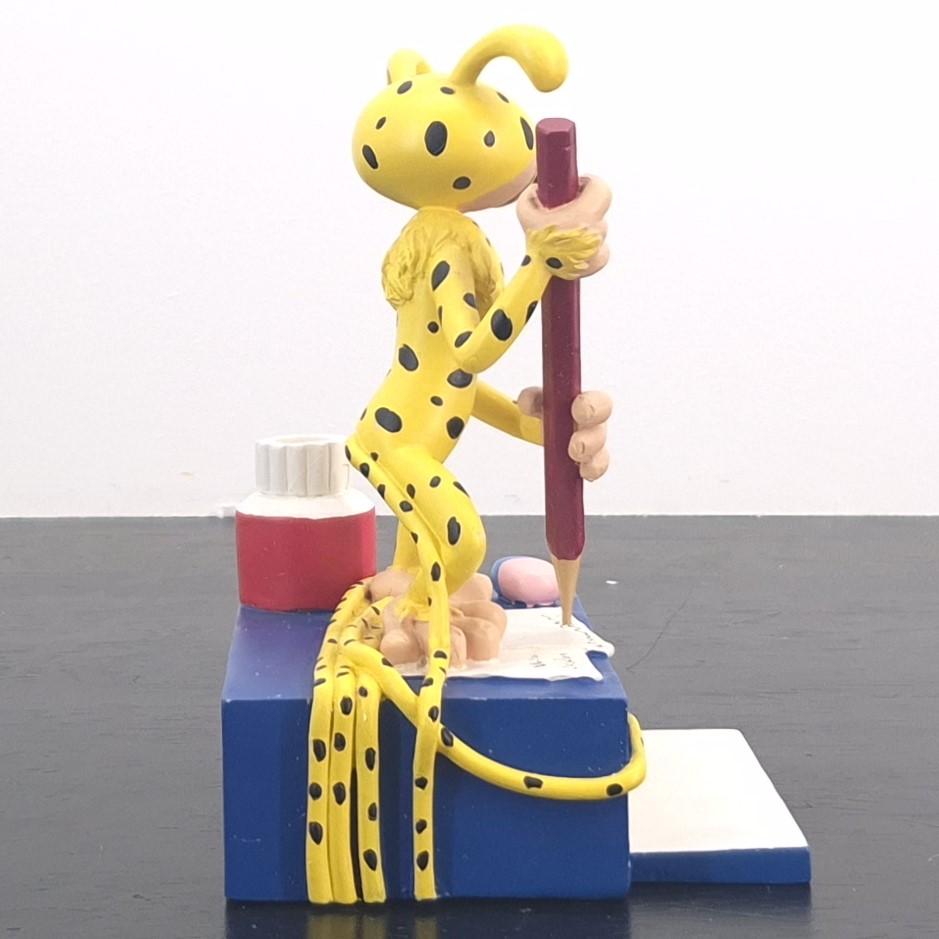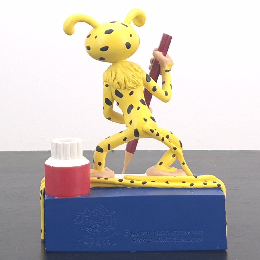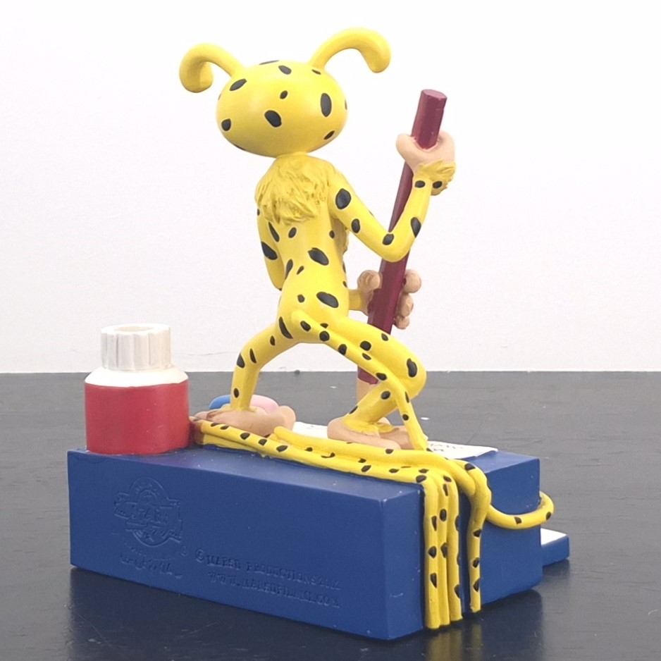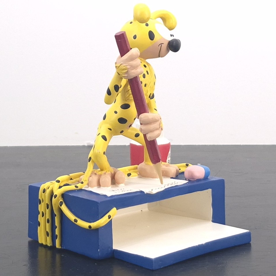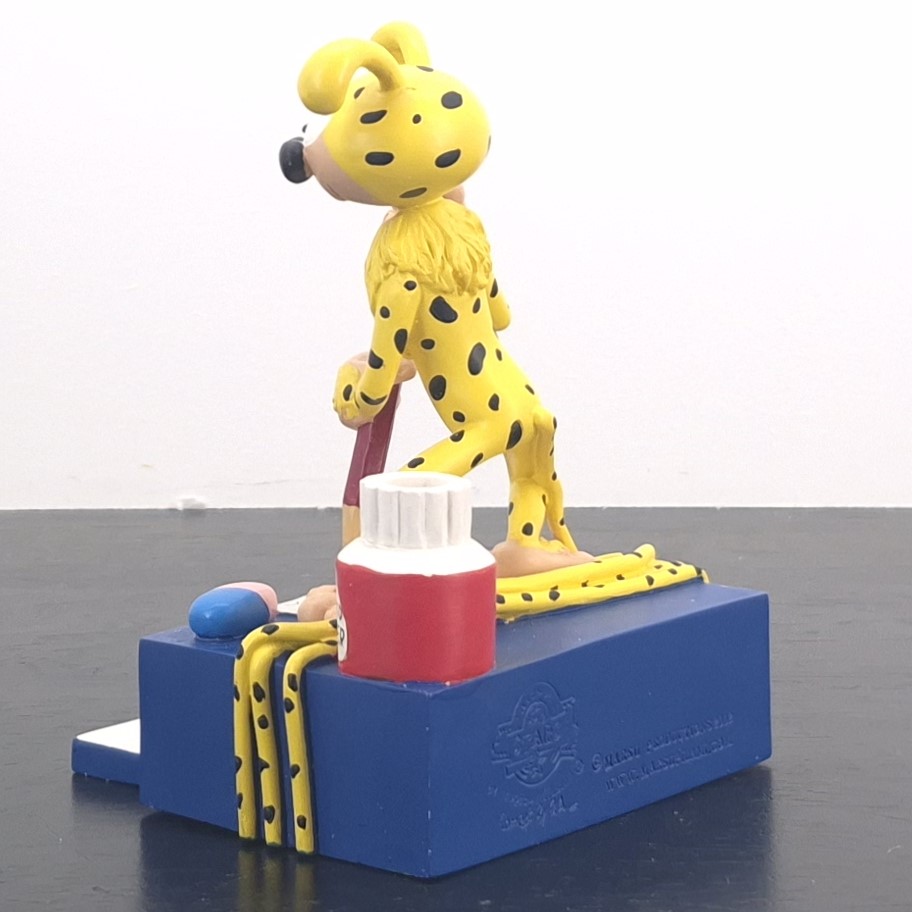 Vintage pen and paper tray of Marsupilami, crafted by Tropico Diffusion under Mediatoon Licensing’s license. Part of Tropico Diffusion’s Avenue of the Stars collection. Dates back to 2002. Crafted from durable resin, it remains in very good condition. Featuring Marsupilami atop a notes holder, his tail elegantly wrapped around it as he sketches with a pencil. A quirky touch of detail includes a nearby pot of liquid paper for your convenience and a designated spot to hold your favorite pen. A whimsical and functional desk companion for any stationery enthusiast!