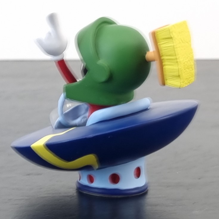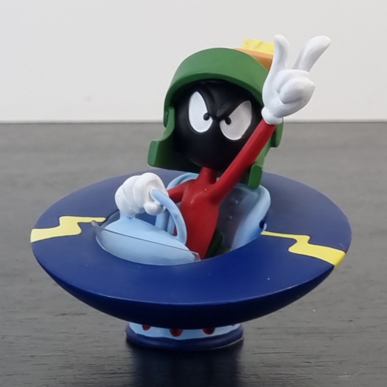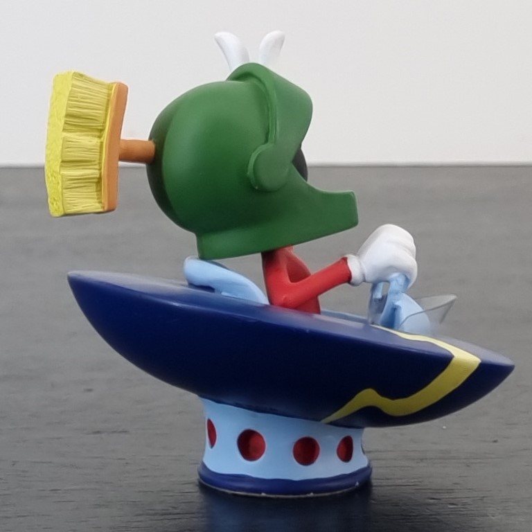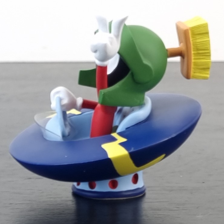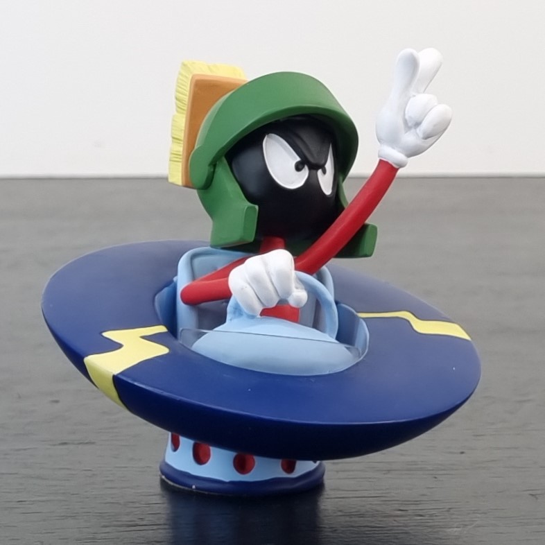 Vintage figurine of Marvin the Martian, crafted by Demons and Merveilles under Warner Bros.’ license. Dates back to 1999. Crafted from durable resin, it remains in excellent condition. Marvin the Martian is zooming around in his UFO, pointing upwards with a wicked grin, plotting his next mischievous adventure across the galaxy!