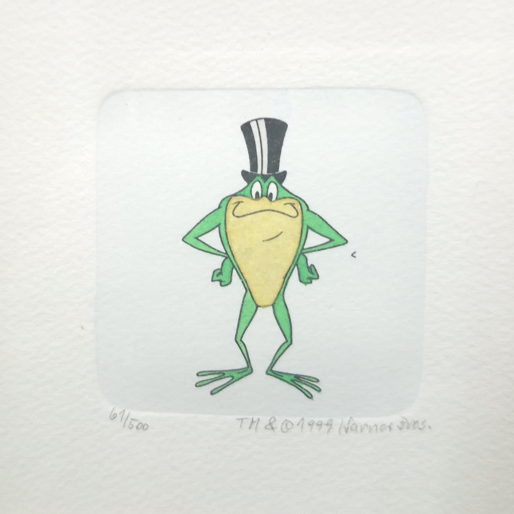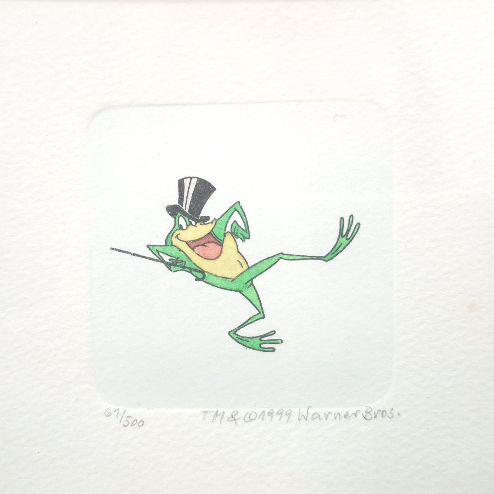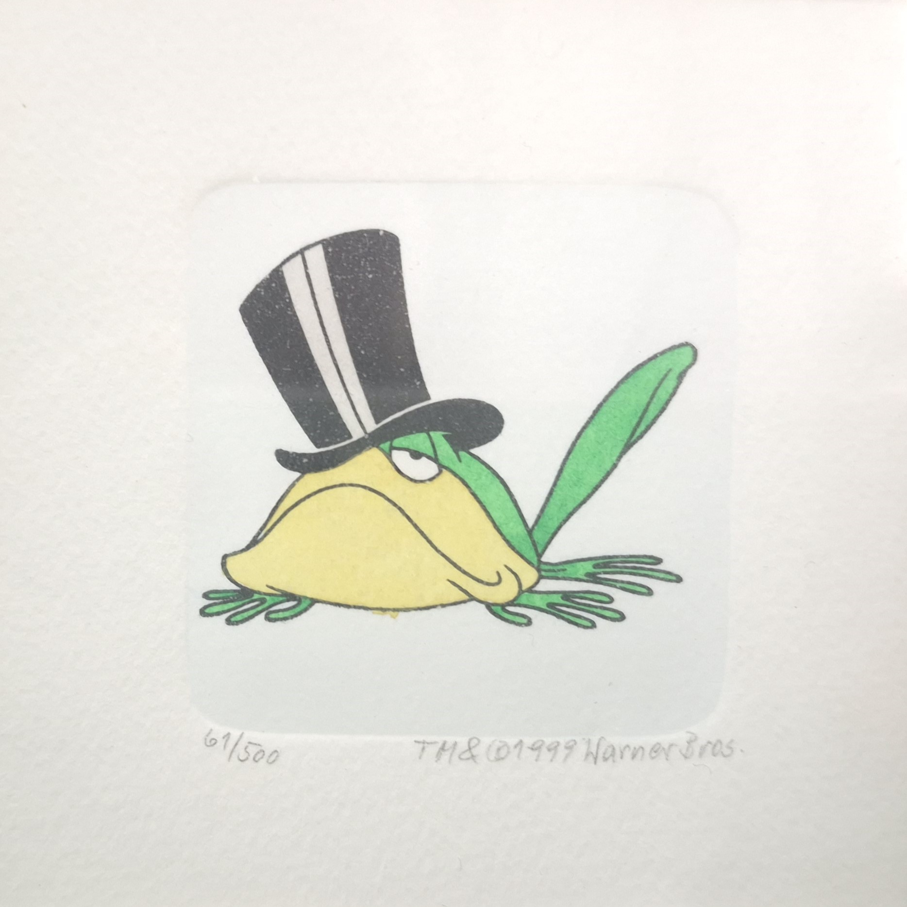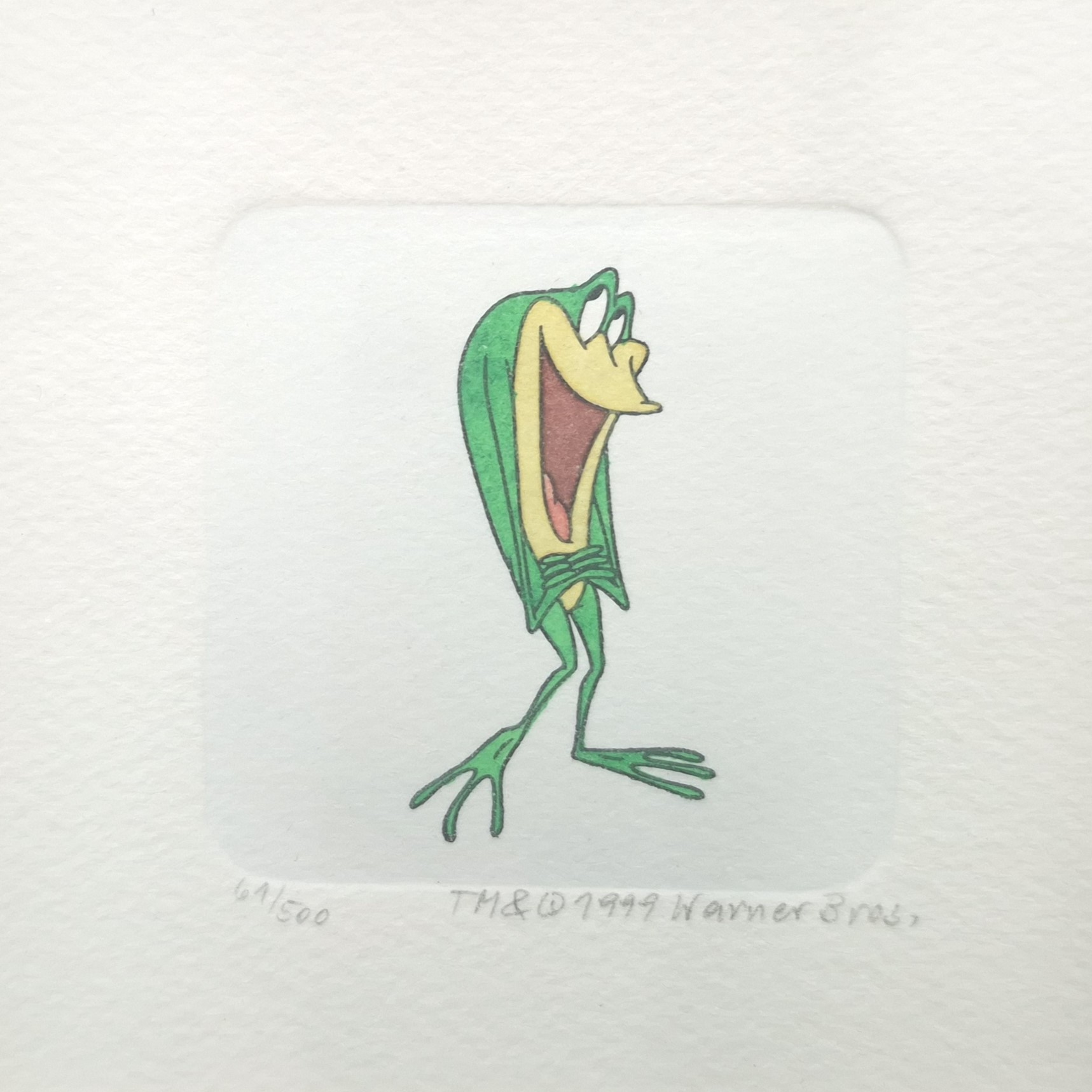 Vintage etchings of Michigan J. Frog, crafted by Sowa and Reiser under Warner Bros.’ license. Dates back to 1999. Crafted from durable paper, it remains in excellent condition. Celebrate a cult classic with this rare framed collection of 9 limited edition handmade etchings of Michigan J. Frog! Each etching showcases the famously elusive frog in a different pose—top hat, cane, and all—capturing his theatrical charm and timeless swagger. Limited to just 500 pieces worldwide per design, these handcrafted prints are a unique tribute to one of animation’s most iconic one-hit wonders. Elegantly presented in a single frame, it’s the perfect blend of vintage flair and collectible artistry. Hello, my baby—this piece is ready to steal the show on your wall!