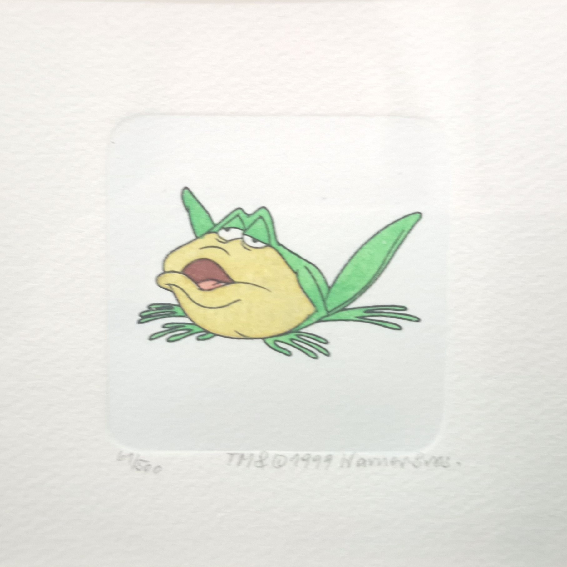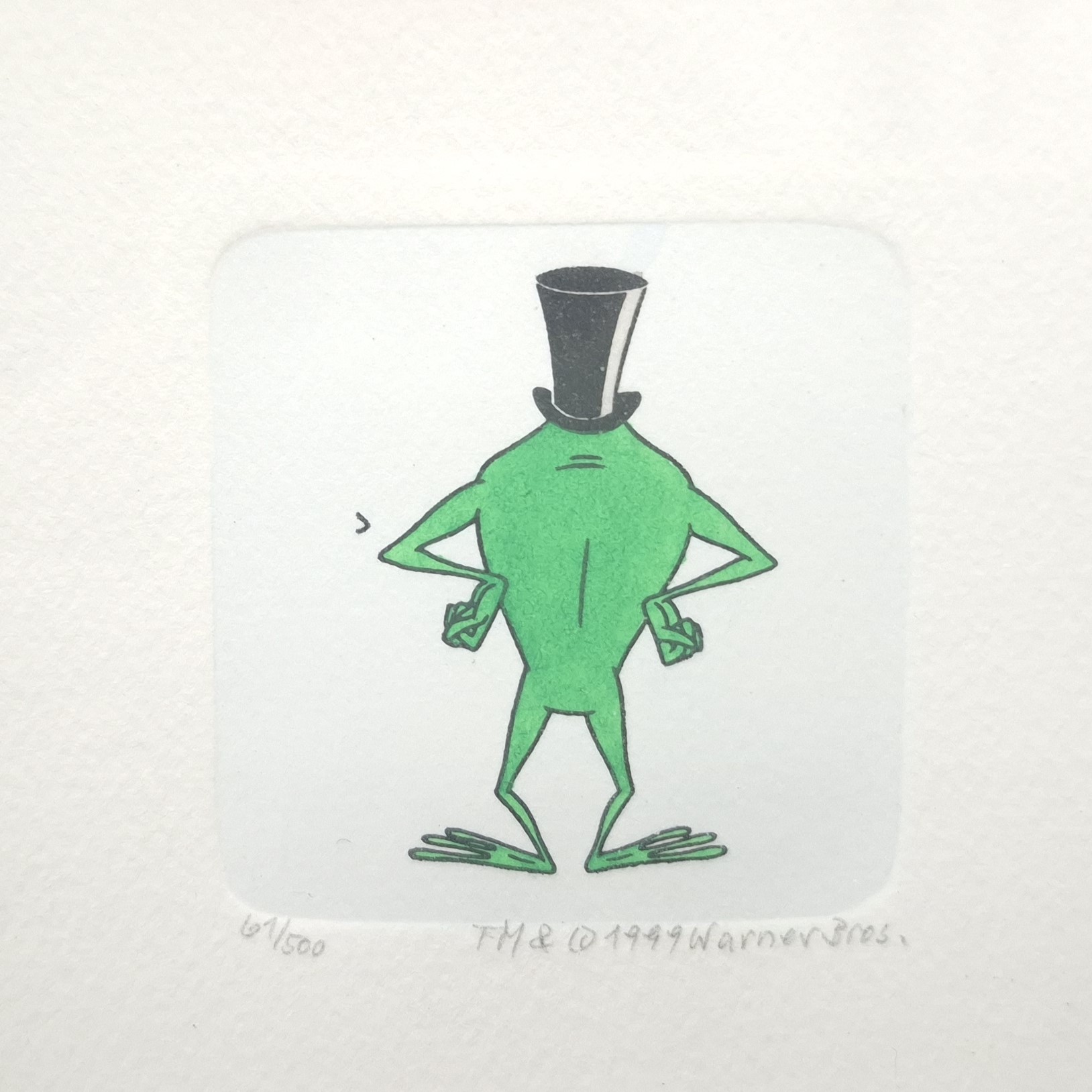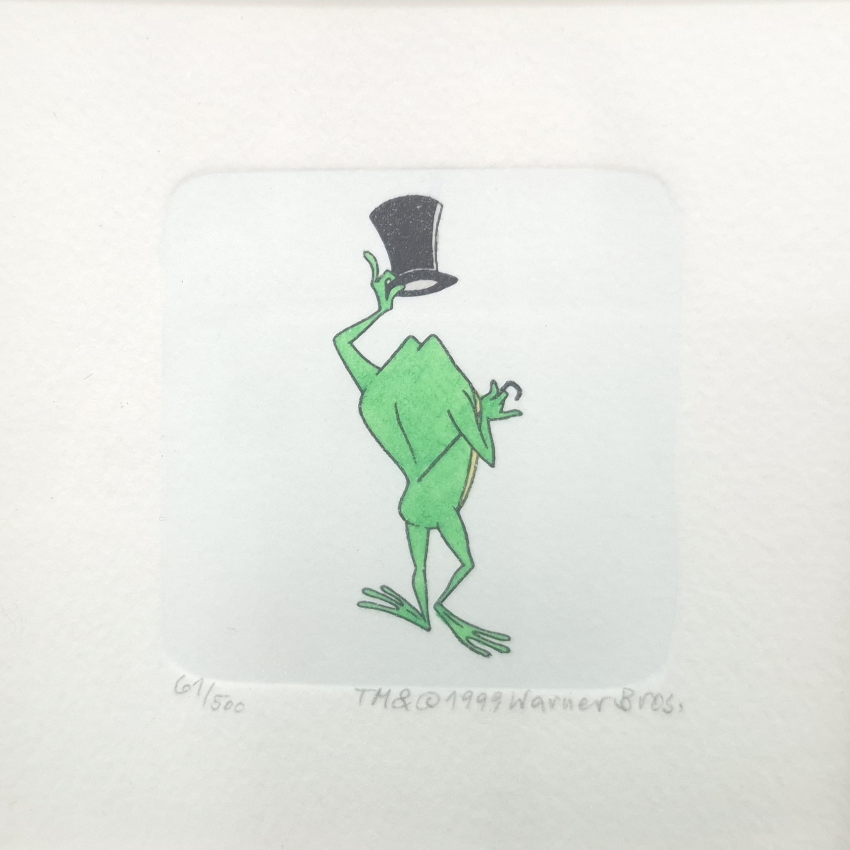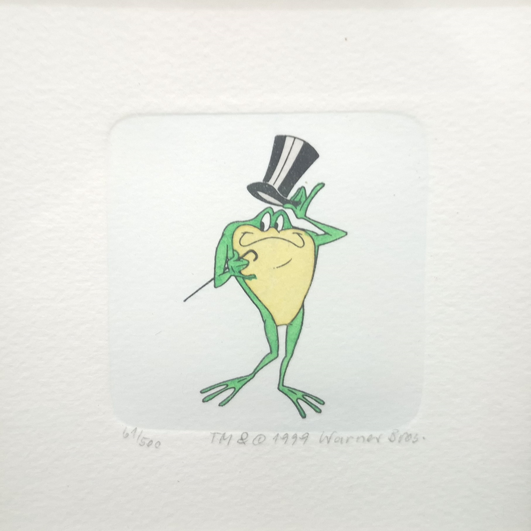Vintage etchings of Michigan J. Frog, crafted by Sowa and Reiser under Warner Bros.’ license. Dates back to 1999. Crafted from durable paper, it remains in excellent condition. Celebrate a cult classic with this rare framed collection of 9 limited edition handmade etchings of Michigan J. Frog! Each etching showcases the famously elusive frog in a different pose—top hat, cane, and all—capturing his theatrical charm and timeless swagger. Limited to just 500 pieces worldwide per design, these handcrafted prints are a unique tribute to one of animation’s most iconic one-hit wonders. Elegantly presented in a single frame, it’s the perfect blend of vintage flair and collectible artistry. Hello, my baby—this piece is ready to steal the show on your wall!
