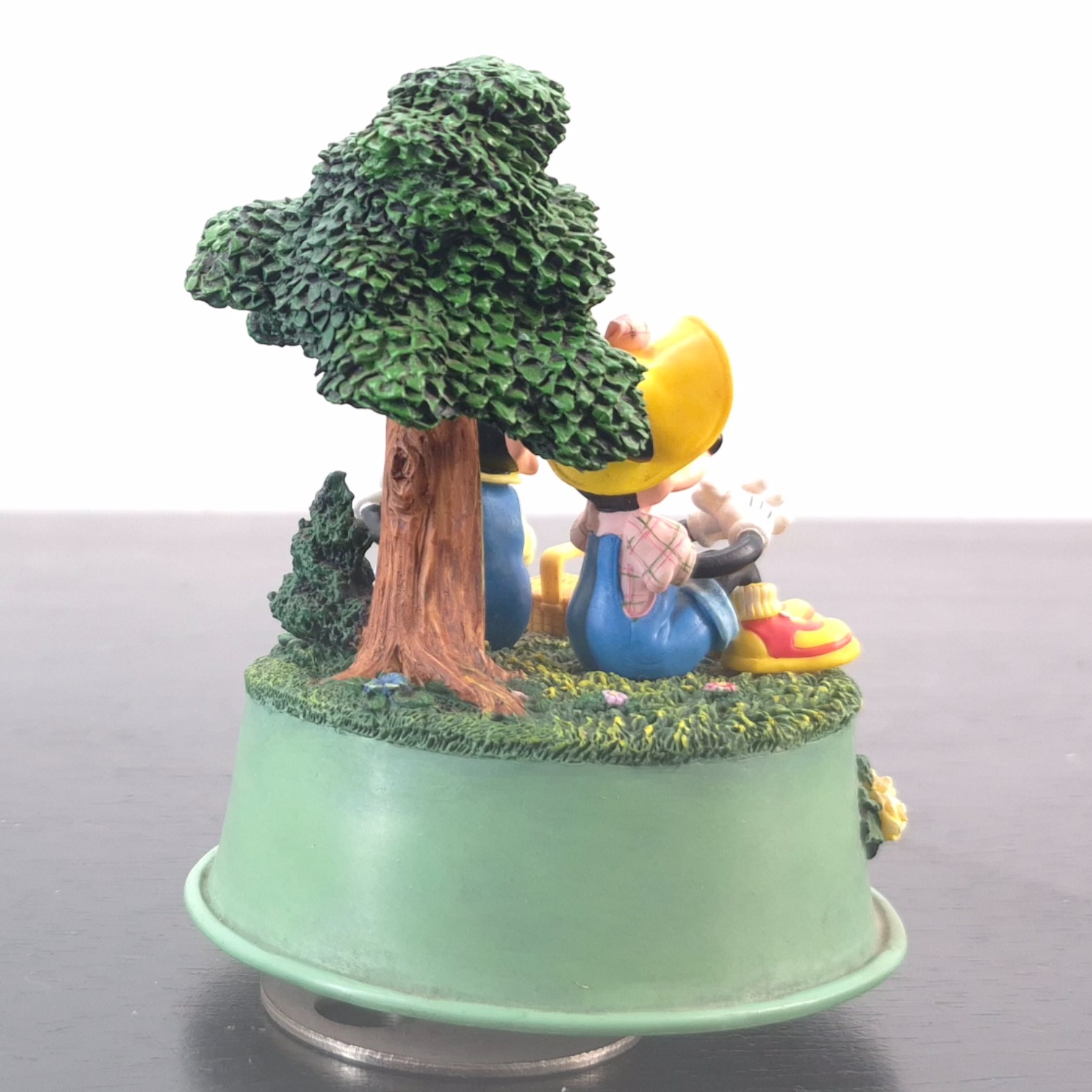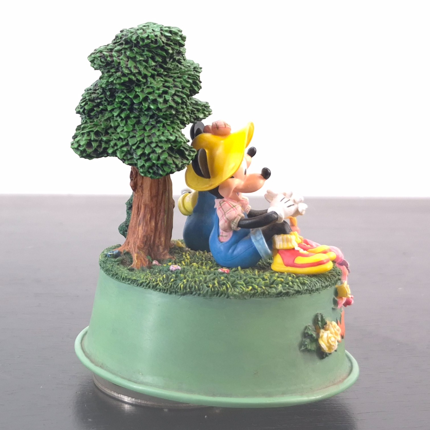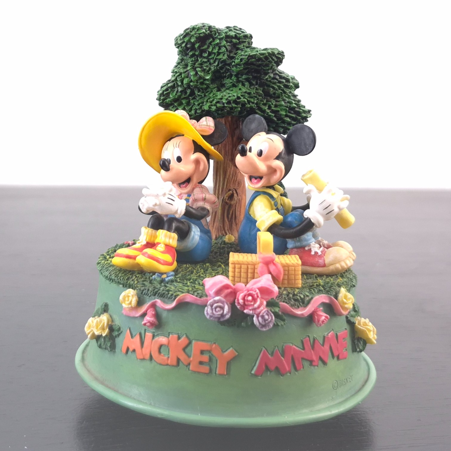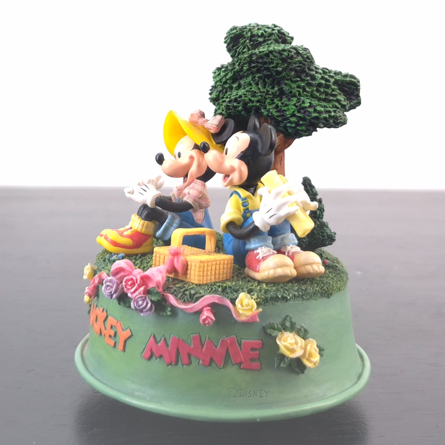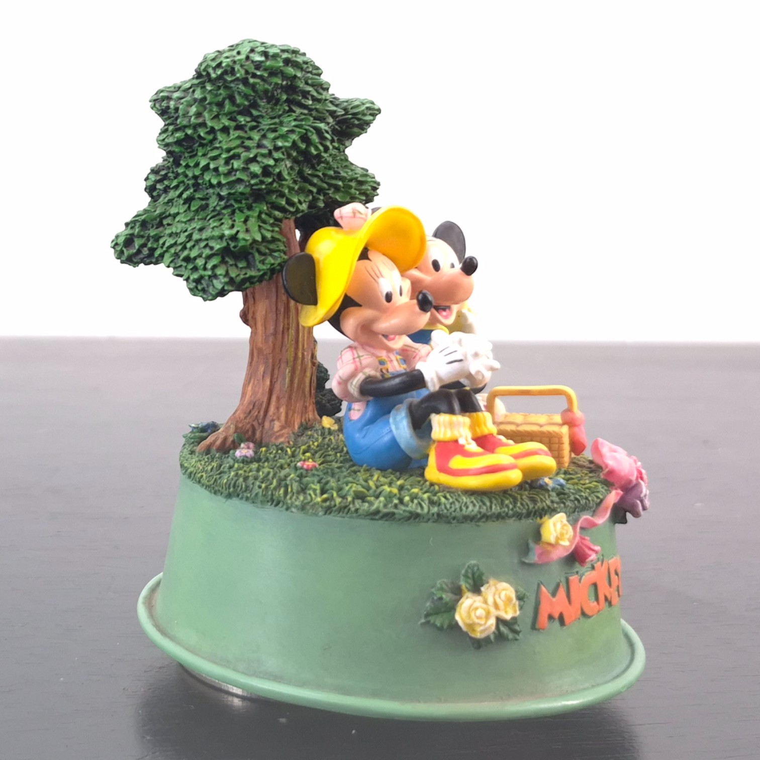 Vintage music box of Mickey Mouse and Minnie Mouse, crafted under Walt Disney’s license. Crafted from durable resin, it remains in excellent condition. Dates back to 1990s. This charming Mickey Mouse and Minnie Mouse music box captures the pair enjoying a cheerful picnic beneath a leafy tree, filled with warmth and nostalgia. Both characters are finely sculpted with bright colors and expressive poses that bring the scene to life. The detailed base, decorated with flowers and the names “Mickey” and “Minnie,” adds a playful storybook feel. When wound, the music box completes the scene with a gentle melody that enhances its sentimental appeal.
