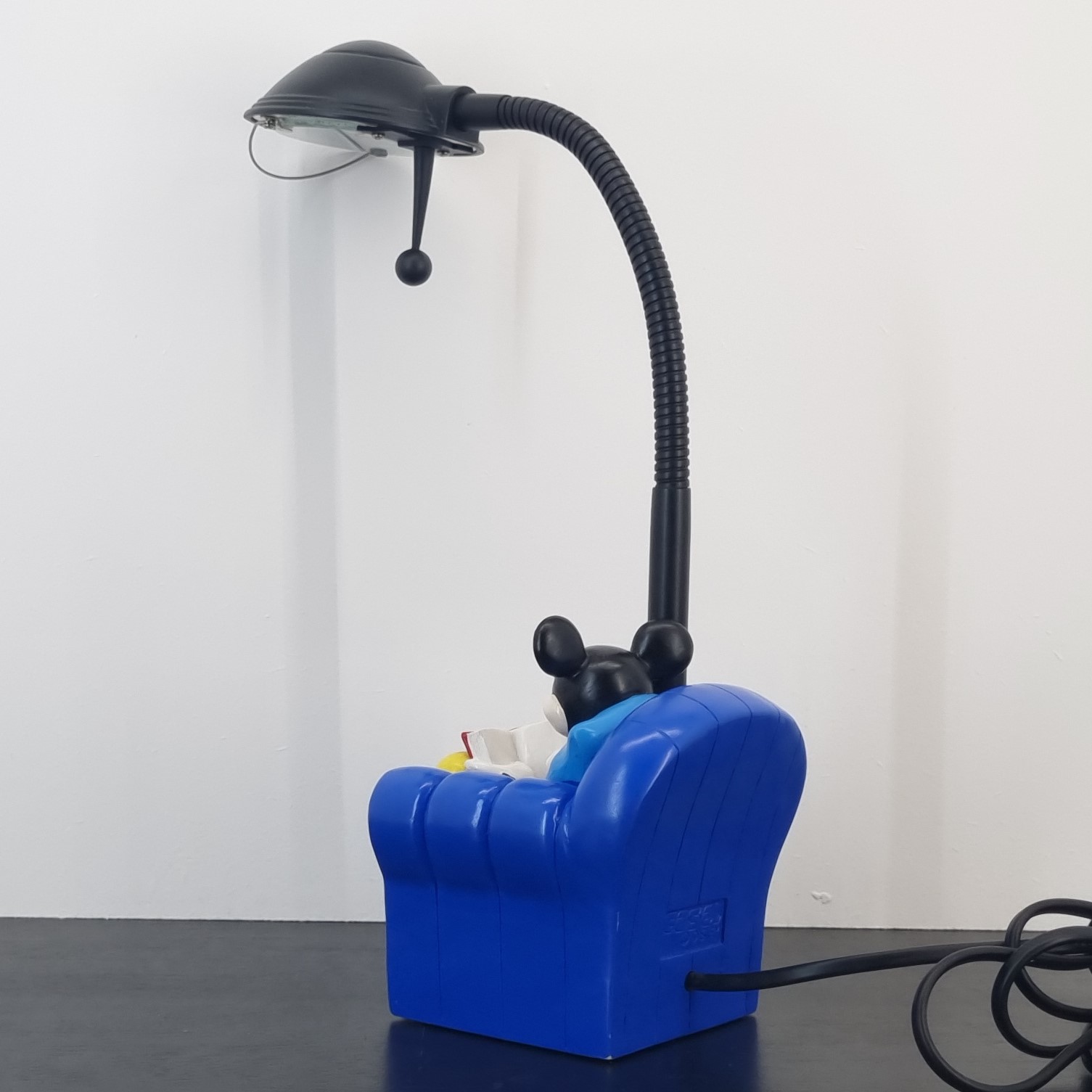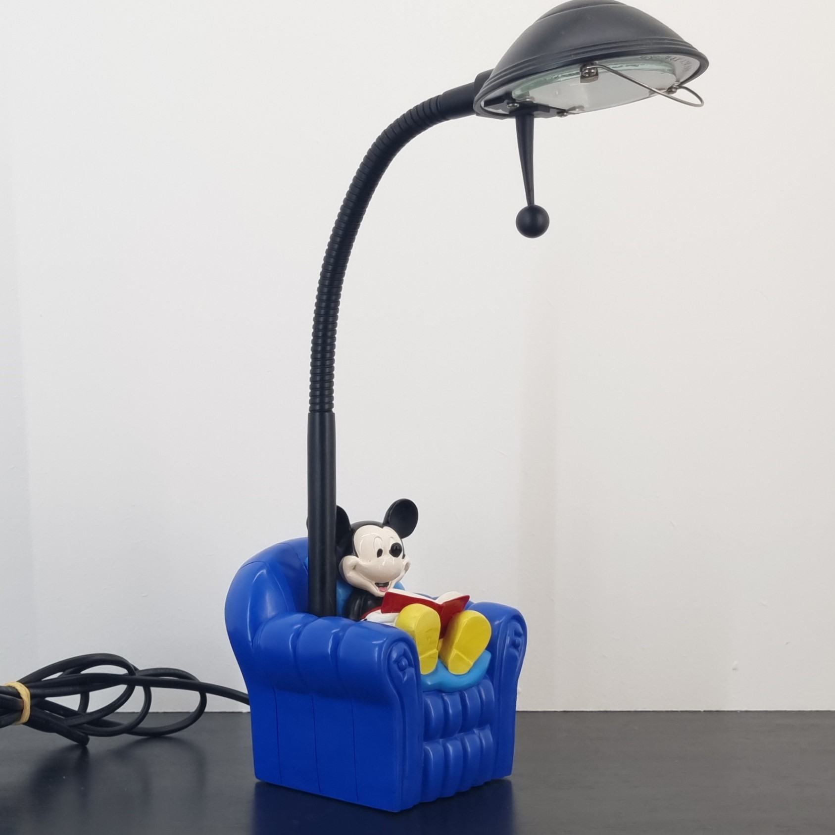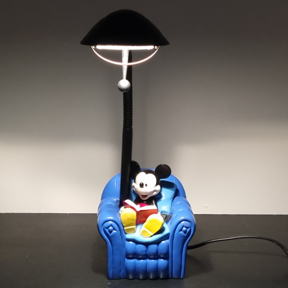 Vintage desk lamp of Mickey Mouse, produced by Casal under Walt Disney’s license. Dates back to the 1990s. Crafted from durable resin, it remains in excellent condition. Illuminate your space with this charming Mickey Mouse desk lamp featuring Mickey reading in a cozy blue armchair. The warm light from the modern black shade creates the perfect atmosphere for desks, nightstands, or reading corners. Its playful yet functional design adds a touch of Disney magic to any room. Ideal for collectors and fans alike, it blends nostalgia with everyday usefulness. A delightful decorative piece that brings instant joy and character to your home.