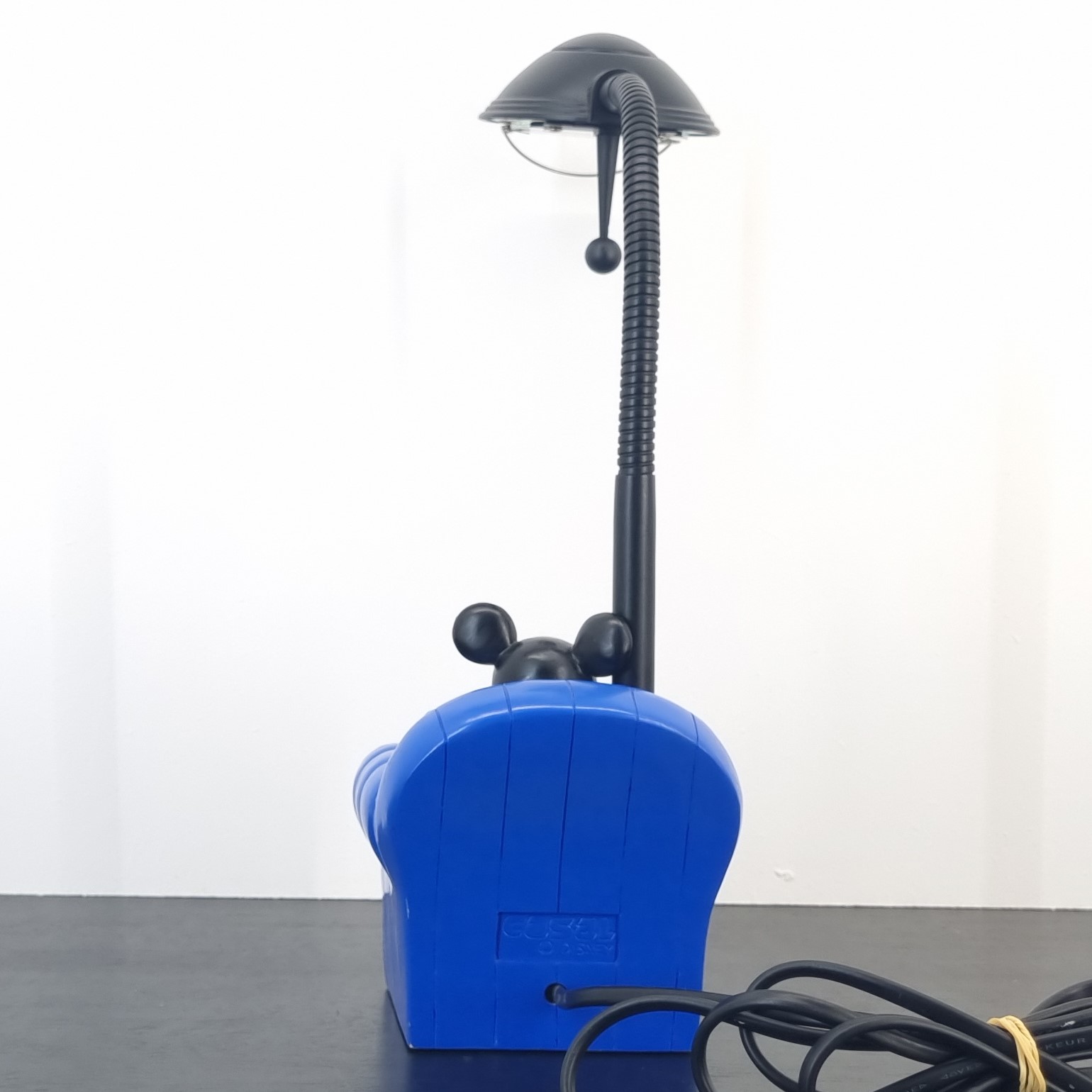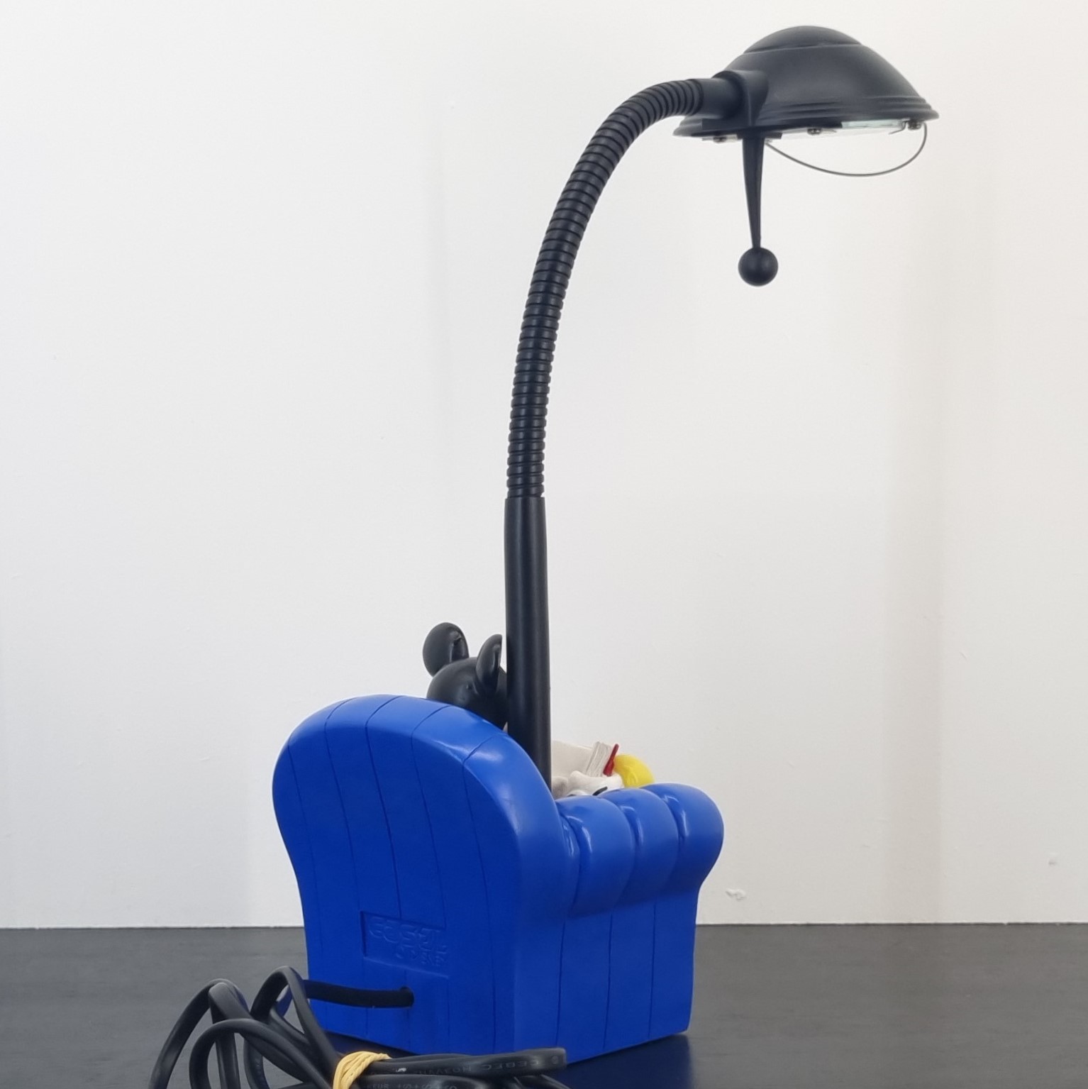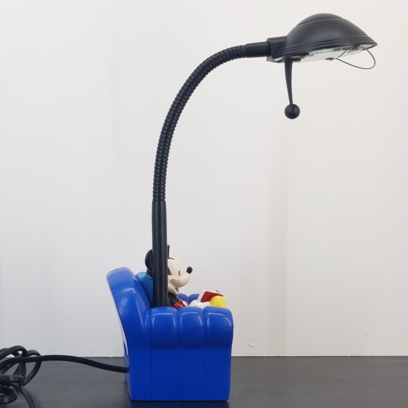 Vintage desk lamp of Mickey Mouse, produced by Casal under Walt Disney’s license. Dates back to the 1990s. Crafted from durable resin, it remains in excellent condition. Illuminate your space with this charming Mickey Mouse desk lamp featuring Mickey reading in a cozy blue armchair. The warm light from the modern black shade creates the perfect atmosphere for desks, nightstands, or reading corners. Its playful yet functional design adds a touch of Disney magic to any room. Ideal for collectors and fans alike, it blends nostalgia with everyday usefulness. A delightful decorative piece that brings instant joy and character to your home.