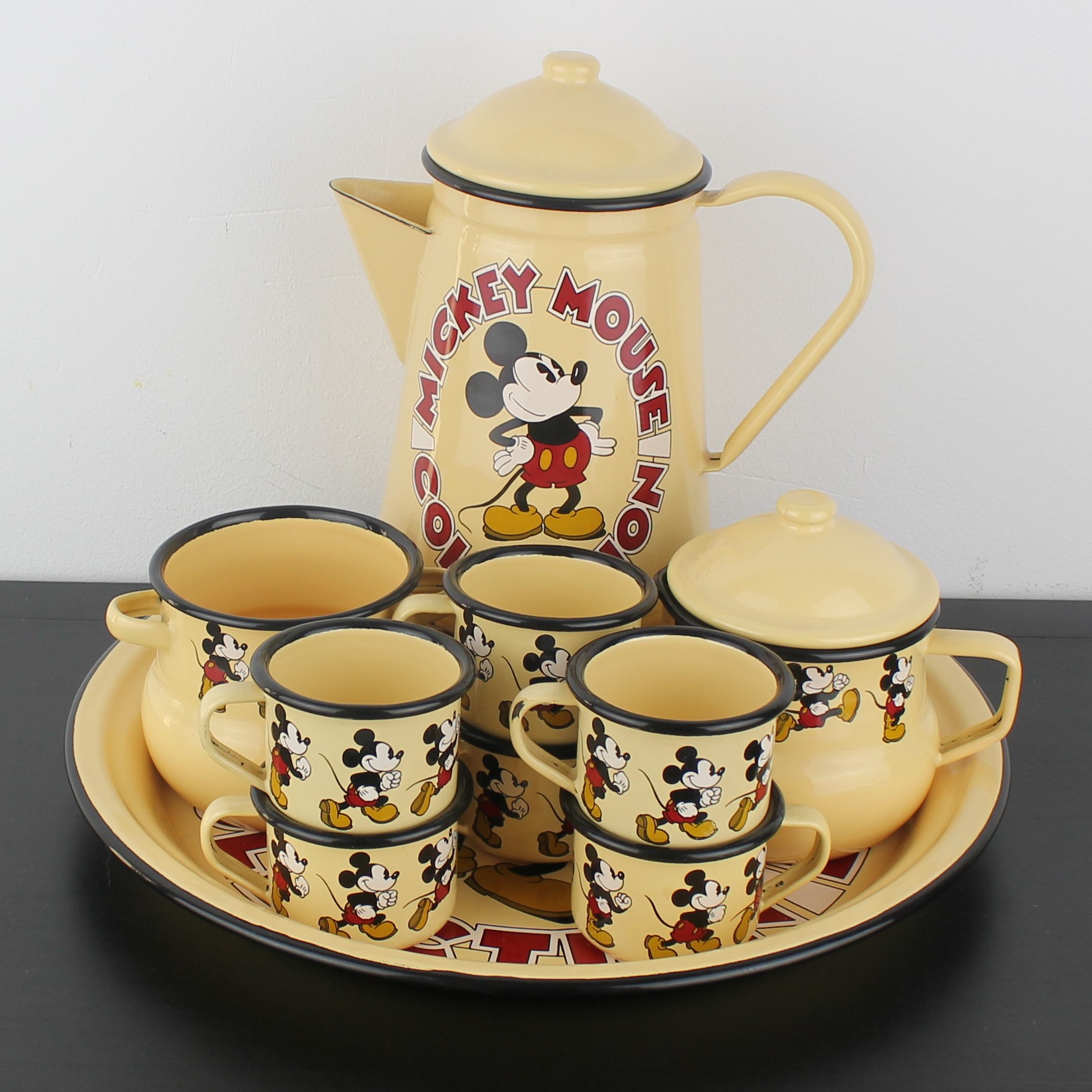 A unique and vintage set of enamel tableware from Mickey Mouse. Mickey Mouse on the most well know cartoon characters in the world and in the history of cartoons deserves his own merchandise. For every collector and lover of Mickey Mouse and/or tableware this is a must have.
