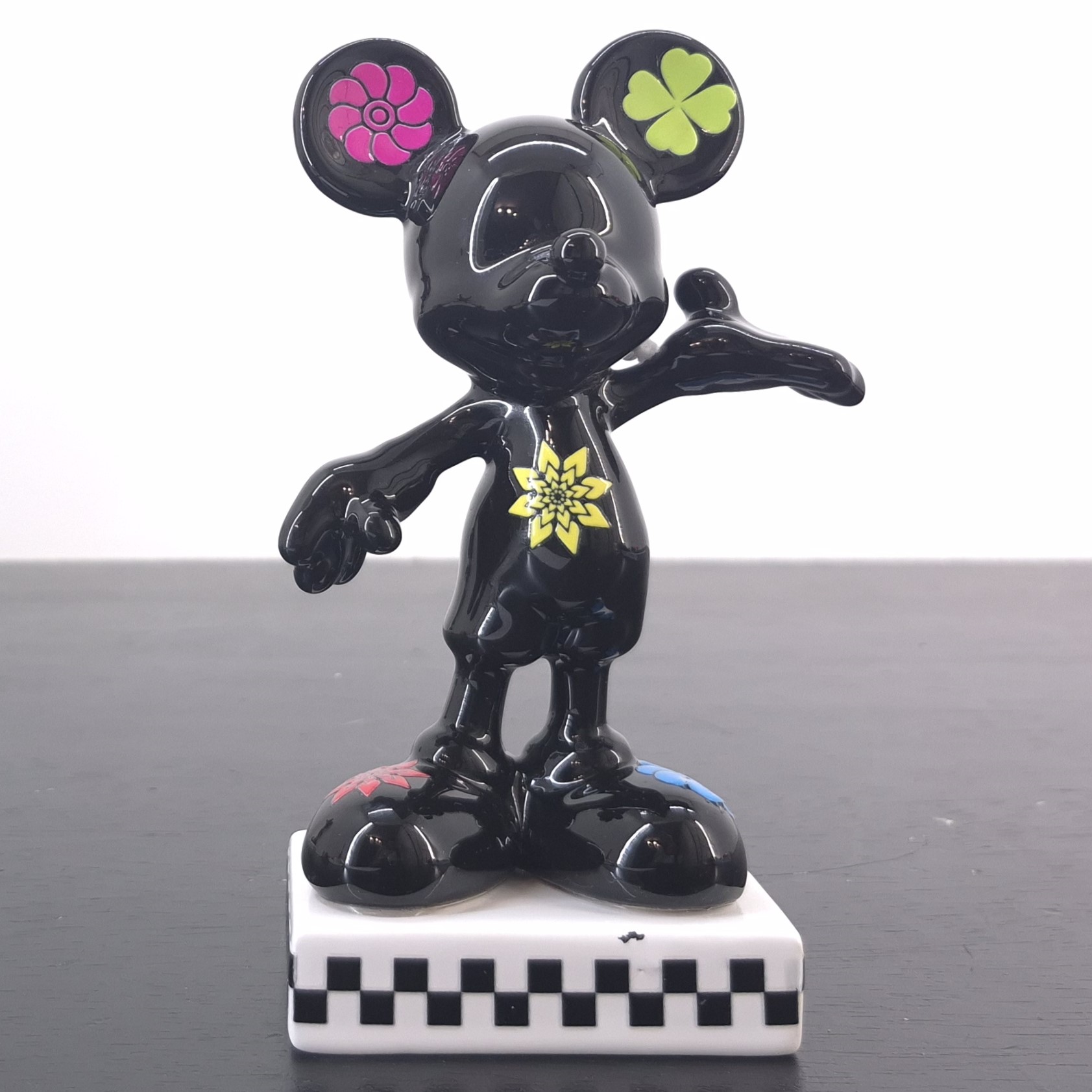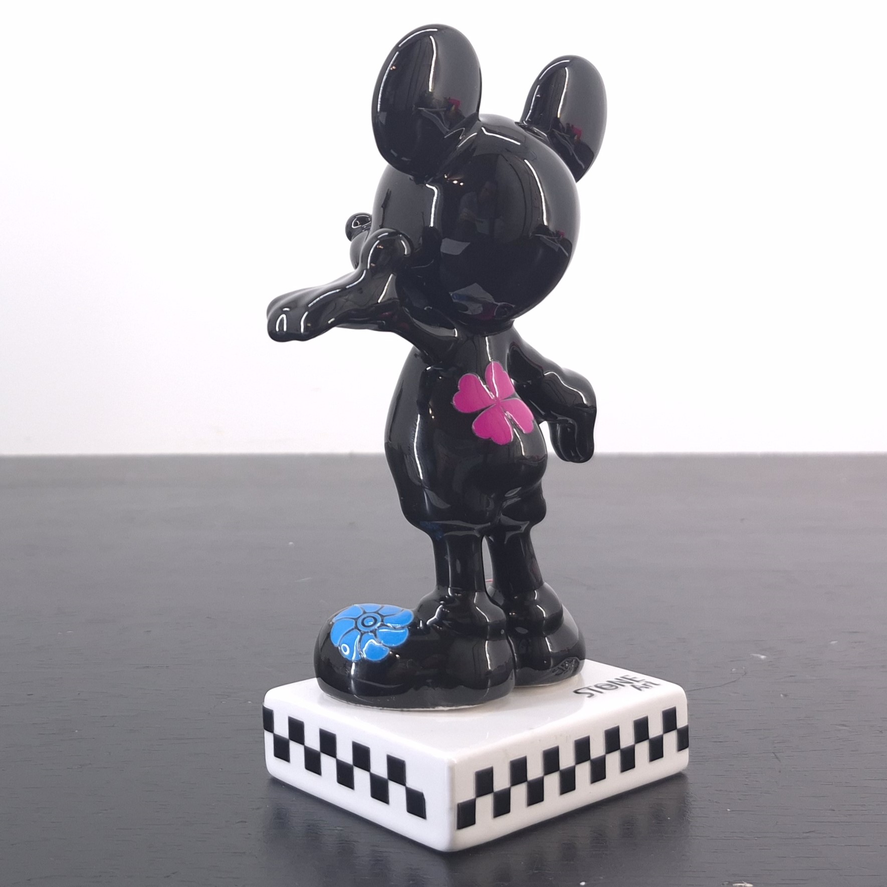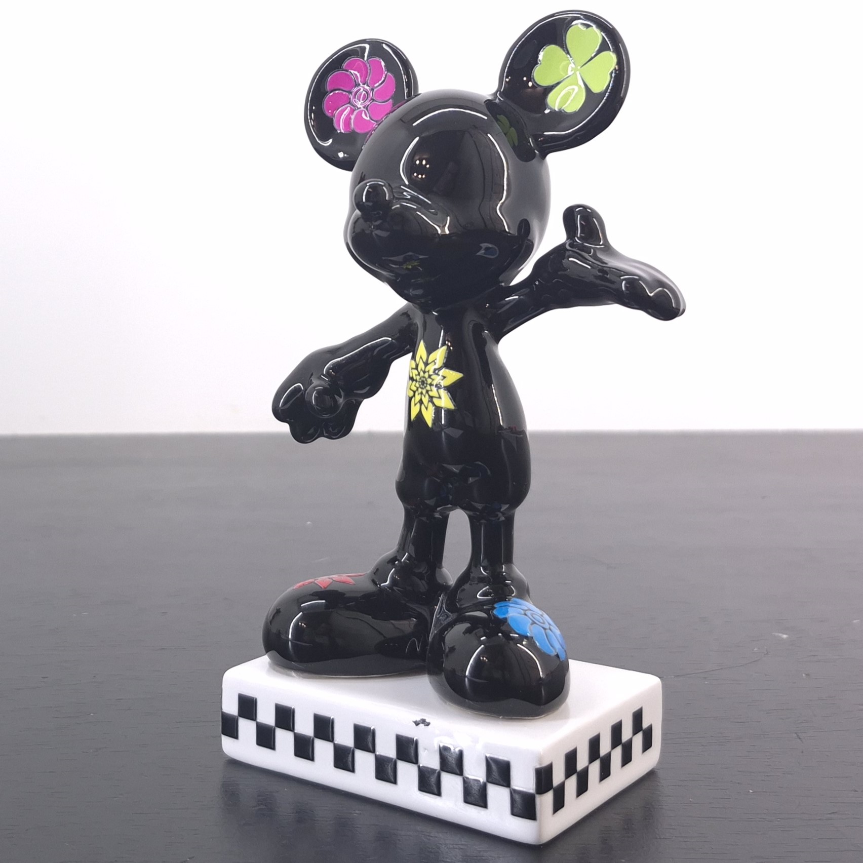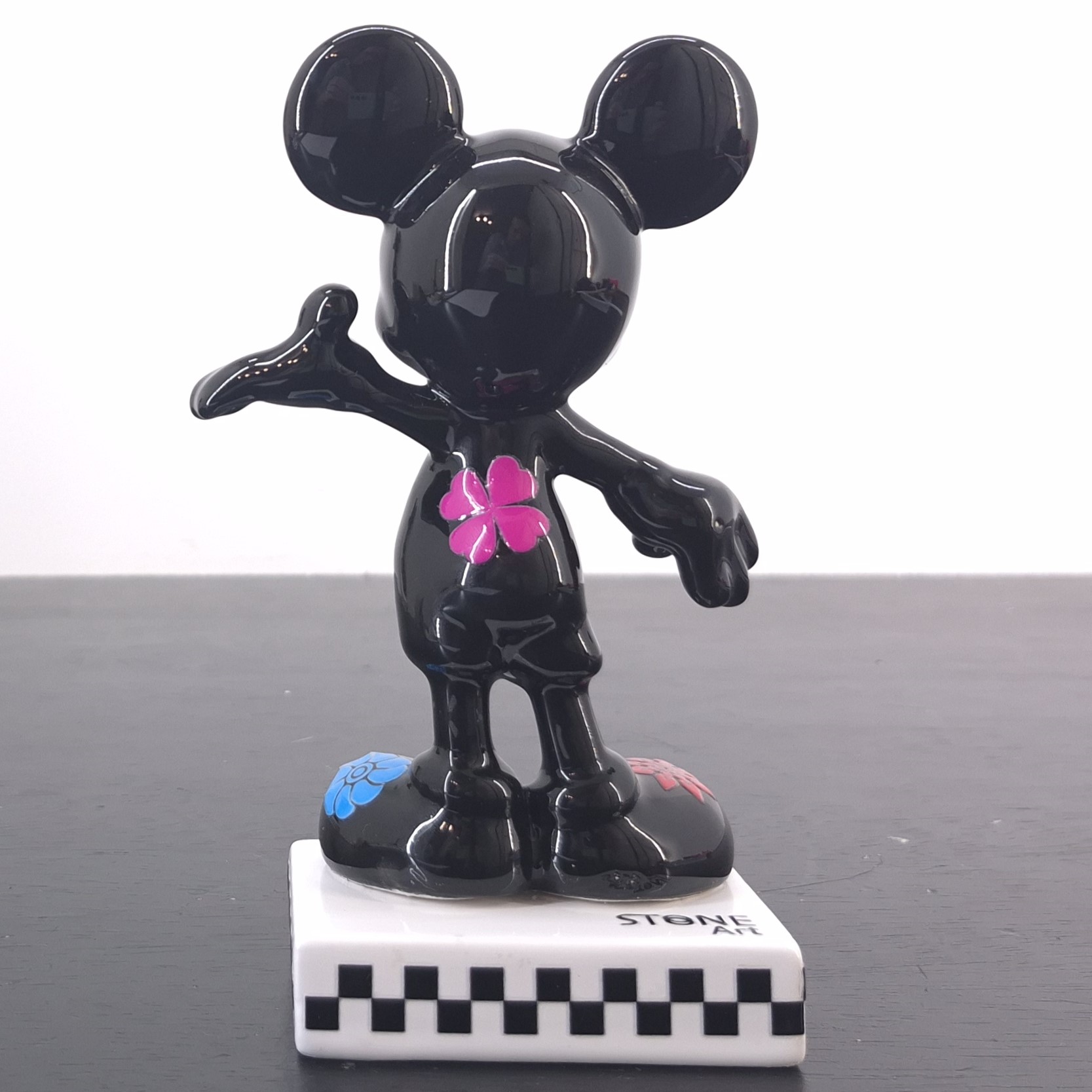 This figurine from Mickey Mouse was produced by Stone Art Italia under Walt Disney’s license. Dates back to the 2022. Crafted from durable ceramic, it remains in excellent condition. This Mickey Mouse collectible figurine reimagines the Disney icon in a sleek, glossy black finish. Adorned with colorful floral and clover motifs on his ears, chest, and shoes, it blends classic character design with modern pop art style. The checkered base adds a bold contrast, making it a standout piece in any display. A unique artistic interpretation, it captures both nostalgia and contemporary creativity. An essential collectible for Disney enthusiasts and art lovers seeking something truly distinctive.