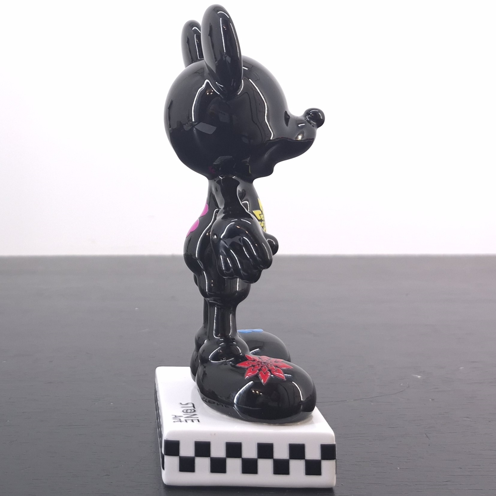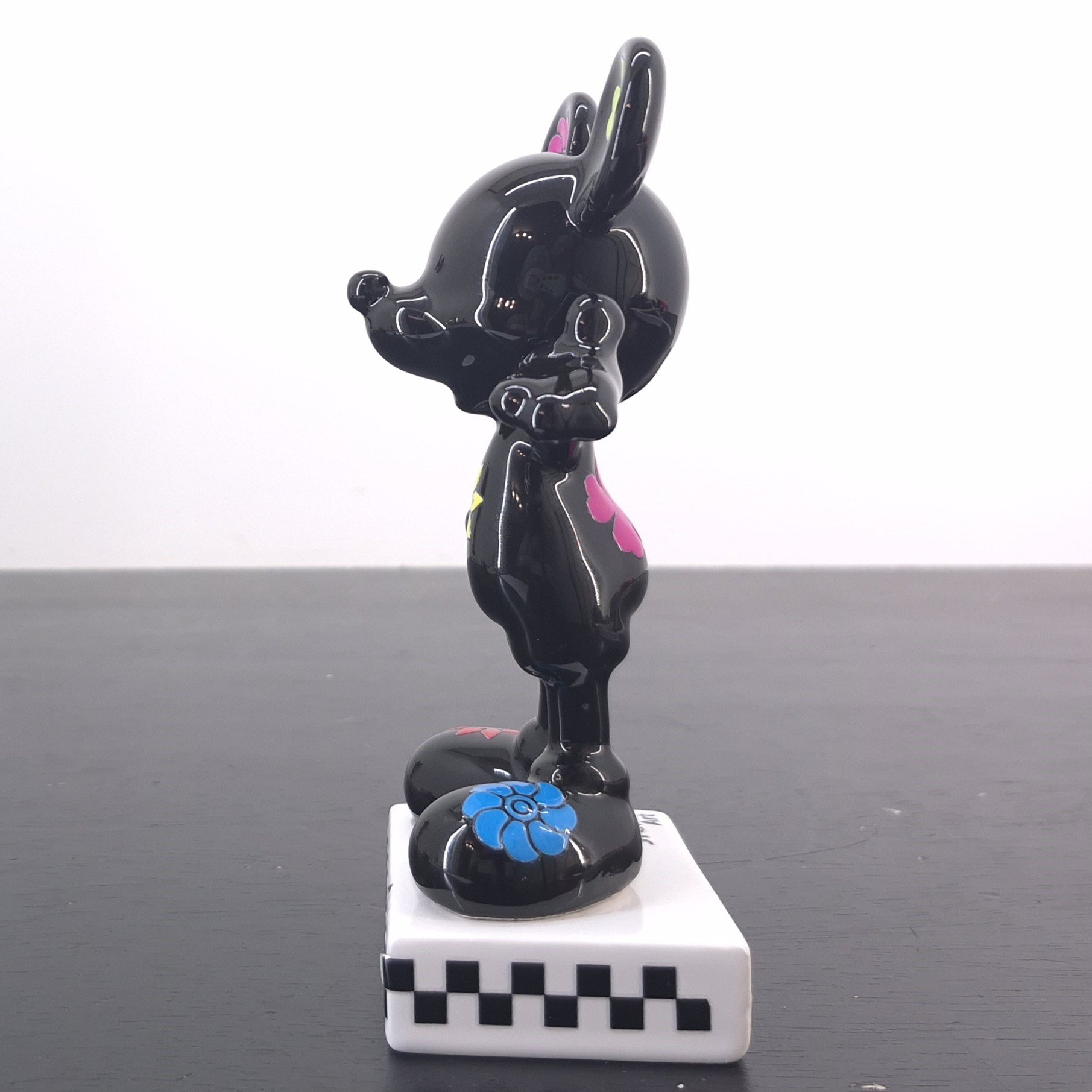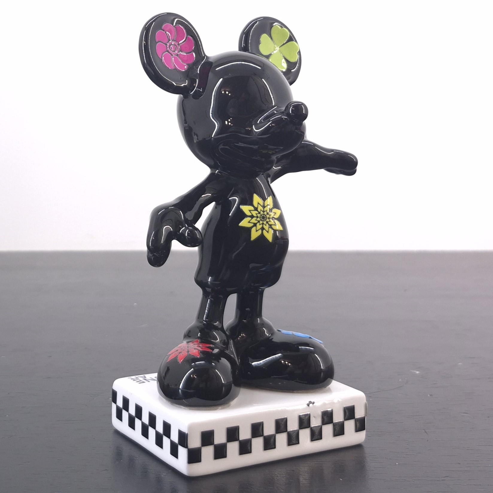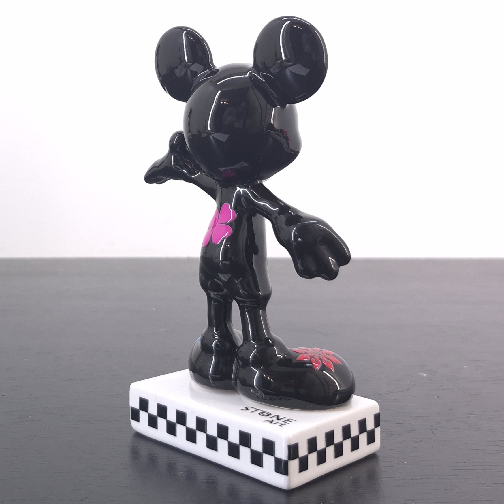 This figurine from Mickey Mouse was produced by Stone Art Italia under Walt Disney’s license. Dates back to the 2022. Crafted from durable ceramic, it remains in excellent condition. This Mickey Mouse collectible figurine reimagines the Disney icon in a sleek, glossy black finish. Adorned with colorful floral and clover motifs on his ears, chest, and shoes, it blends classic character design with modern pop art style. The checkered base adds a bold contrast, making it a standout piece in any display. A unique artistic interpretation, it captures both nostalgia and contemporary creativity. An essential collectible for Disney enthusiasts and art lovers seeking something truly distinctive.