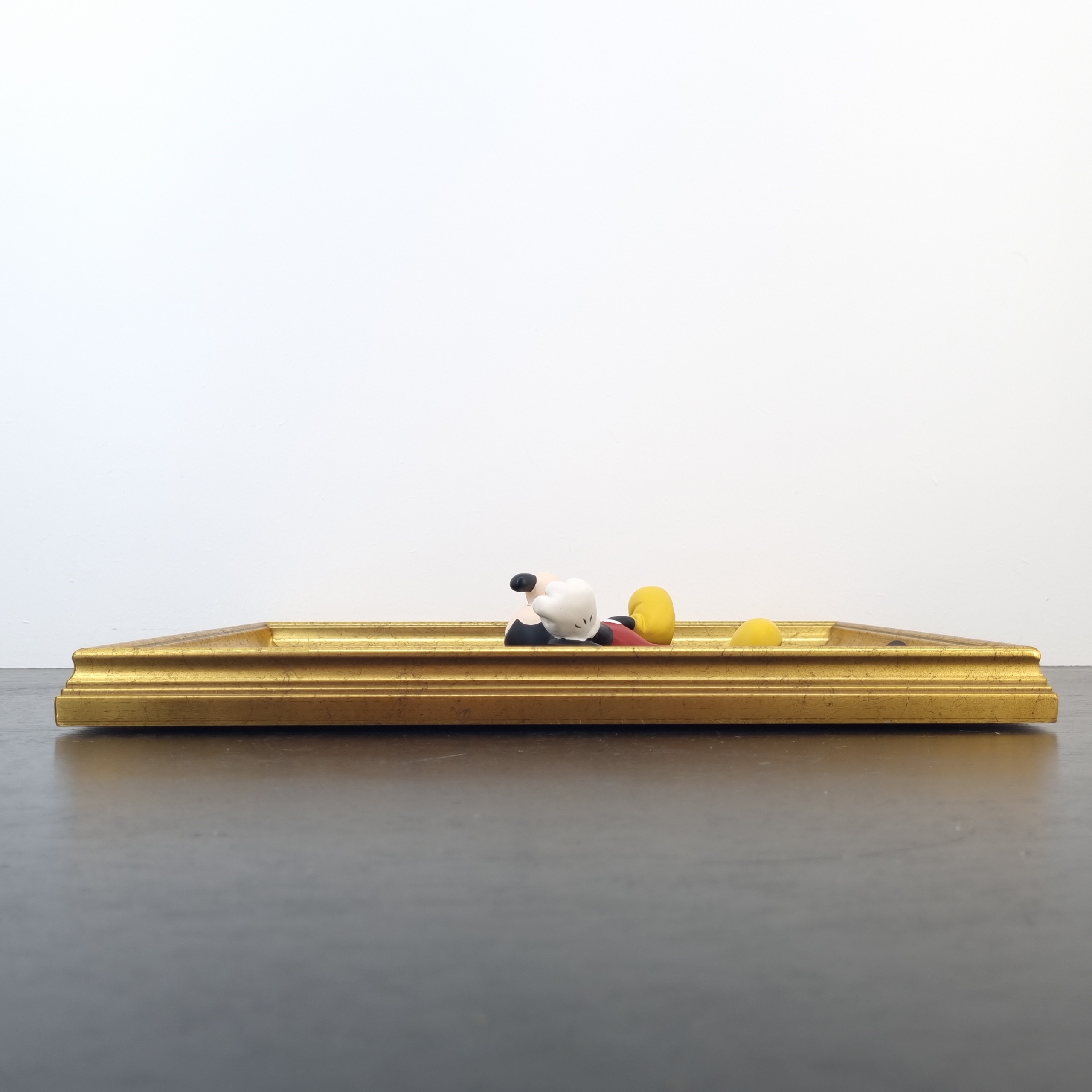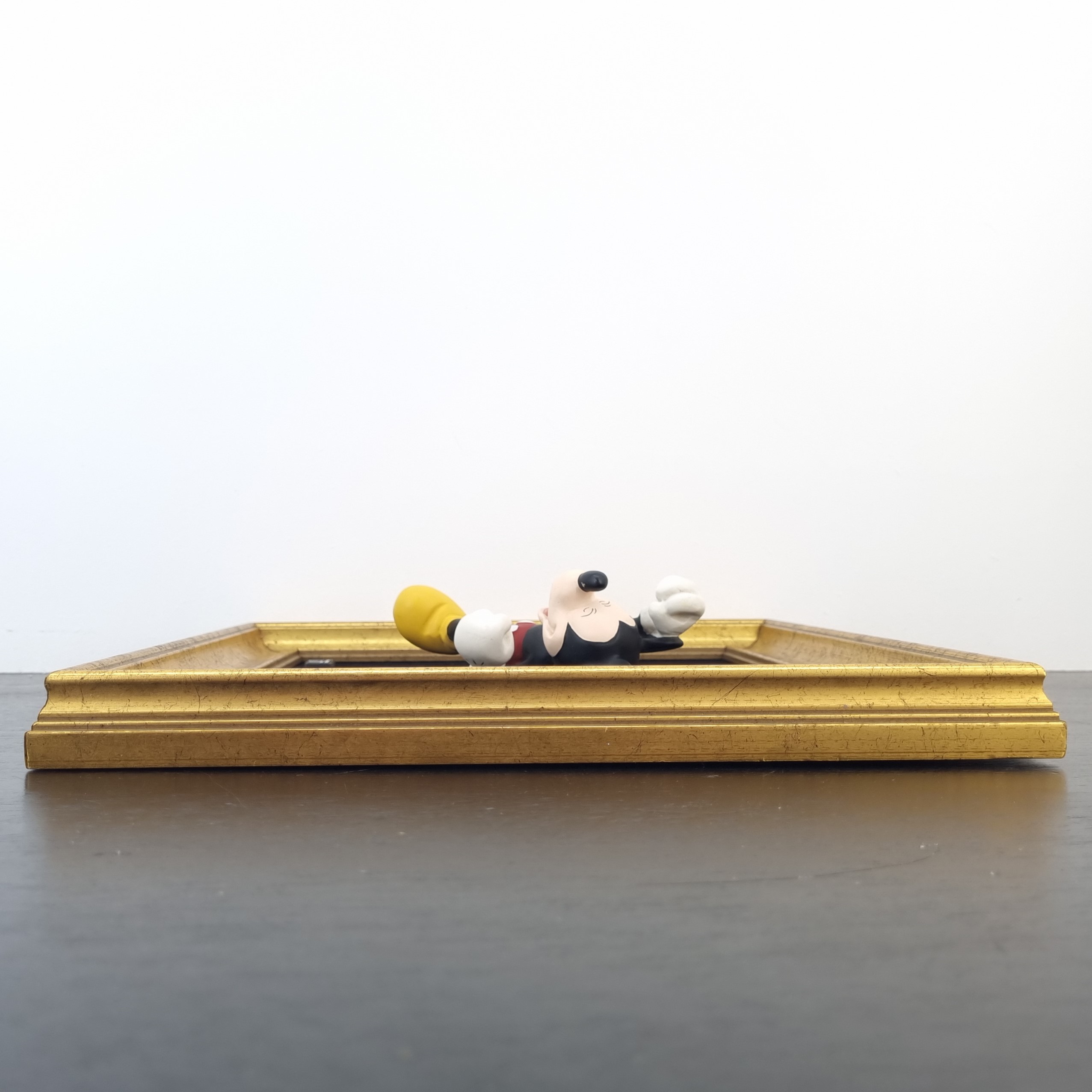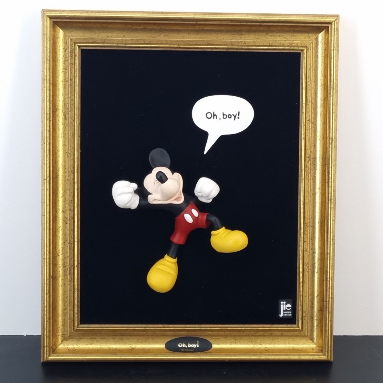 This three-dimensional wall art, featuring the beloved character Mickey Mouse, is a collectible from Jie Art under license from Walt Disney. Crafted from high-quality resin, it sits against a black cloth background. Additionally, a wooden frame encases it. Joakim Lindstrup designed this piece in the late 1980s to early 1990s. Consequently, this vintage Walt Disney collectible remains in excellent condition. The piece showcases a stunning 3D depiction of Mickey Mouse jumping in the air with a text balloon; ”Oh Boy”. Furthermore, a gold-painted frame enhances its overall appeal.