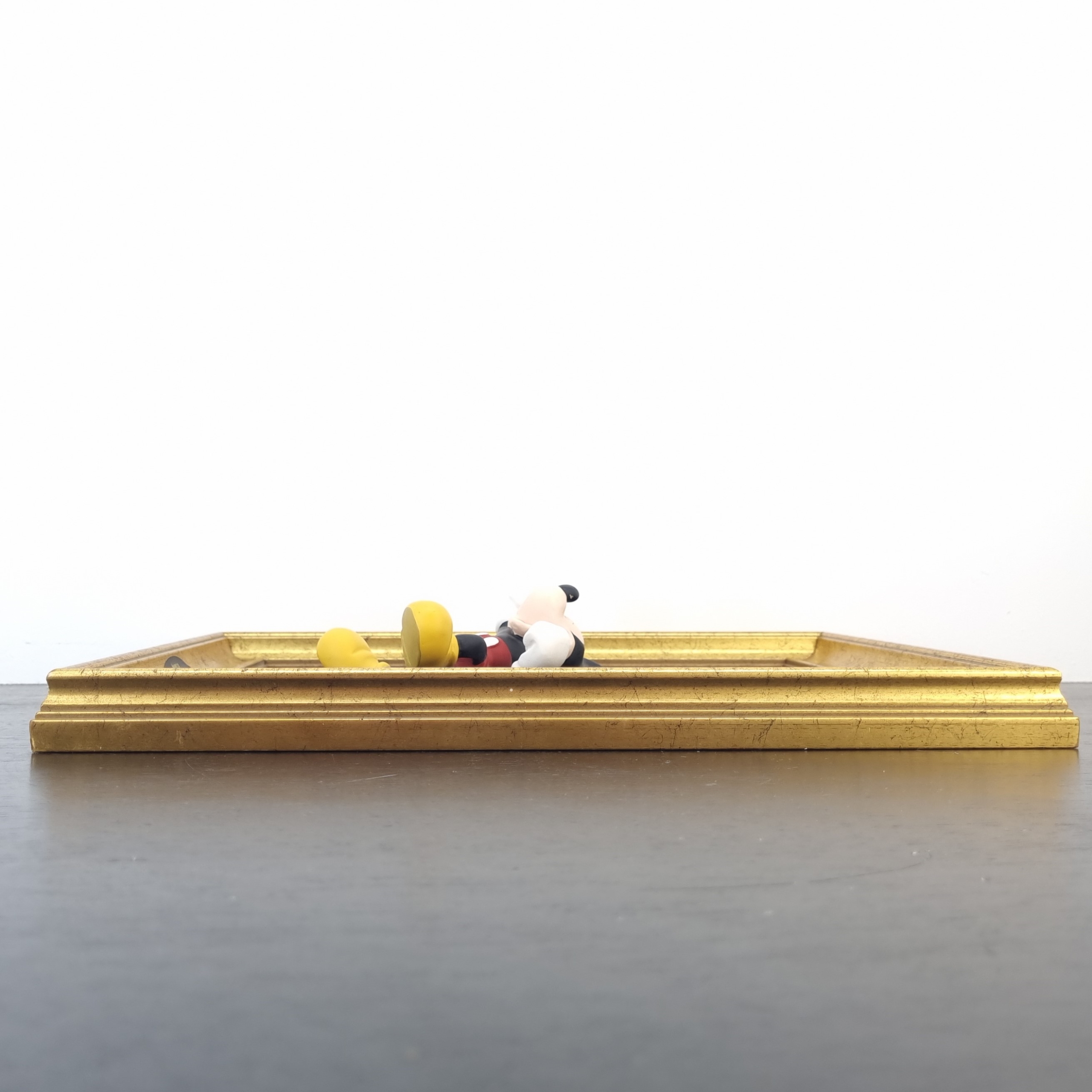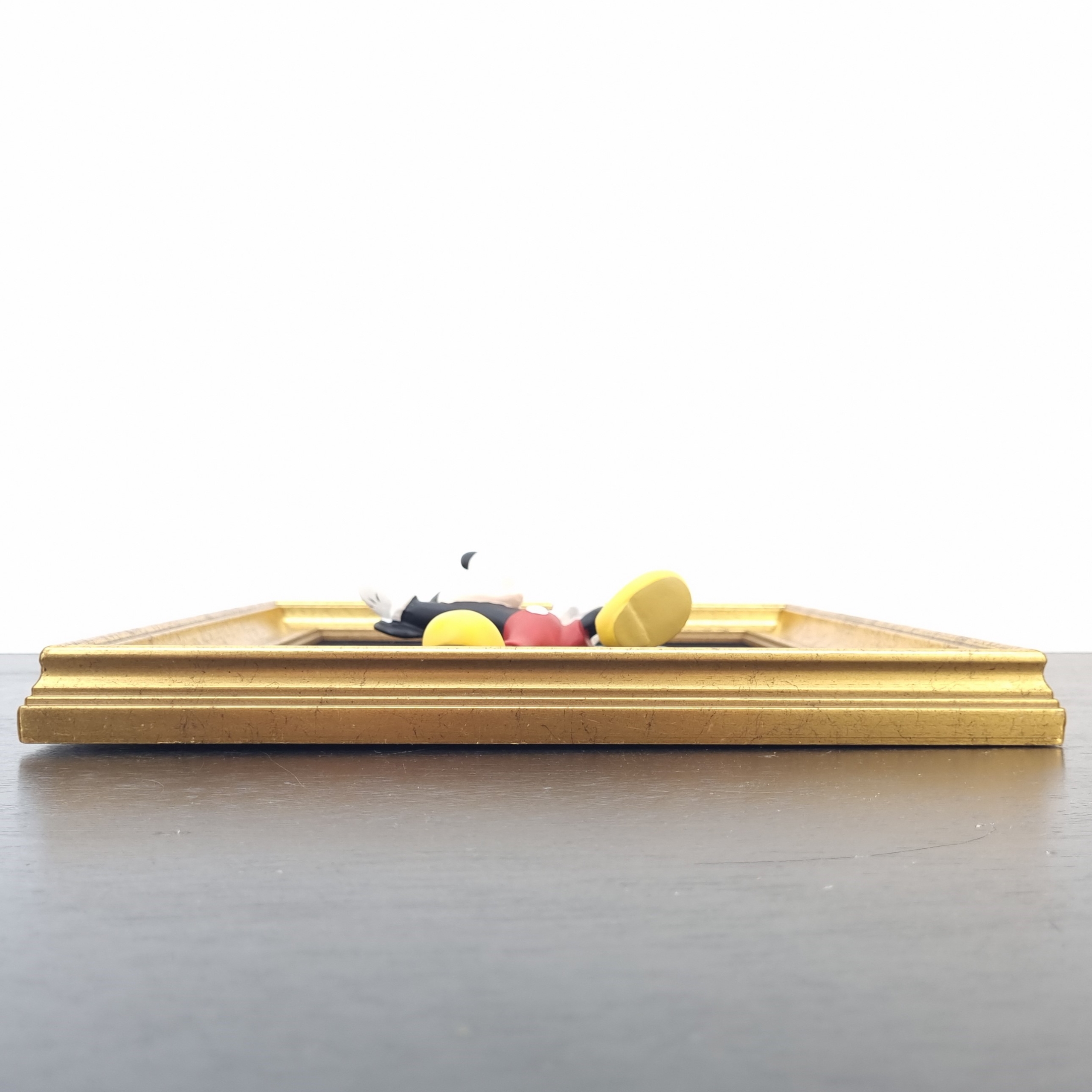 The outer dimension of this Mickey Mouse artwork is approximately 36 cm in height, crafted from durable resin, and placed in a wooden frame.