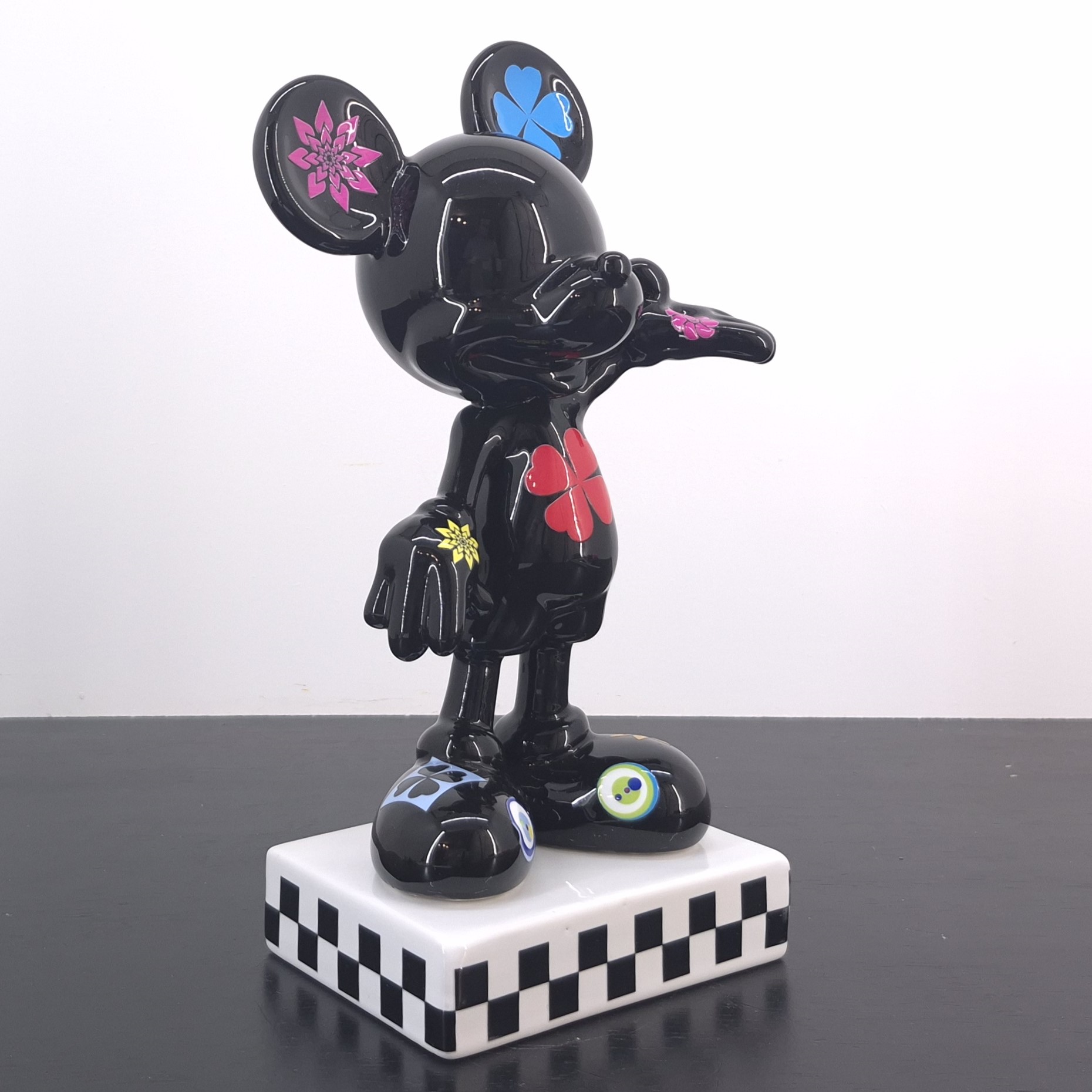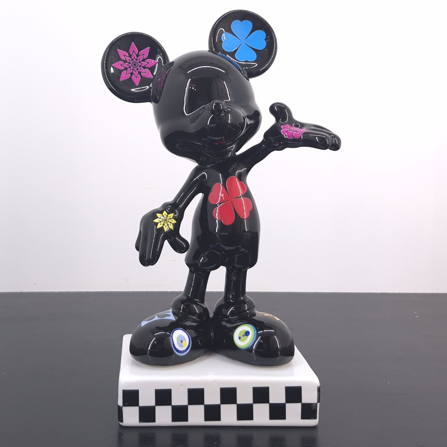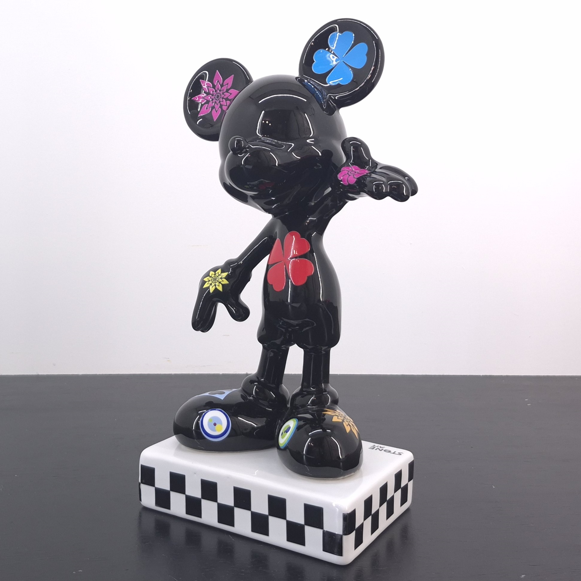 This statue from Mickey Mouse was produced by Stone Art under Walt Disney’s license. Dates back to the 2022. Crafted from durable ceramic, it remains in excellent condition. Celebrate pop culture with this striking Mickey Mouse collectible statue. Finished in glossy black, it features bold, colorful flower and clover motifs across Mickey’s iconic form. The checkered base adds a modern, artistic touch, making it perfect for display in any collection. A unique interpretation of Disney’s most beloved character, blending nostalgia with contemporary design. An eye-catching piece for Disney fans, art lovers, and serious collectors alike.