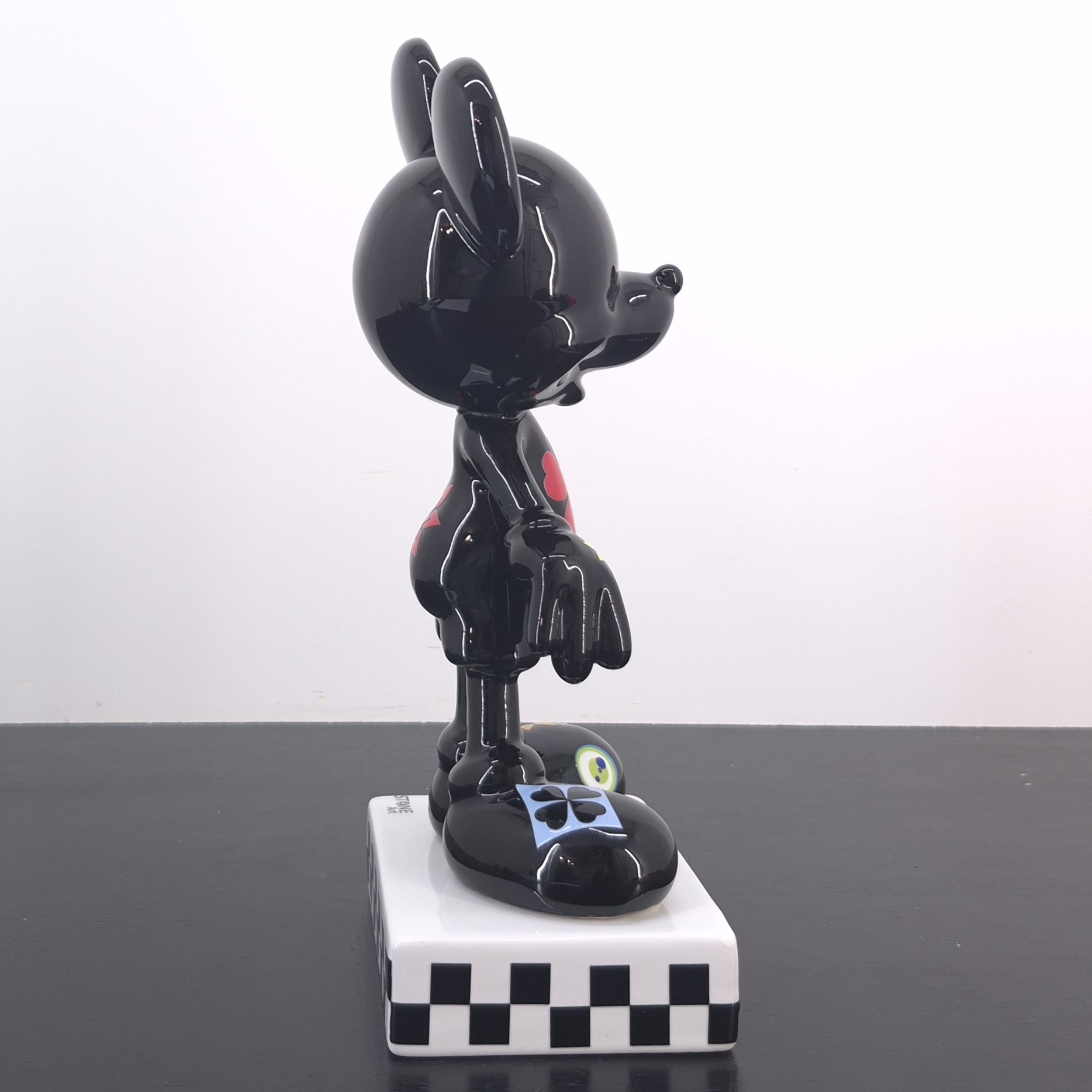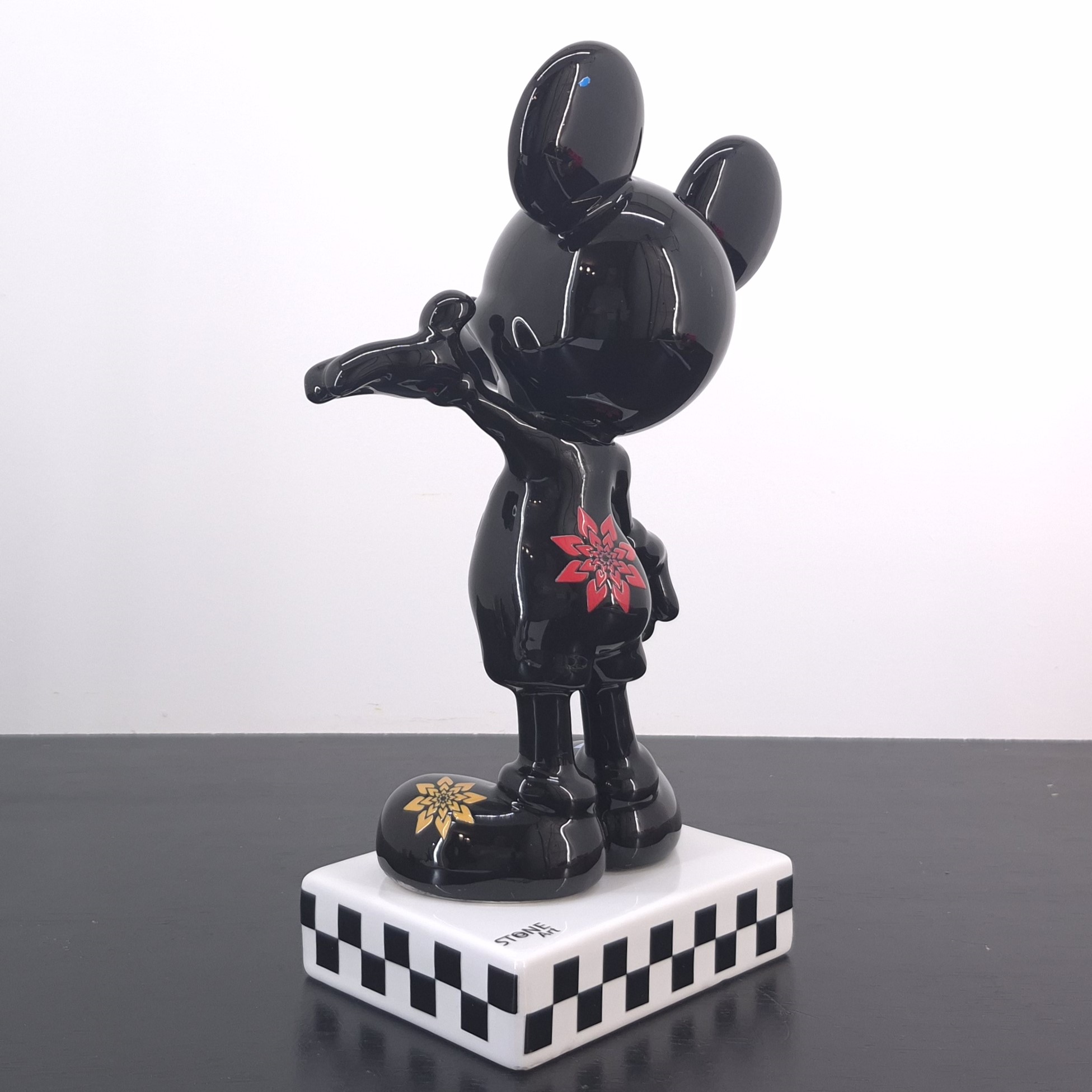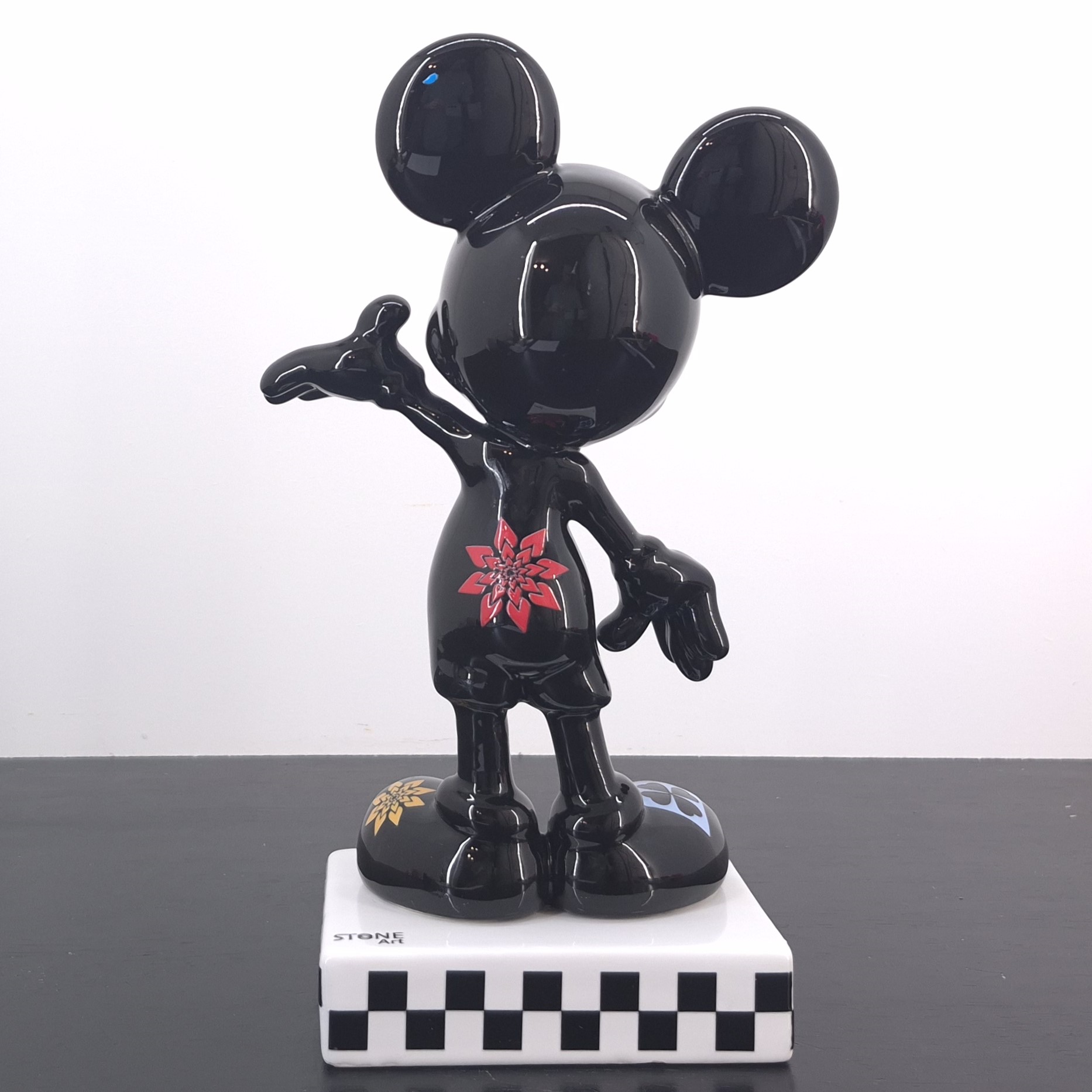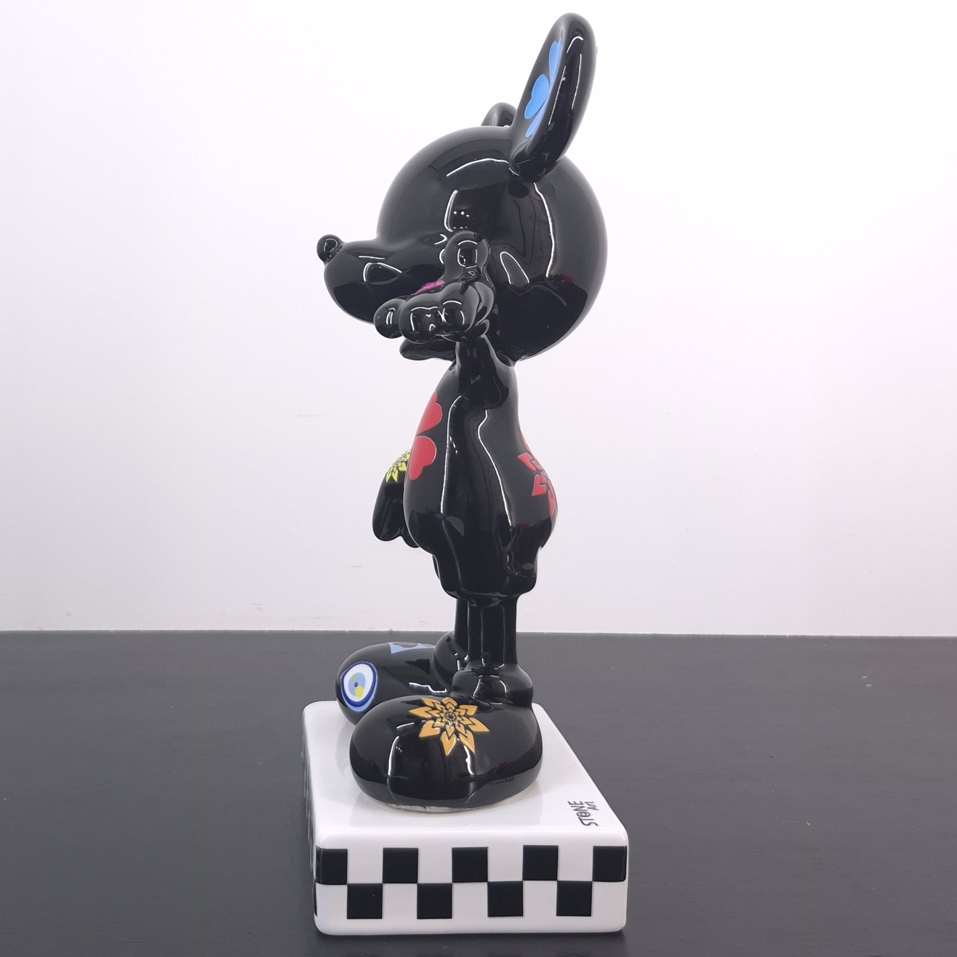 This statue from Mickey Mouse was produced by Stone Art under Walt Disney’s license. Dates back to the 2022. Crafted from durable ceramic, it remains in excellent condition. Celebrate pop culture with this striking Mickey Mouse collectible statue. Finished in glossy black, it features bold, colorful flower and clover motifs across Mickey’s iconic form. The checkered base adds a modern, artistic touch, making it perfect for display in any collection. A unique interpretation of Disney’s most beloved character, blending nostalgia with contemporary design. An eye-catching piece for Disney fans, art lovers, and serious collectors alike.