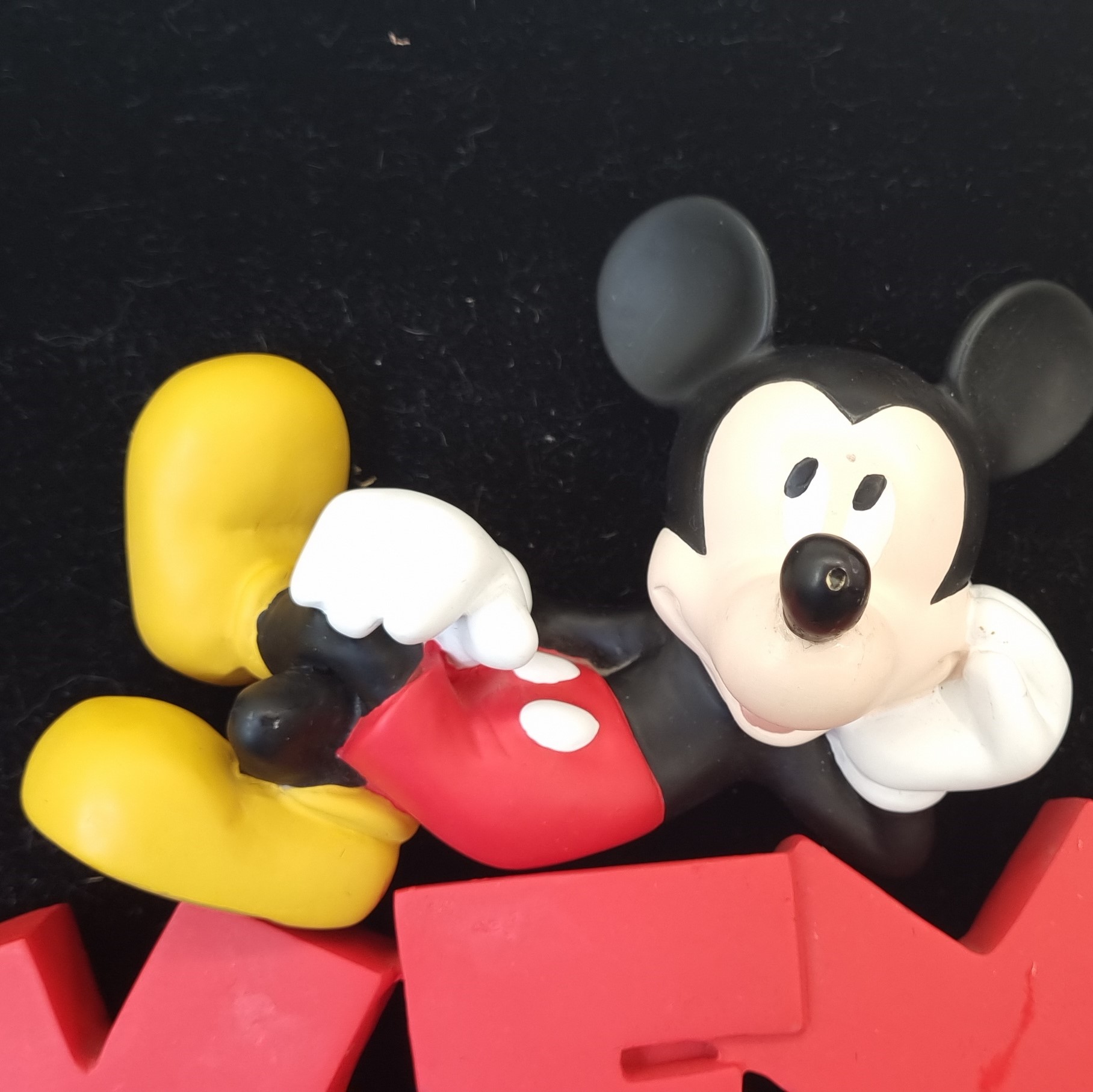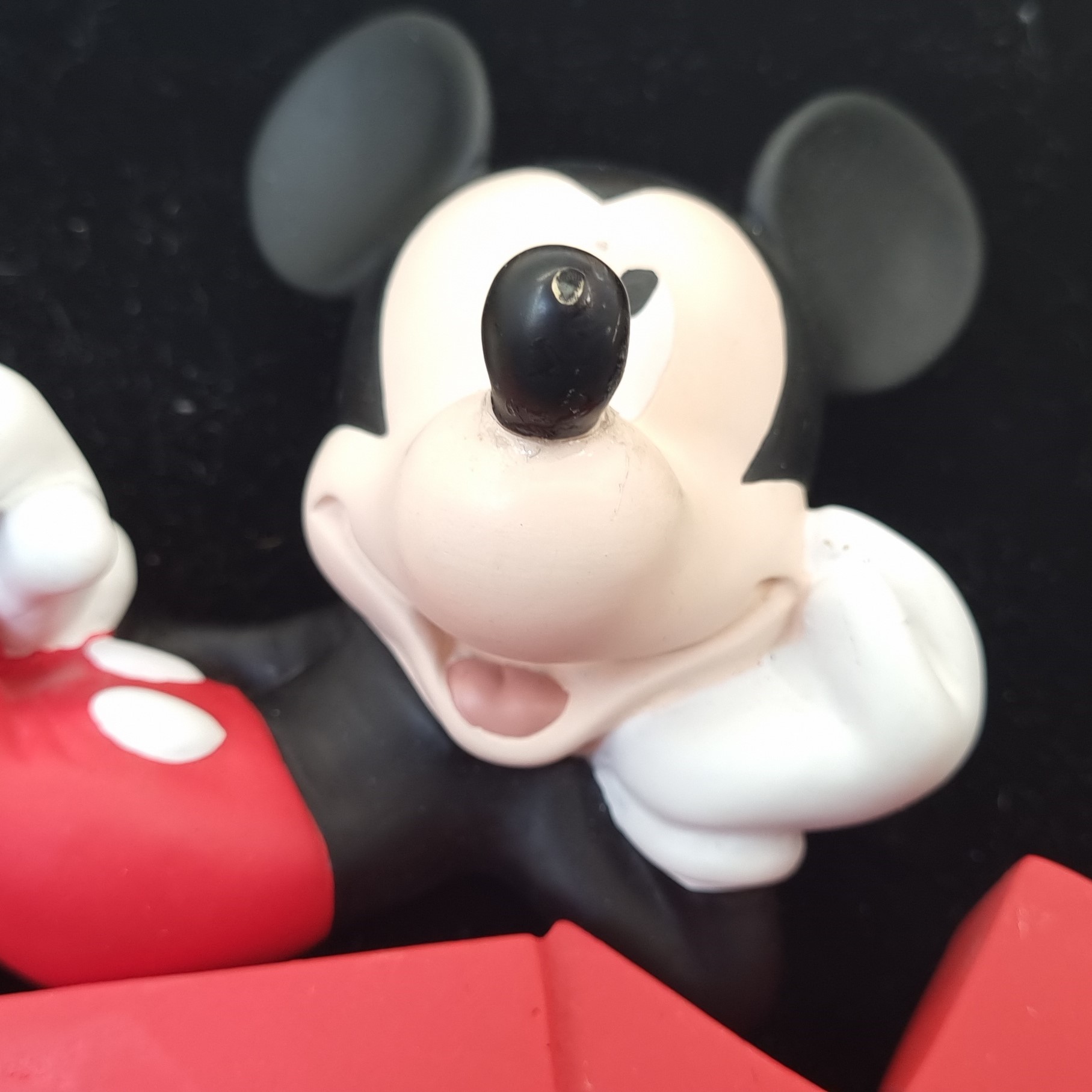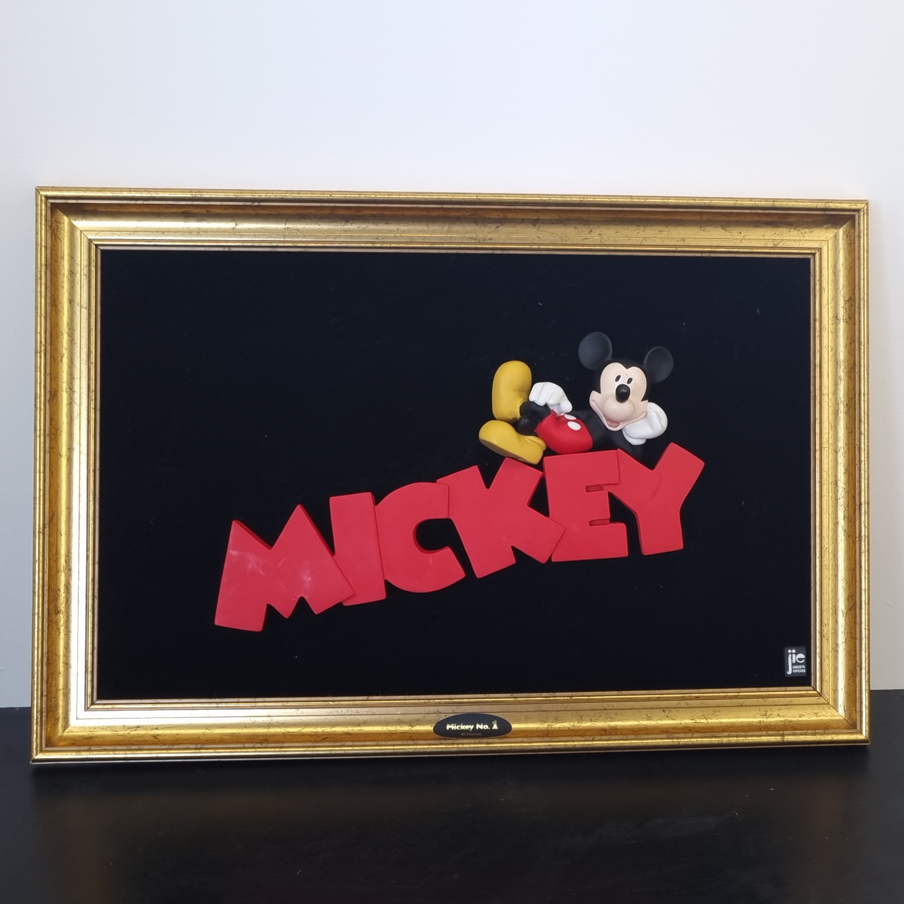 This three-dimensional wall art, featuring the beloved character Mickey Mouse and his name, is a collectible from Jie Art under license from Walt Disney. Crafted from high-quality resin, it sits against a black cloth background. Additionally, a wooden frame encases it. Joakim Lindstrup designed this piece in the late 1980s to early 1990s. Consequently, this vintage Walt Disney collectible remains in good condition. Shows signs of wear, and the nose has been restored by a previous owner. The piece showcases a stunning 3D depiction of Mickey Mouse relaxing. Furthermore, a gold-painted frame enhances its overall appeal.