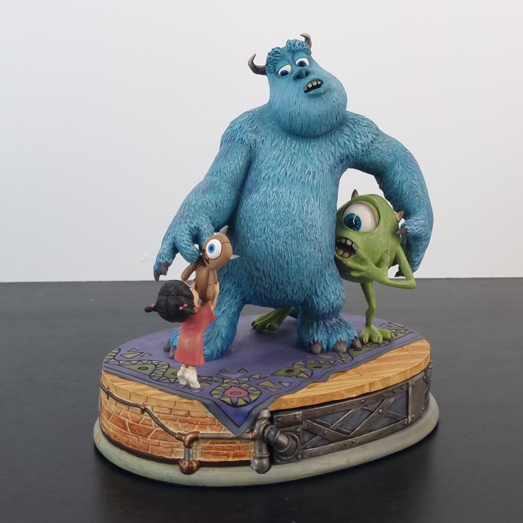 Get ready to add a unique and rare piece to your Monsters & Co collection with this limited edition statue by MarkRita! This highly detailed statue depicts the lovable duo Sulley and Mikey, looking frightened as they encounter a small child named Boo holding a plush toy. This iconic scene from the movie is brought to life in stunning detail, making it a must-have for any fan or collector. Produced in limited quantities, this rare and exquisite statue is a true gem that is sure to be the centerpiece of any collection. Don’t miss your chance to own a piece of Monsters & Co history.