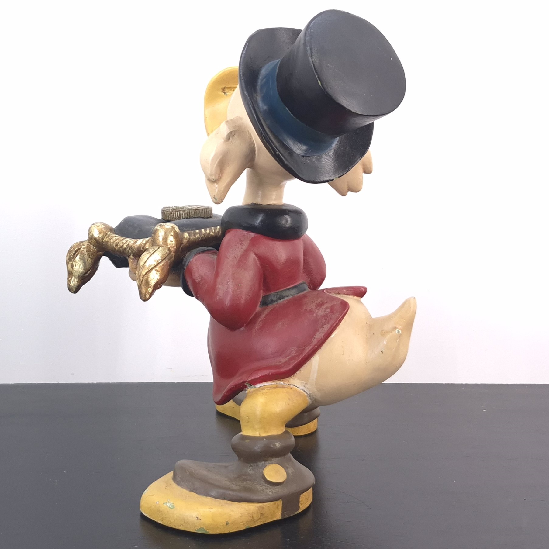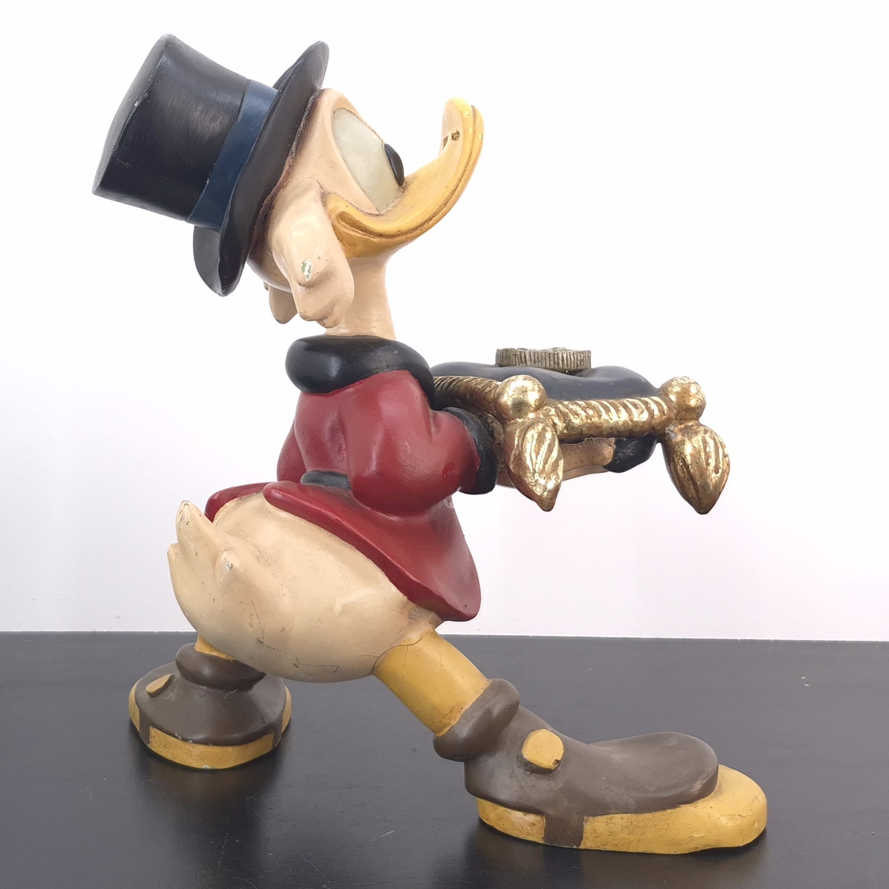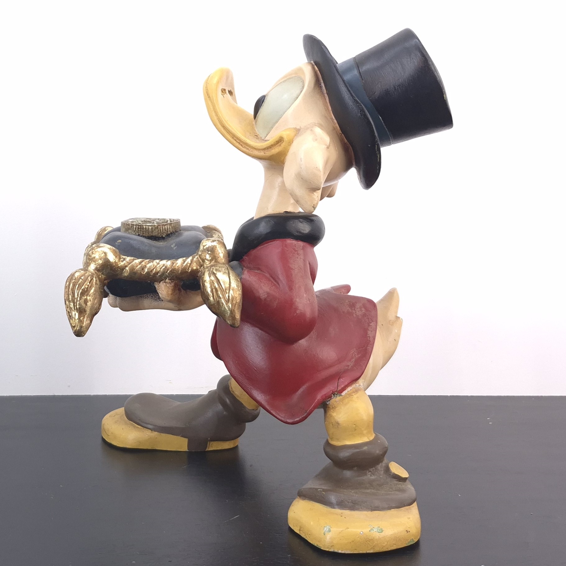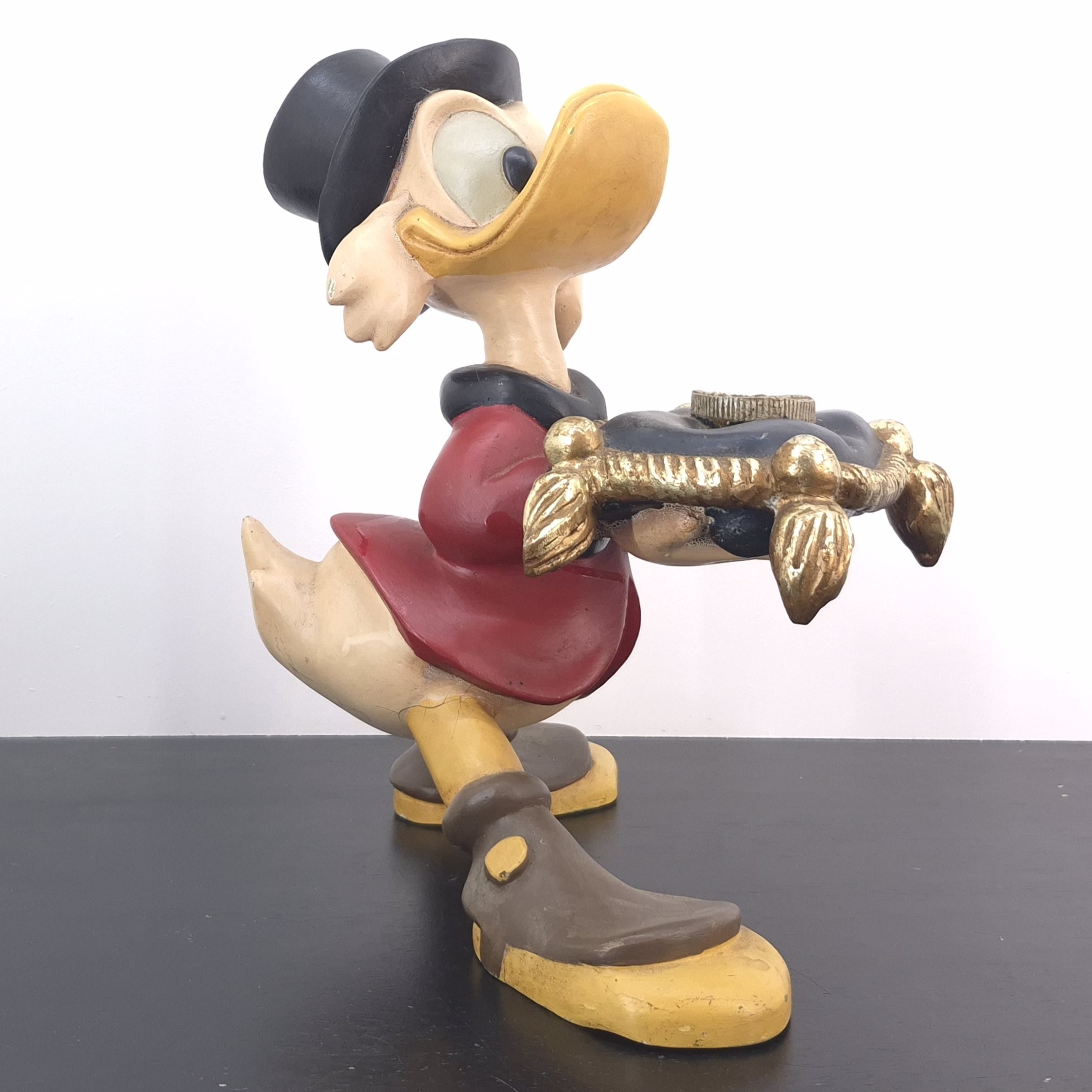 This unique statue from Scrooge McDuck was sculpted by Stefan Toth under Walt Disney’s license. Dates back to the 1980s. Made from durable polyester, it remains in used condition. Outlet items may show noticeable wear. That’s why we’ve priced them to match—great value, no surprises.
