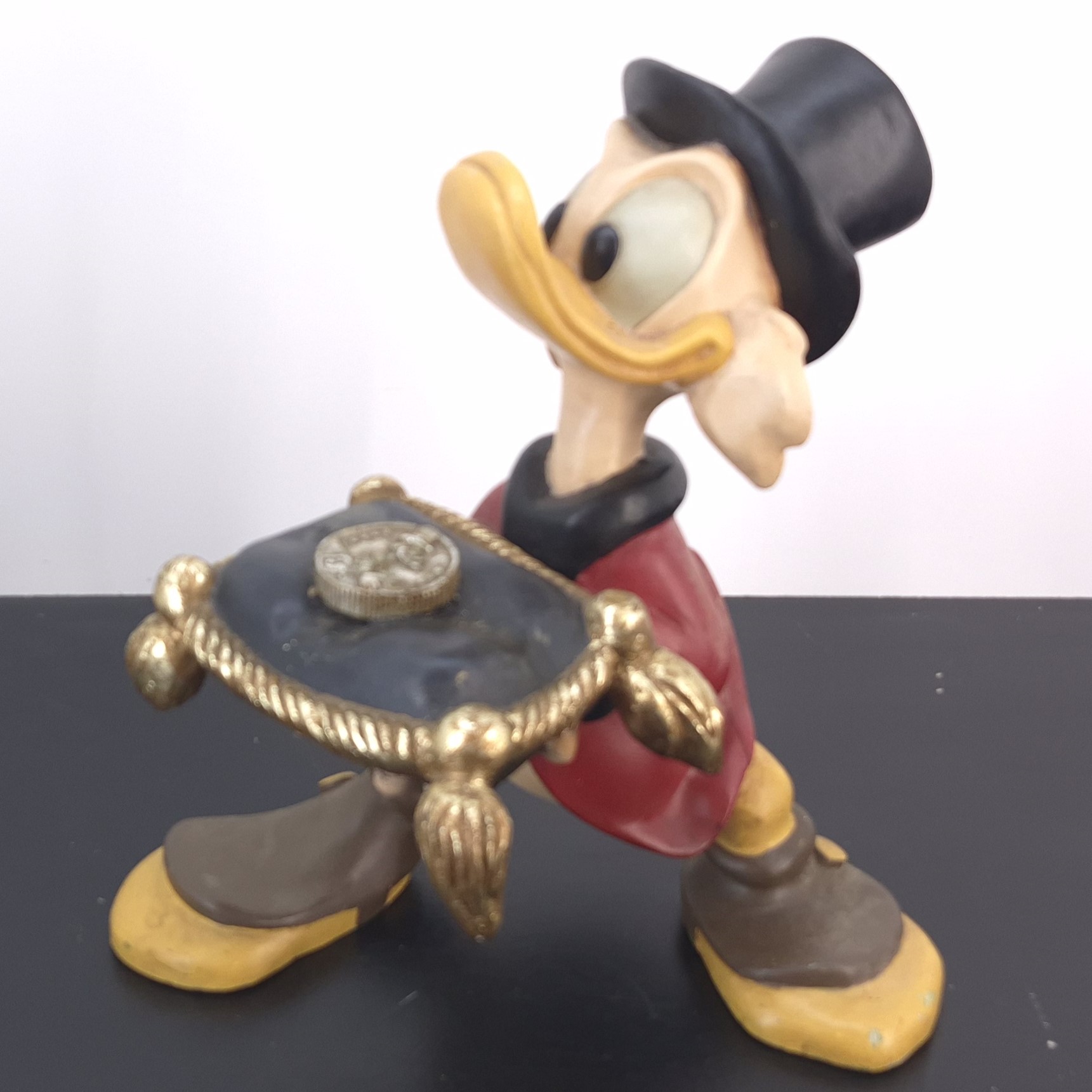 Vintage statue featuring Scrooge McDuck with his lucky dime on a pillow, produced by Walt Disney.