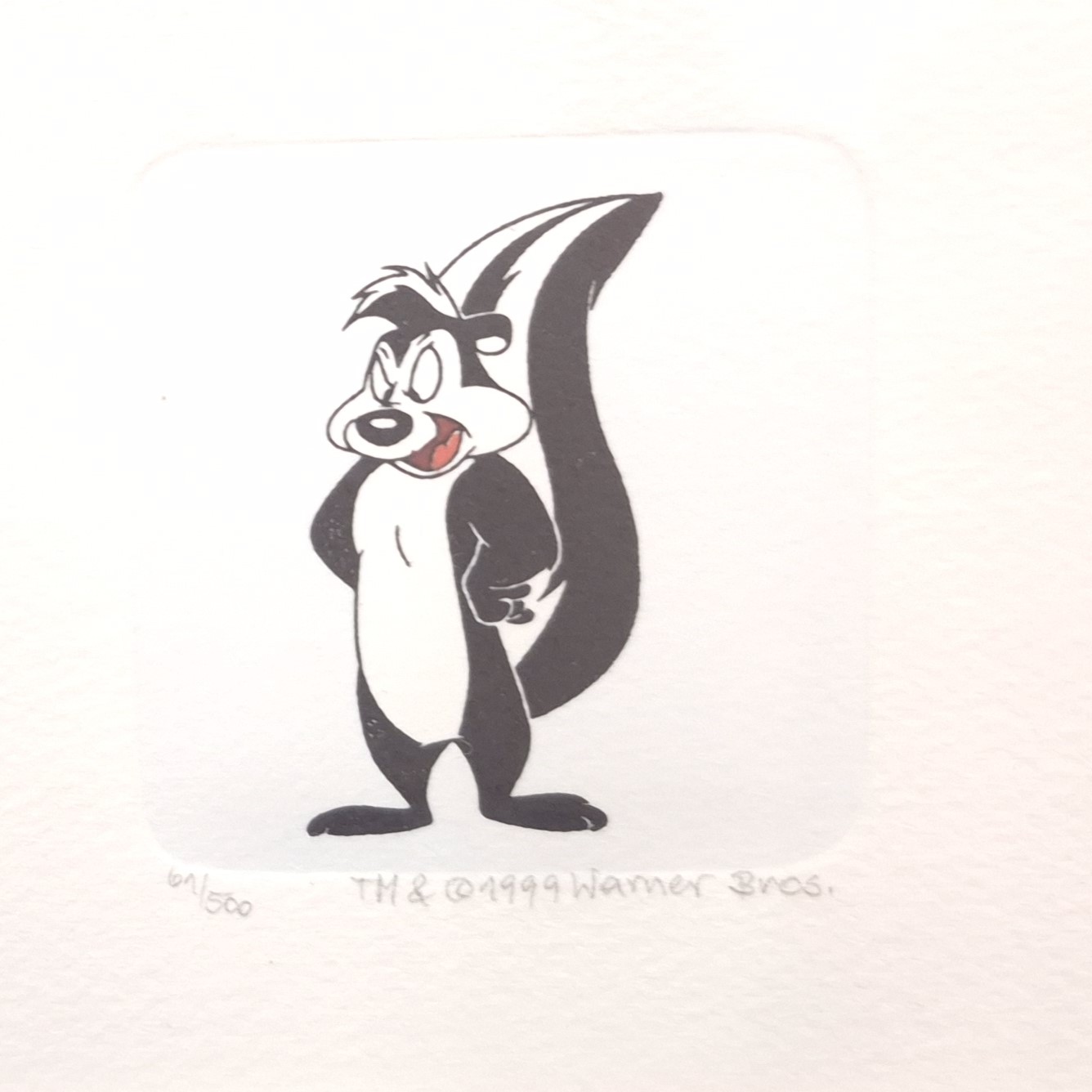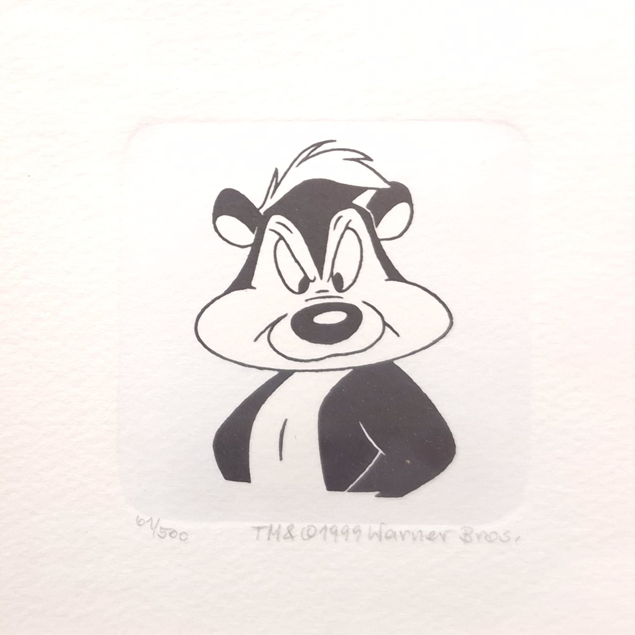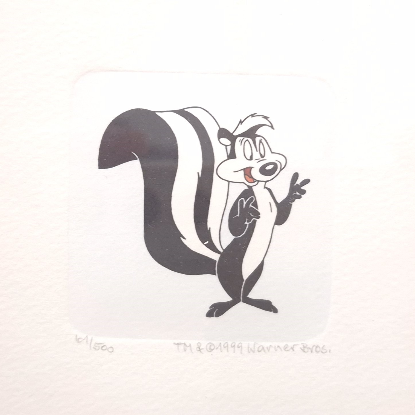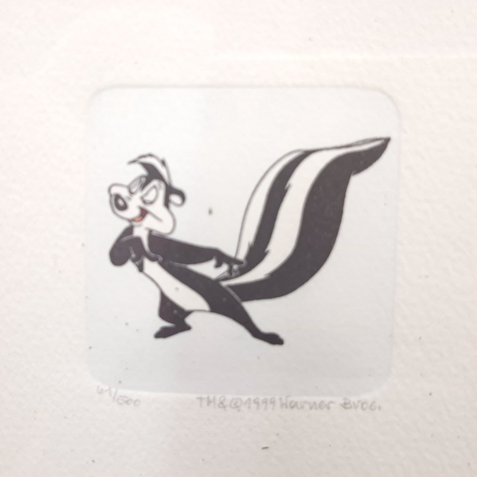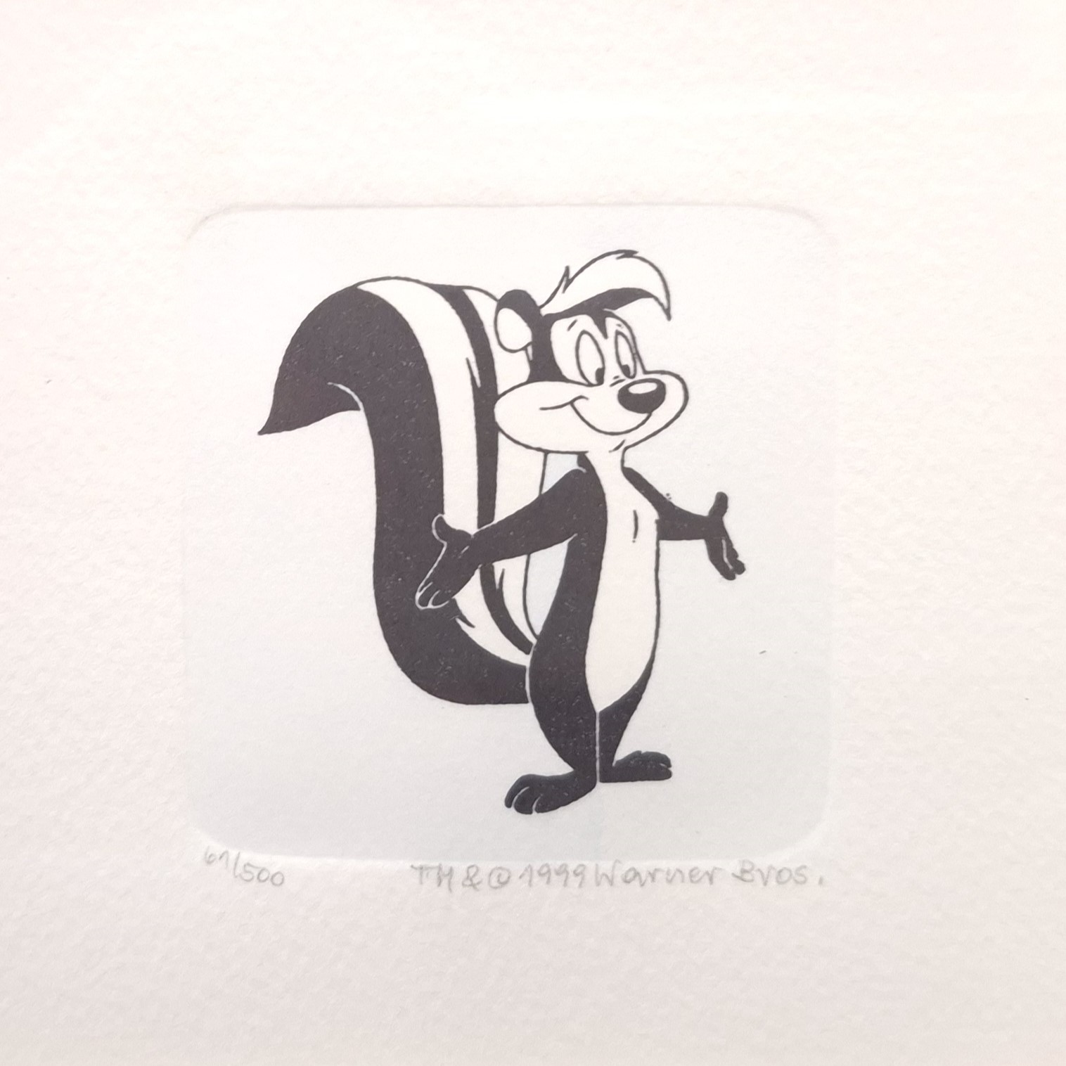 Vintage etchings of Pepé Le Pew and Penelope Pussycat, crafted by Sowa and Reiser under Warner Bros.’ license. Dates back to 1999. Crafted from durable paper, it remains in excellent condition. Add a touch of romantic mischief to your collection with this exquisite limited edition handmade etching featuring Pepé Le Pew and Penelope Pussycat. Captured in timeless black and white detail, this charming artwork showcases the ever-persistent skunk mid-swoon as he pursues his elusive love. Limited to just 500 pieces worldwide, each etching is hand-crafted, numbered, and rich in classic Looney Tunes charm. The expressive lines and vintage style make it a standout piece for collectors and animation fans alike. Love may be complicated—but this artwork is simply irresistible!
