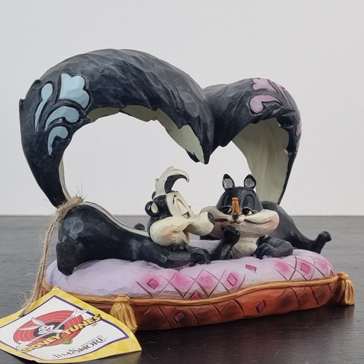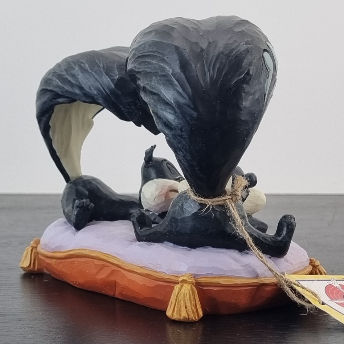 This unique figurine from Pepé le Pew and Penelope sculpted by Jim Shore under Warner Bros.’ license. It was taken in production by Enesco for their Looney Tunes Traditions collection. Dates back to 2016. Crafted from durable stone resin, it remains in excellent condition. Celebrate love with this charming figurine of Pepé le Pew and Penelope romantically sitting on a big pillow, their tails forming a heart. Perfect for fans of the classic cartoon, this piece captures the playful and affectionate moment, with Penelope adorably wearing a clothespin on her nose. It’s a delightful addition to any collection, sure to bring a smile to your face.