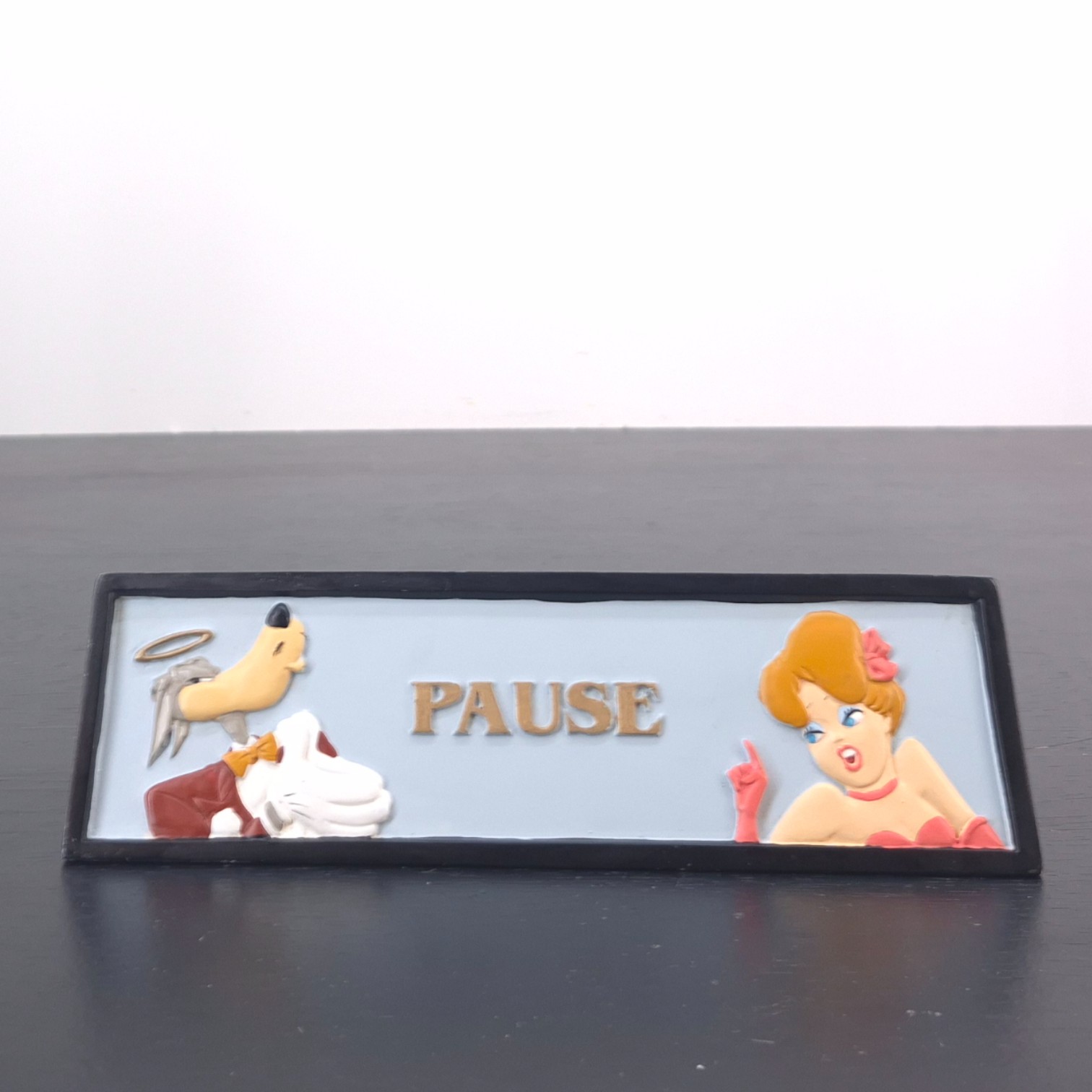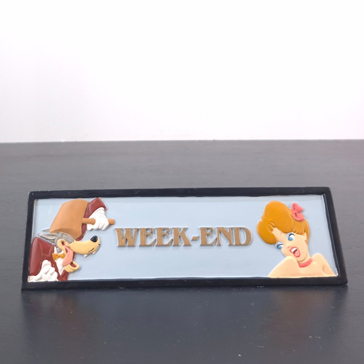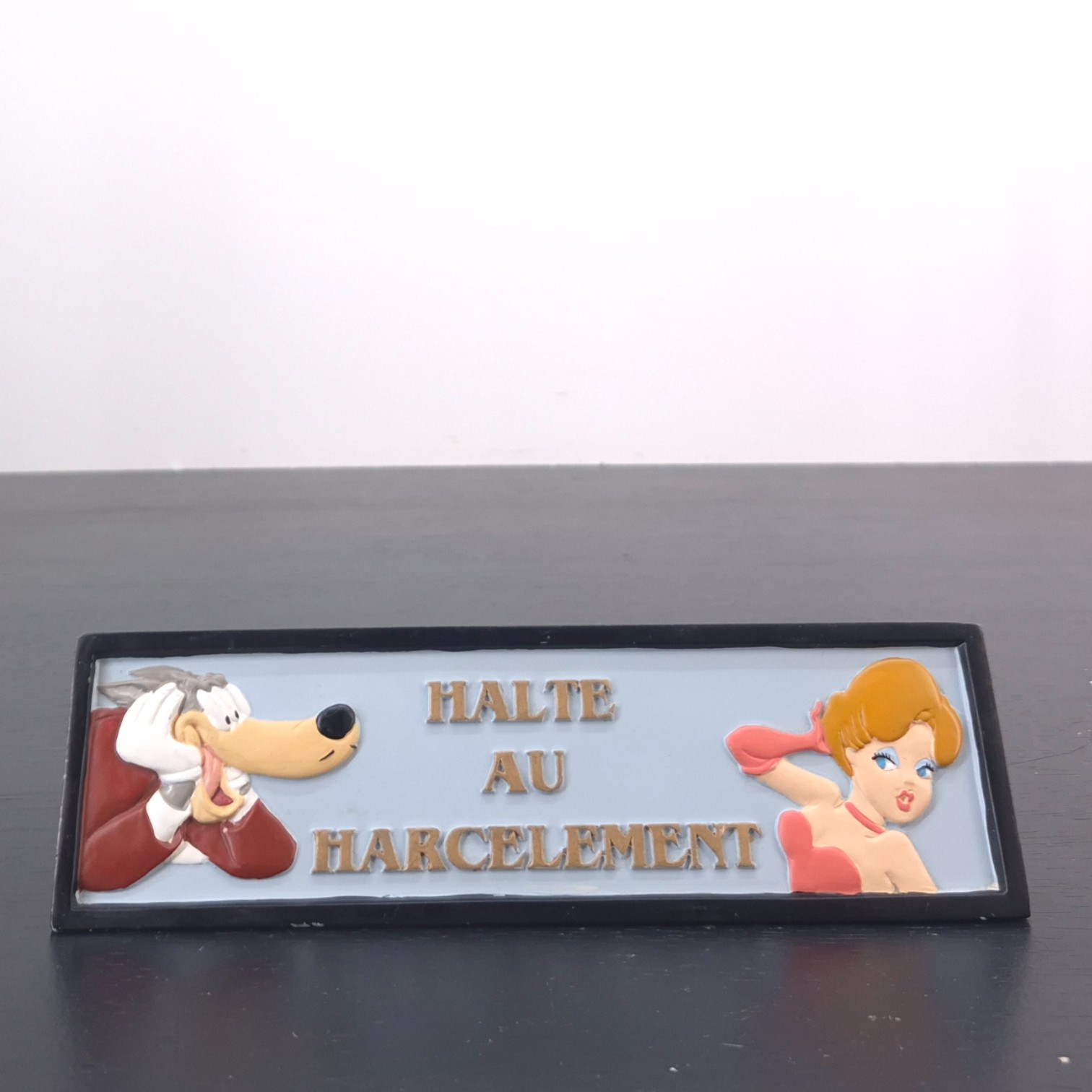 Vintage reversible desk sign of the Wolf and the Girl Avery, crafted by Tropico Diffusion under Turner Entertainment’s license. Part of Tropico Diffusion’s Avenue of the Stars collection. Dates back to 2003. Crafted from durable resin, it remains in excellent condition. Bring the humor of classic animation to your workspace with this reversible Tex Avery desk sign. Featuring the Wolf and the Girl in three expressive scenes, each side offers a different message: “HALTE AU HARCELEMENT,” “PAUSE,” and “WEEK-END.” Crafted in vibrant relief, it captures the exaggerated expressions and playful wit of Tex Avery’s legendary cartoons. The interchangeable design lets you switch the message to suit your mood — from busy to break time. A rare and collectible piece that adds character, color, and a wink of nostalgia to any desk or display.