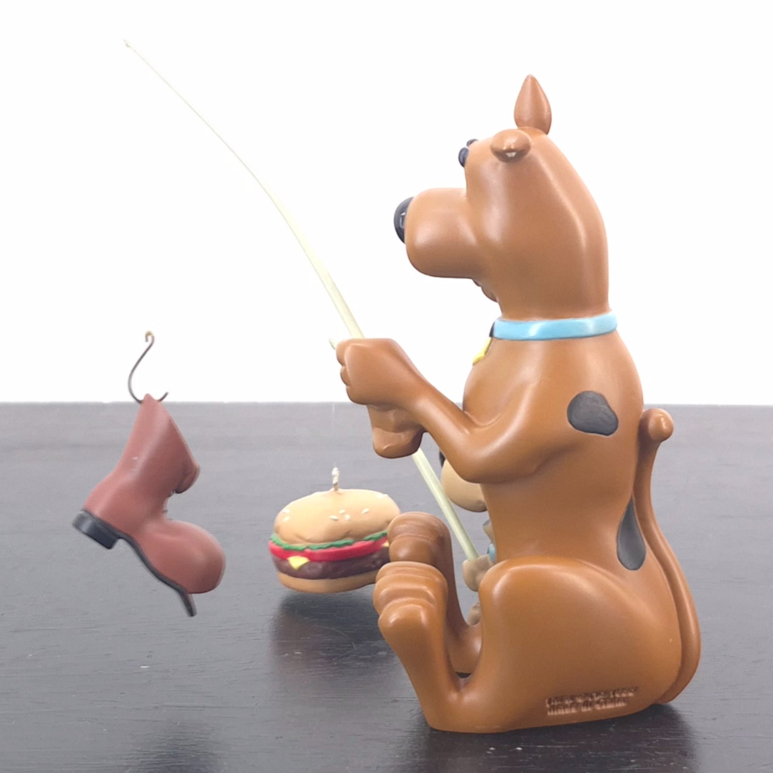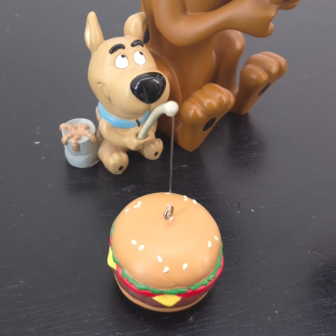 Vintage statue of Scooby-Doo and Scrappy-Doo, crafted by the Warner Bros. Store under Hanna-Barbera’s license. Dates back to 1998. Crafted from durable resin, it remains in very good condition. Reel in some laughter with this delightful Scooby-Doo and Scrappy-Doo fishing figurine! Capturing the duo in a hilarious scene, Scrappy proudly hooks a juicy burger while Scooby looks puzzled with a worn-out boot on his line. The sculpt is bursting with personality — from Scooby’s classic wide-eyed expression to Scrappy’s eager determination. Crafted with vibrant colors and playful detail, it perfectly embodies the charm and humor of the beloved Hanna-Barbera series. A fun and nostalgic collectible that adds a dose of mystery-solving mischief to any display shelf.