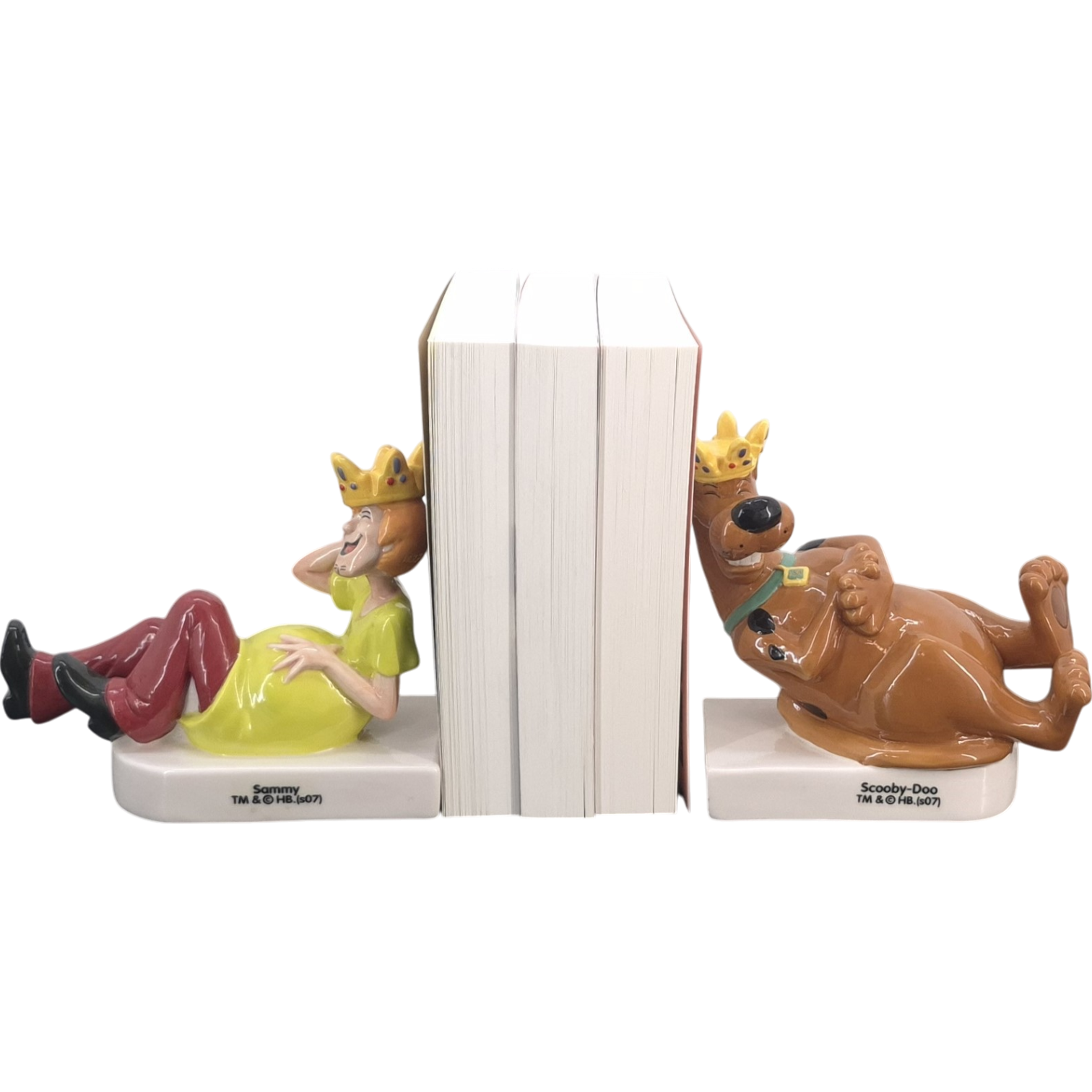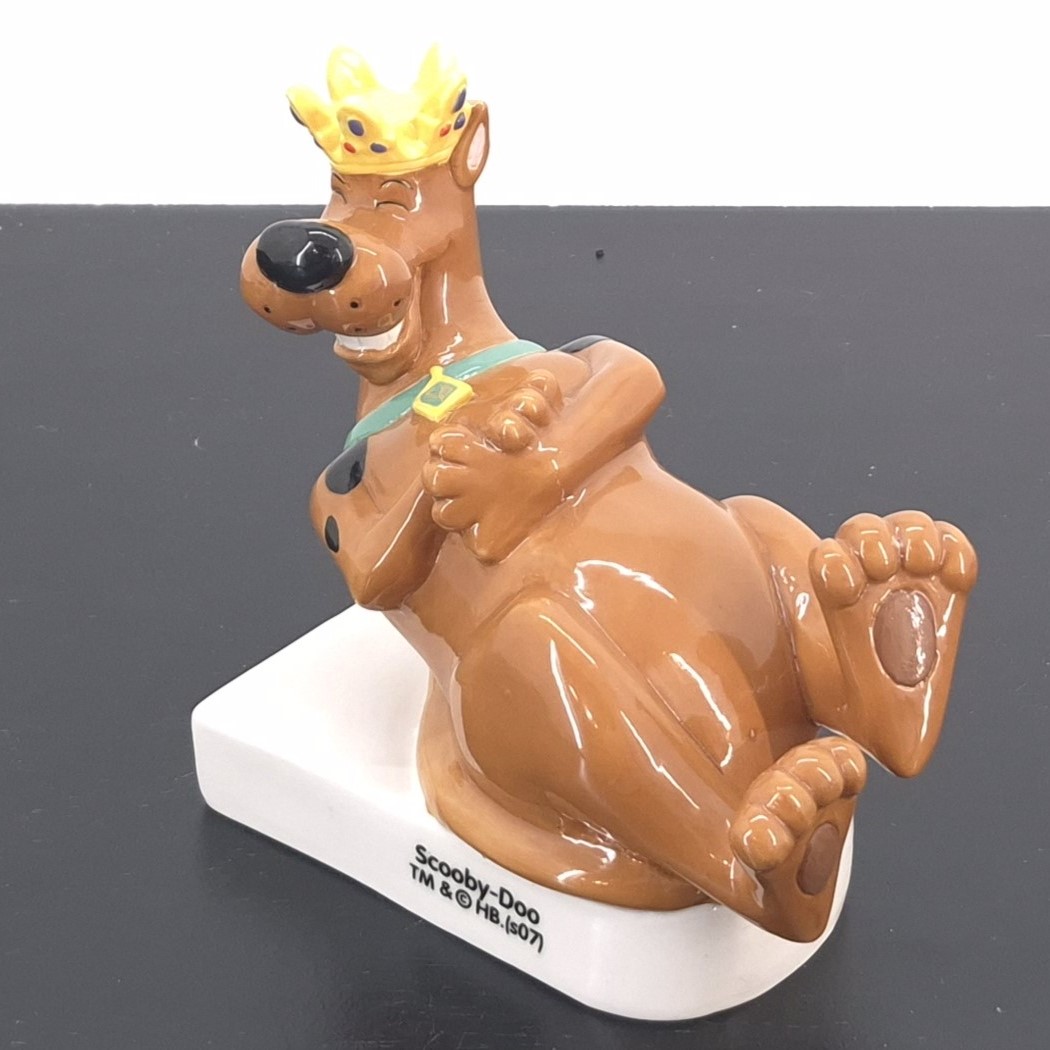 Vintage bookend of Scooby-Doo, crafted under Hanna-Barbera’s license. Dates back to 2007. Crafted from durable ceramic, it remains in excellent condition. Add a playful touch to your bookshelf with this delightful Scooby-Doo bookend! Featuring Scooby-Doo laughing and rolling on the ground with a golden crown perched on his head, this bookend brings the beloved character’s humor and charm to your home. Perfect for fans of the classic cartoon, it not only keeps your books in place but also adds a whimsical and nostalgic element to your decor. Celebrate the adventures of Scooby-Doo with this enchanting and practical piece!
