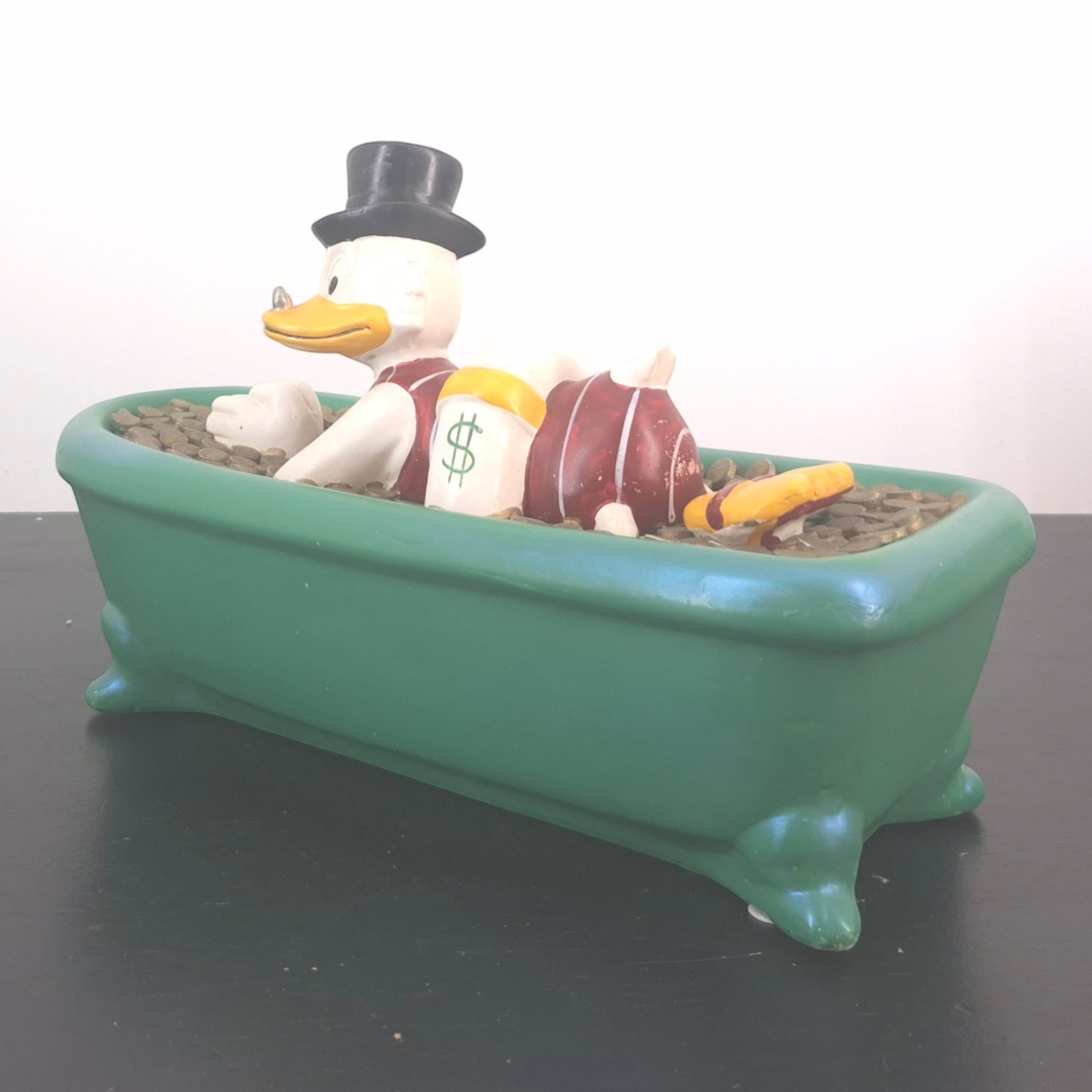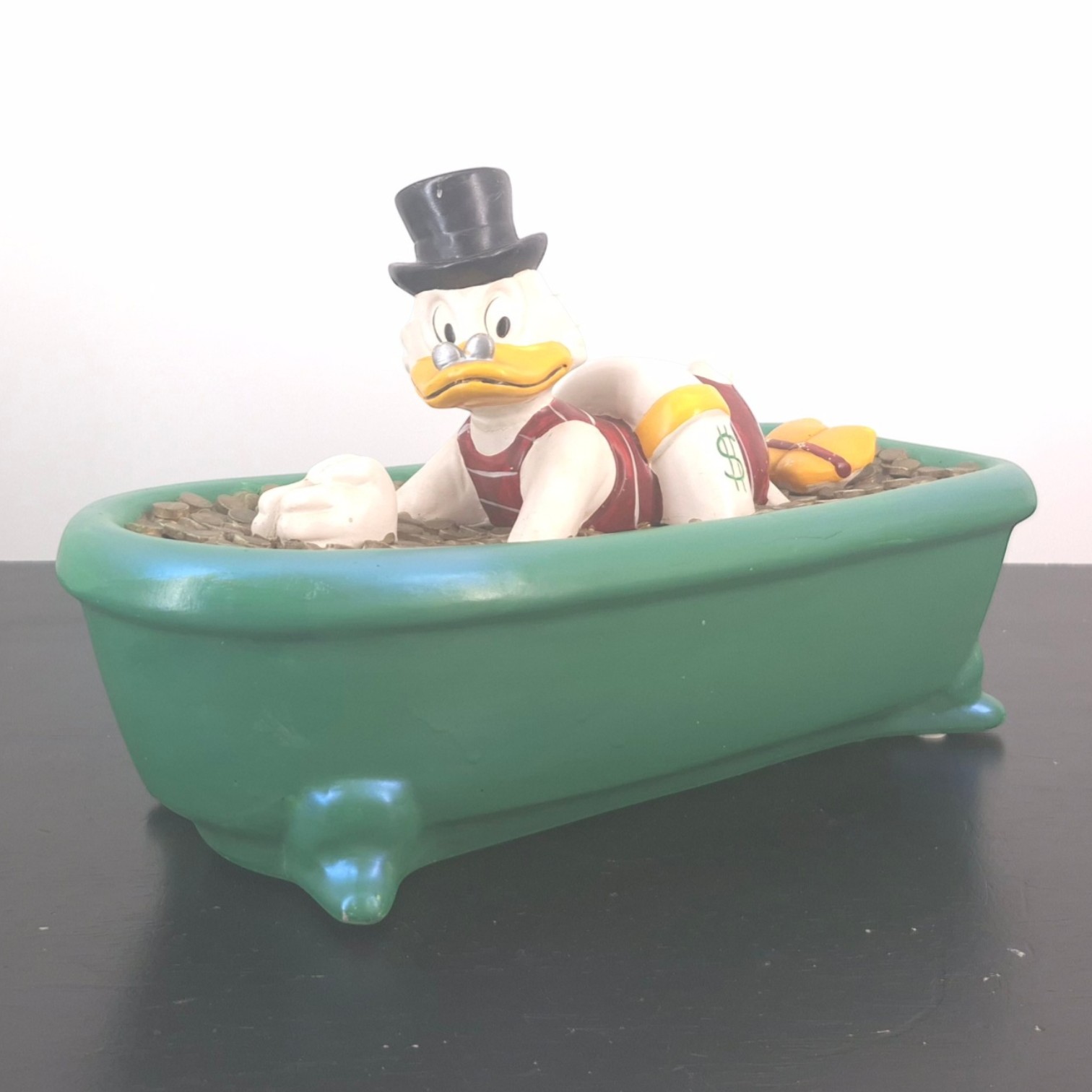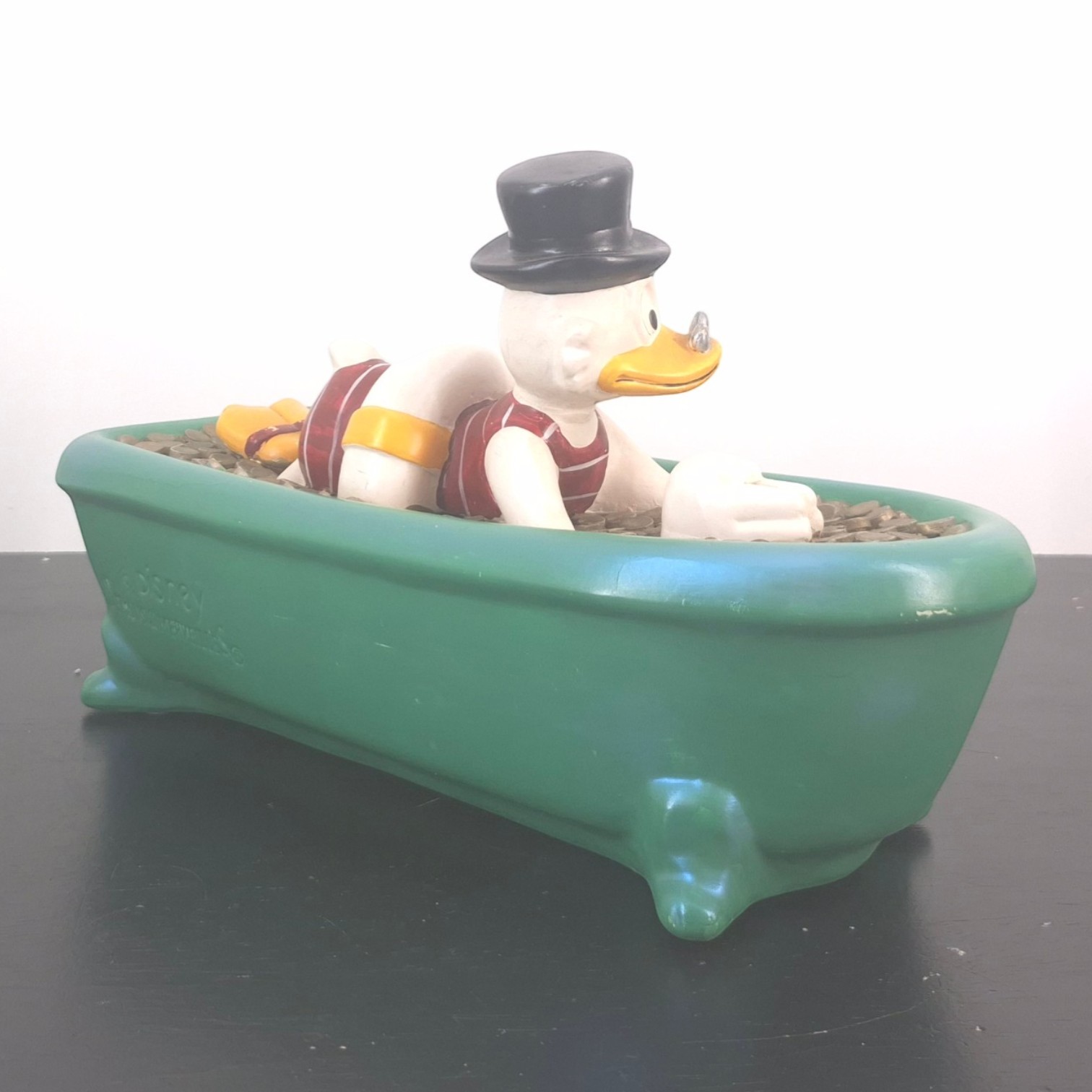 A vintage lamp lamp Scrooge McDuck, crafted by Demons and Merveilles under Walt Dinsey’s license. Dates back to 1980s. Made from durable ceramic, it remains in good condition. This playful Scrooge McDuck collectible figurine shows Disney’s richest duck diving into a bathtub filled with gold coins. The scene perfectly captures Scrooge’s legendary love for wealth and treasure. Wearing his iconic top hat and bathing suit, the sculpture reflects the humorous spirit of the character while highlighting the detailed coin-filled base. A charming addition for collectors of Disney collectibles and Scrooge McDuck memorabilia.