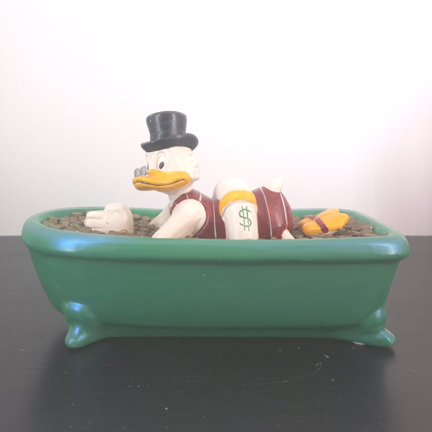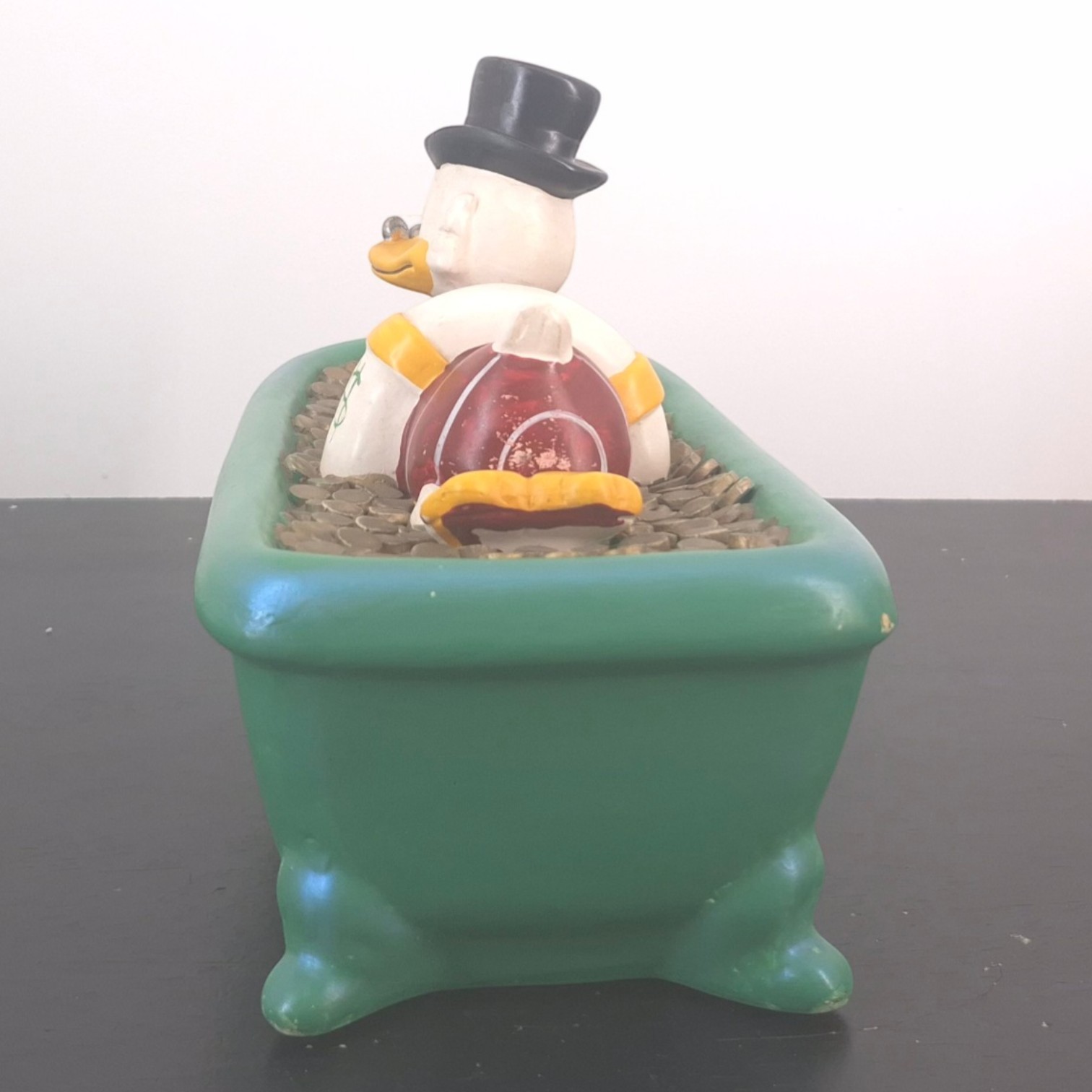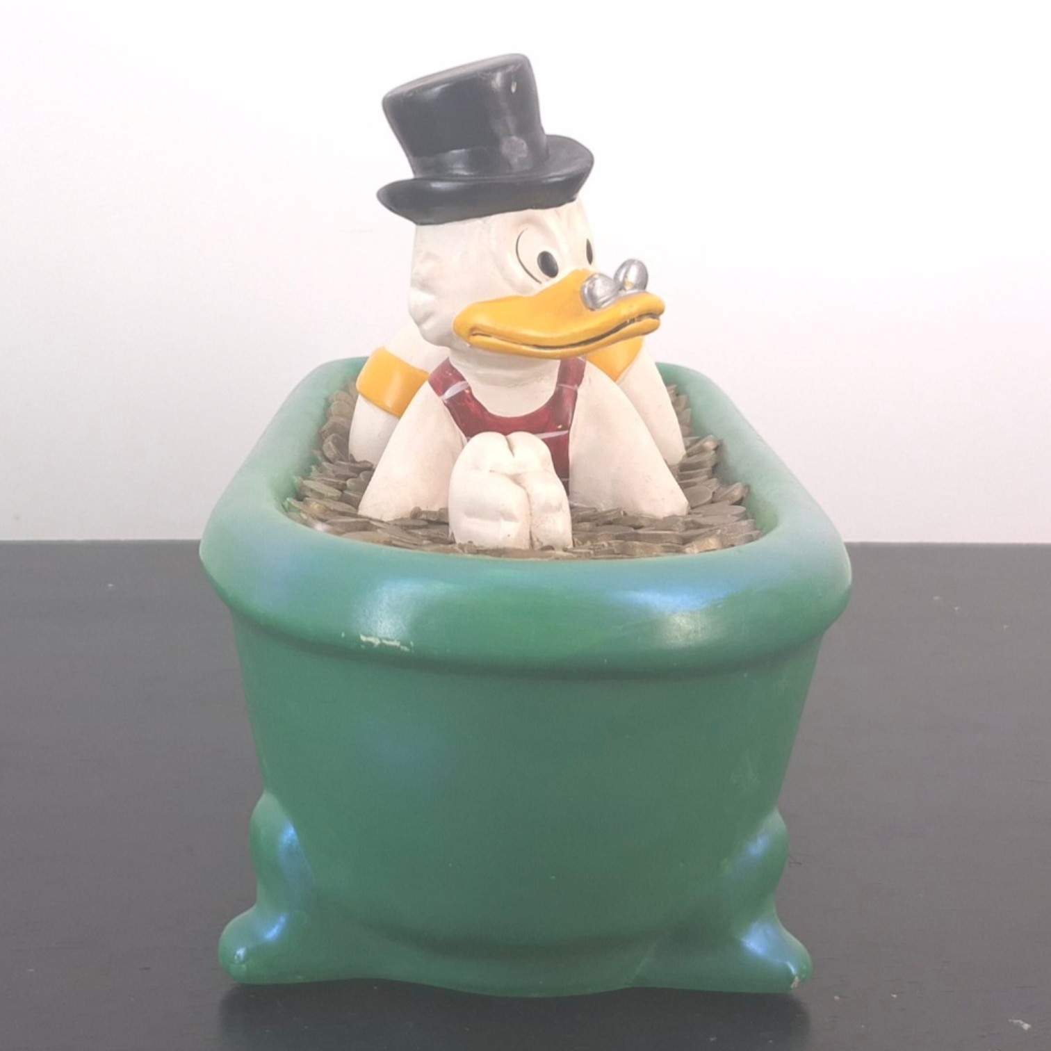 A vintage lamp lamp Scrooge McDuck, crafted by Demons and Merveilles under Walt Dinsey’s license. Dates back to 1980s. Made from durable ceramic, it remains in good condition. This playful Scrooge McDuck collectible figurine shows Disney’s richest duck diving into a bathtub filled with gold coins. The scene perfectly captures Scrooge’s legendary love for wealth and treasure. Wearing his iconic top hat and bathing suit, the sculpture reflects the humorous spirit of the character while highlighting the detailed coin-filled base. A charming addition for collectors of Disney collectibles and Scrooge McDuck memorabilia.