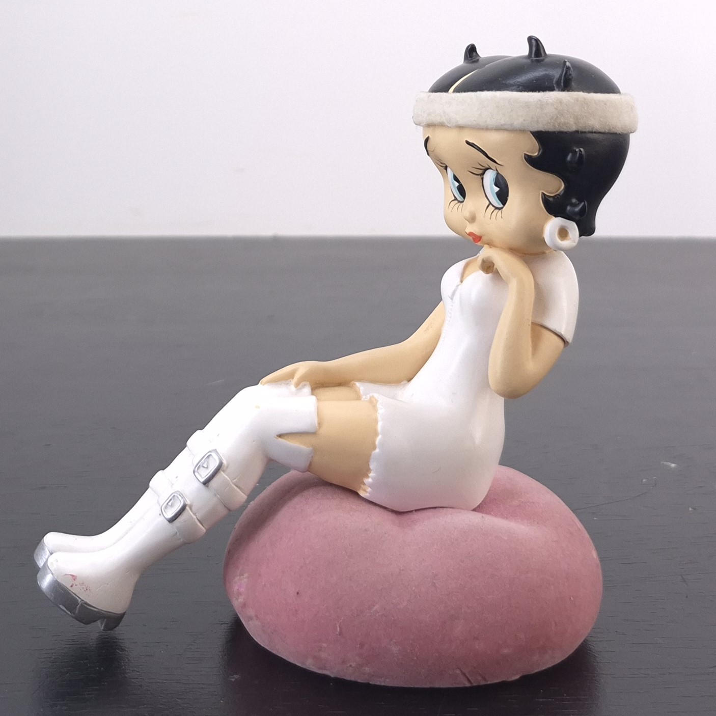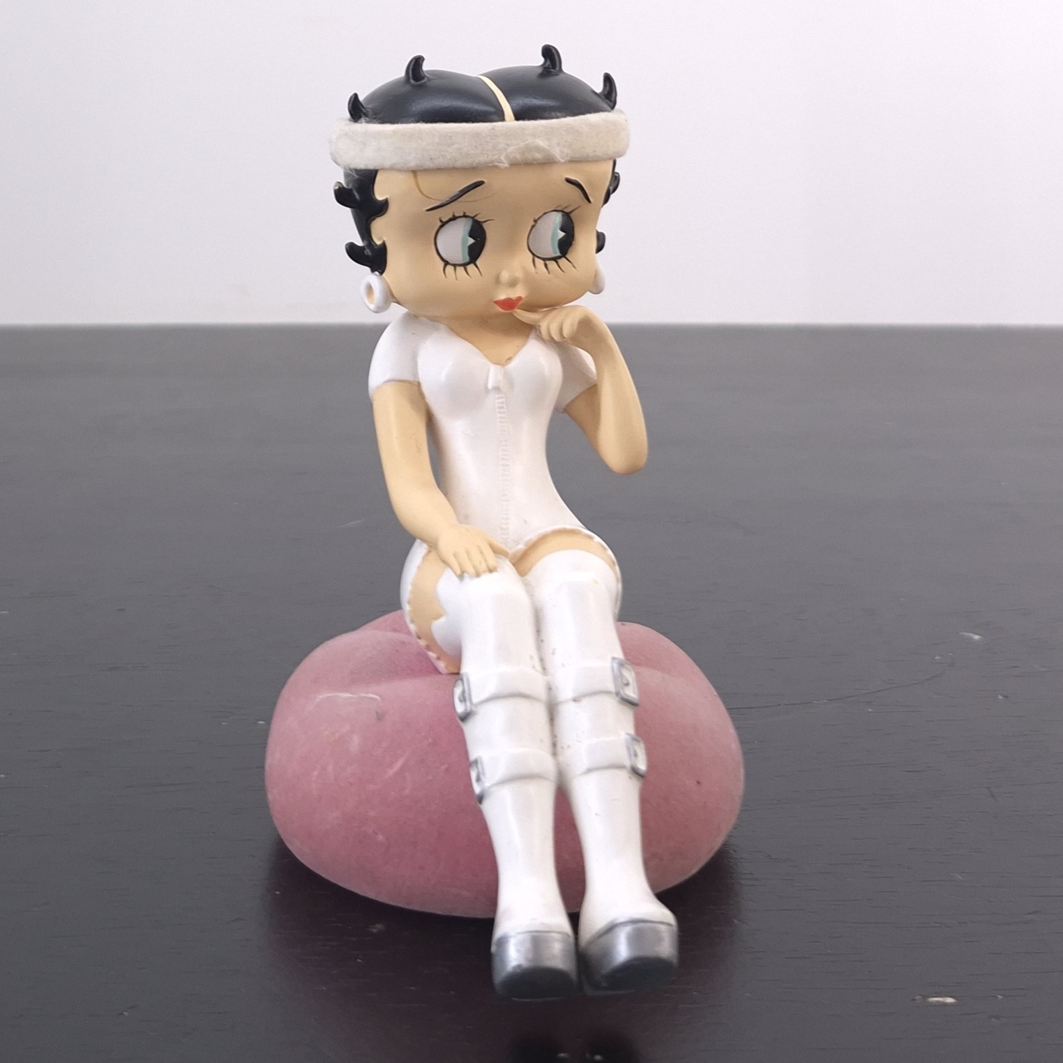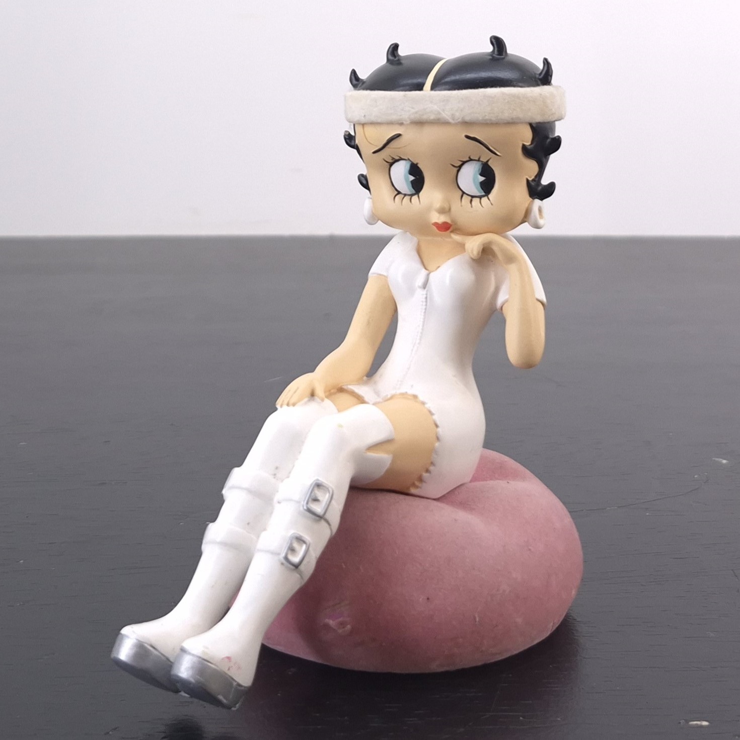 Vintage figurine of Betty Boop, crafted by Tropico Diffusion under King Features’ license. Part of Tropico Diffusion’s Avenue of the Stars collection. Dates back to 2005. Crafted from durable resin, it remains in good condition. Bring vintage charm to your collection with this delightful Betty Boop Sitting Figurine in White Outfit. Featuring Betty in a stylish mini-dress, knee-high buckled boots, and a matching headband, she sits gracefully on a soft pink cushion. Perfect for fans of retro animation and timeless collectibles, this piece captures Betty’s playful elegance. A standout addition to any display, it makes a thoughtful gift or a treasured keepsake. Don’t miss the chance to own a piece of Betty Boop nostalgia!