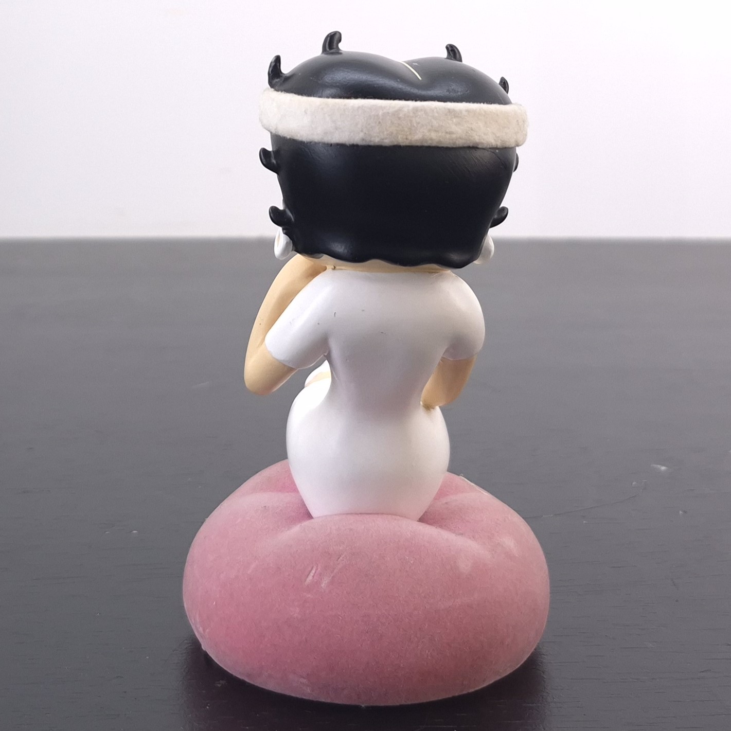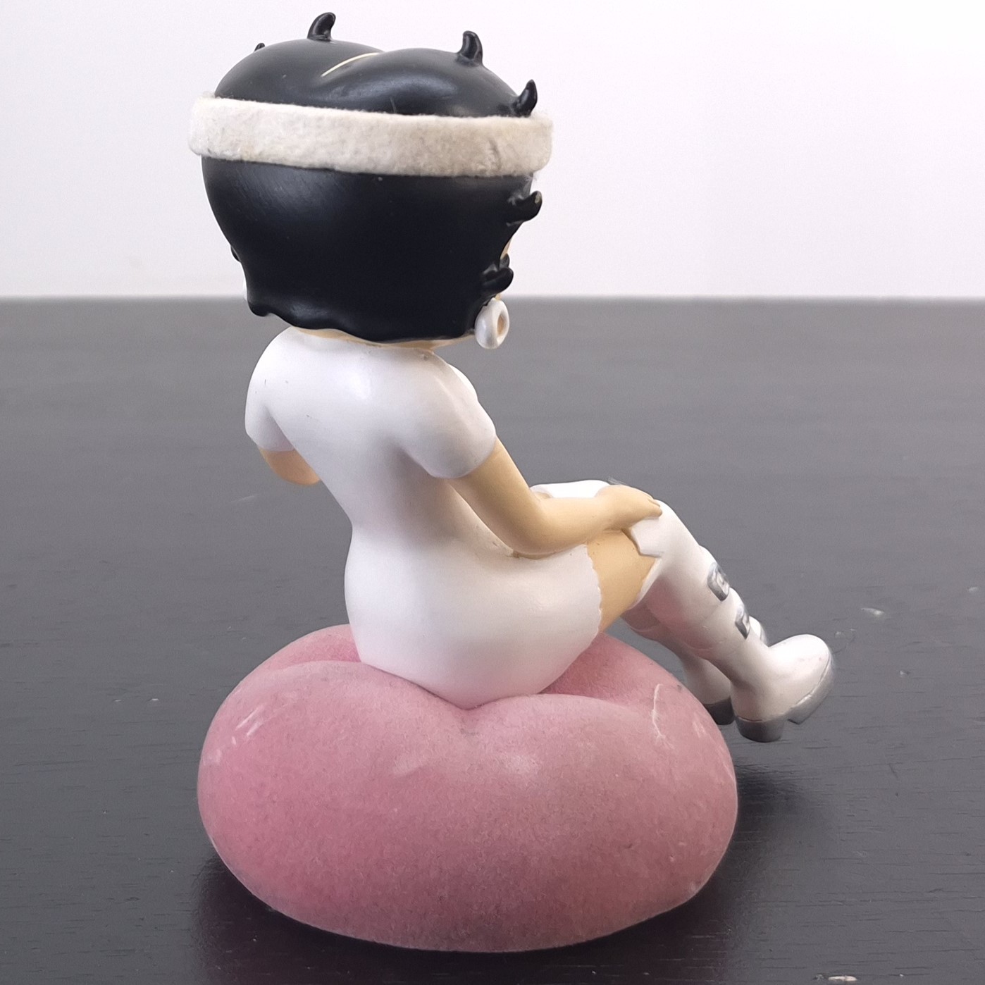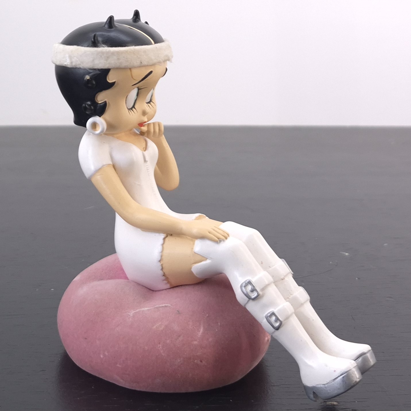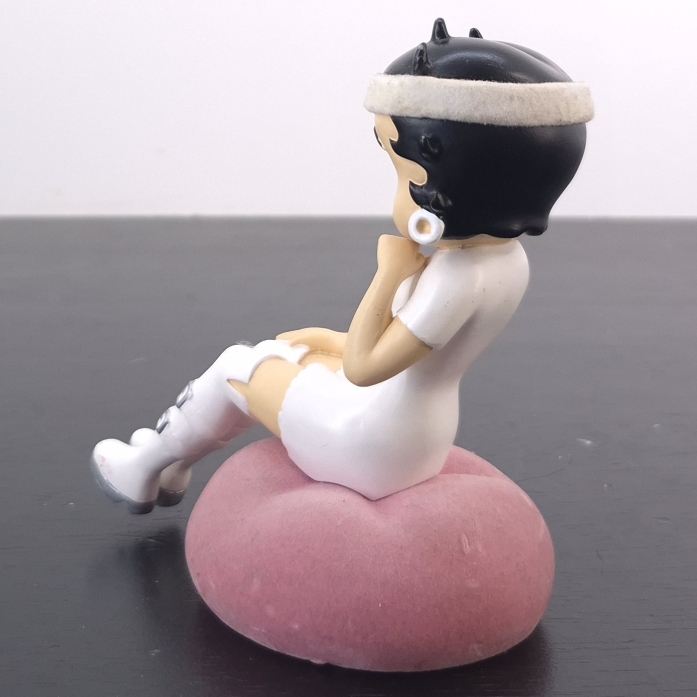 Vintage figurine of Betty Boop, crafted by Tropico Diffusion under King Features’ license. Part of Tropico Diffusion’s Avenue of the Stars collection. Dates back to 2005. Crafted from durable resin, it remains in good condition. Bring vintage charm to your collection with this delightful Betty Boop Sitting Figurine in White Outfit. Featuring Betty in a stylish mini-dress, knee-high buckled boots, and a matching headband, she sits gracefully on a soft pink cushion. Perfect for fans of retro animation and timeless collectibles, this piece captures Betty’s playful elegance. A standout addition to any display, it makes a thoughtful gift or a treasured keepsake. Don’t miss the chance to own a piece of Betty Boop nostalgia!
