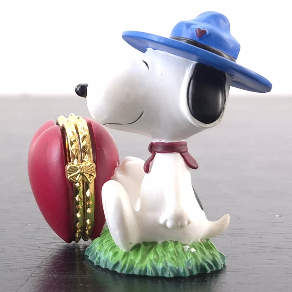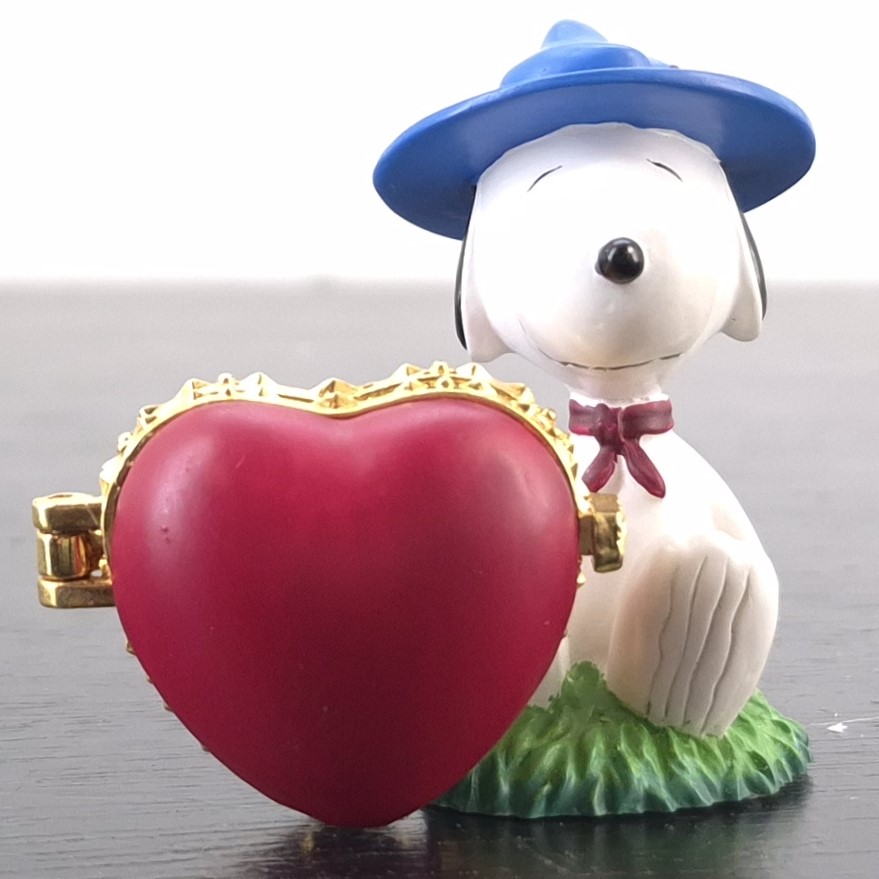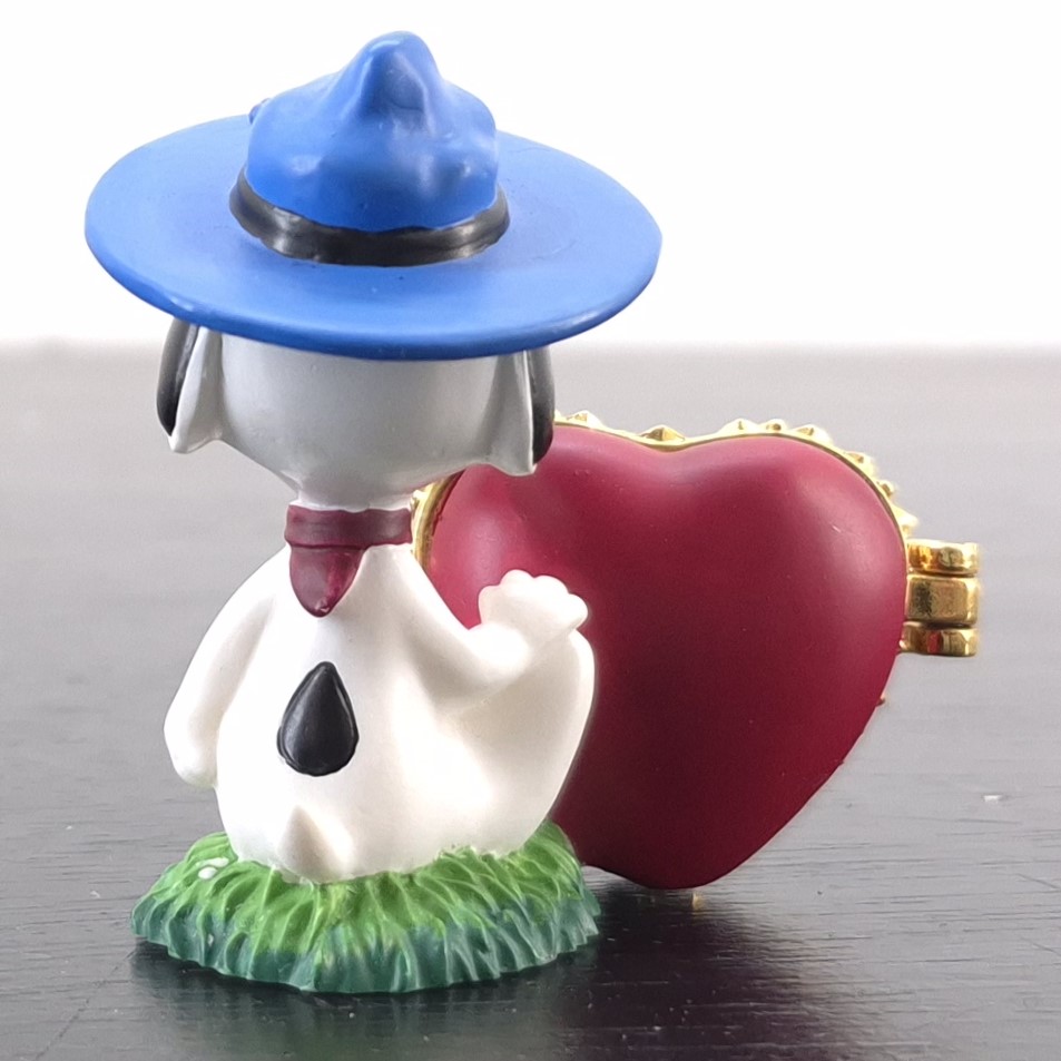 Vintage figurine featuring Snoopy holding a heart shaped locket, produced by Westland Giftware.