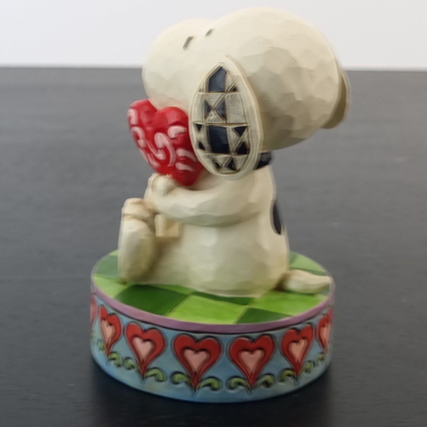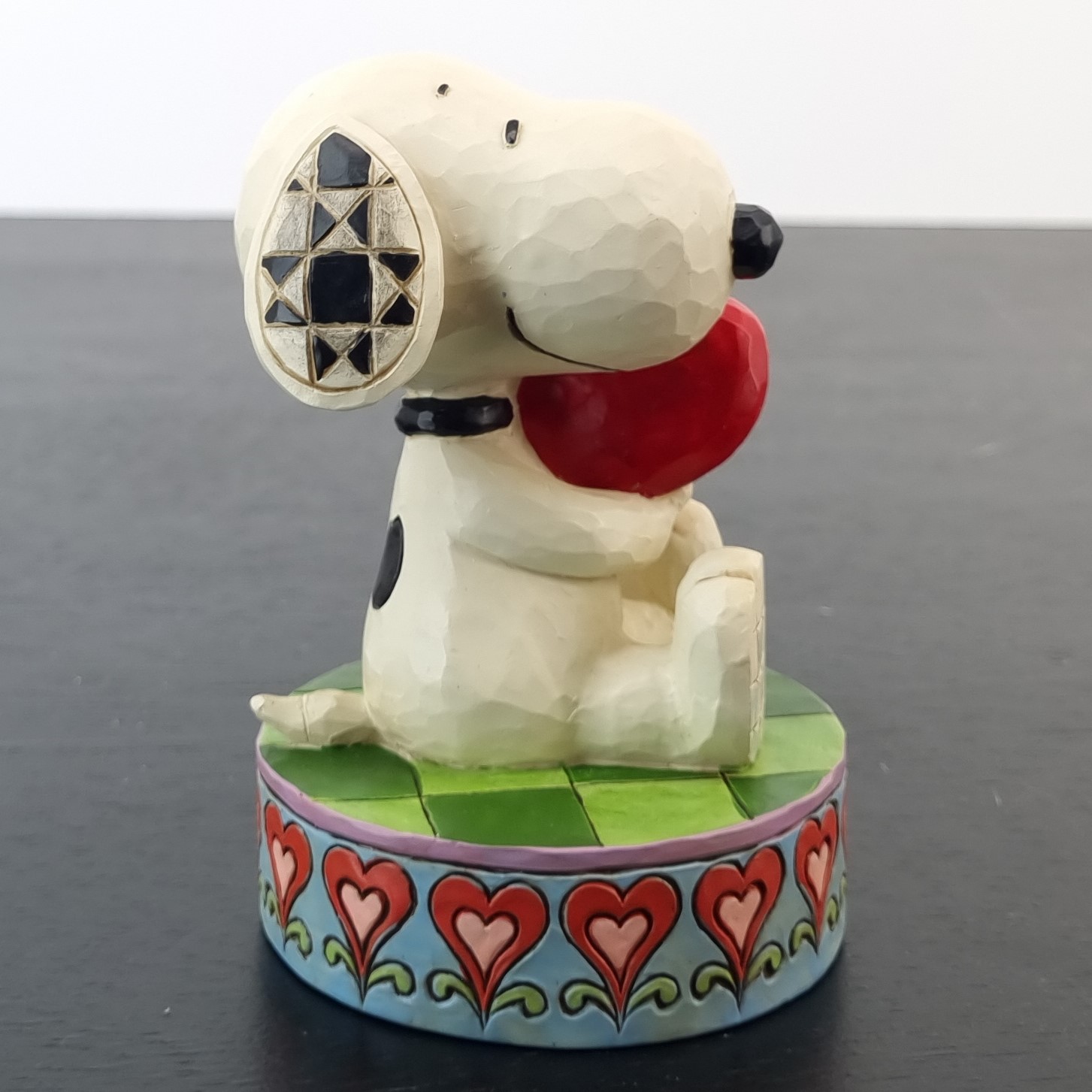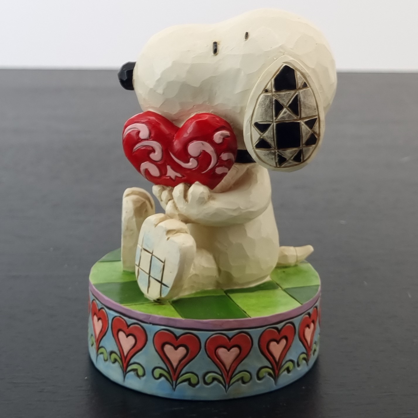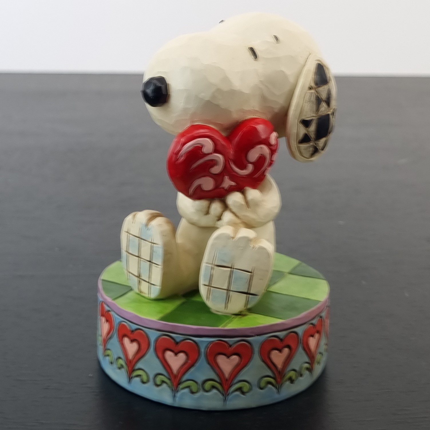 This unique figurine from Snoopy was sculpted by Jim Shore under Peanuts Worldwide’s license. It was taken in production by Enesco for their Peanuts Traditions collection. Dates back to 2015. Crafted from durable stone resin, it remains in excellent condition. Celebrate the timeless charm of Peanuts with this adorable Snoopy figurine, holding a heart. Perfect for fans of all ages, this piece captures Snoopy’s endearing personality and adds a touch of love to any collection.