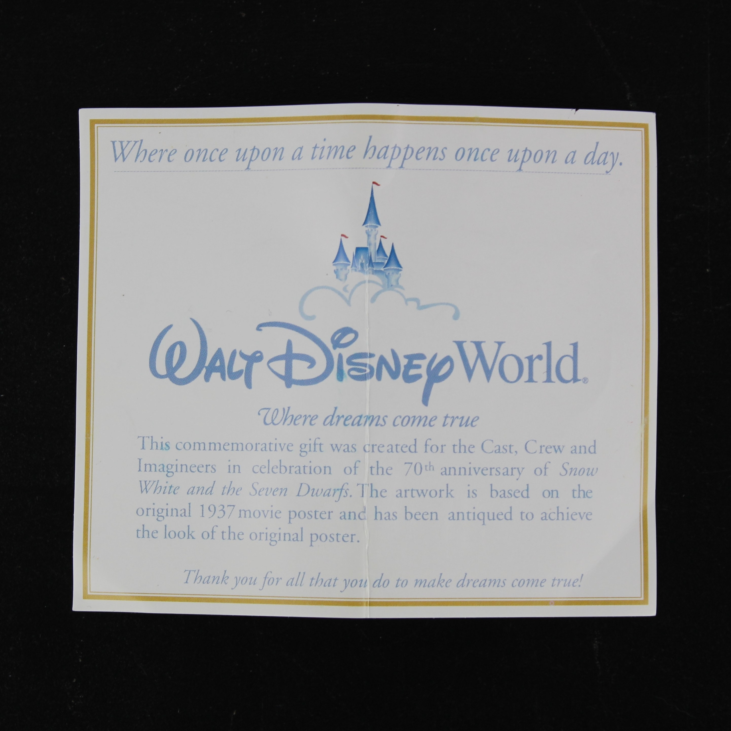 Thism commemorative gift was created for the Cast, Crew and Imagineers in celebration of the 70th anniversary of Snow White and the Seven Dwarfs. The artwork is based on the original 1937 movie poster and has been antiqued to achieve the look of the original poster.