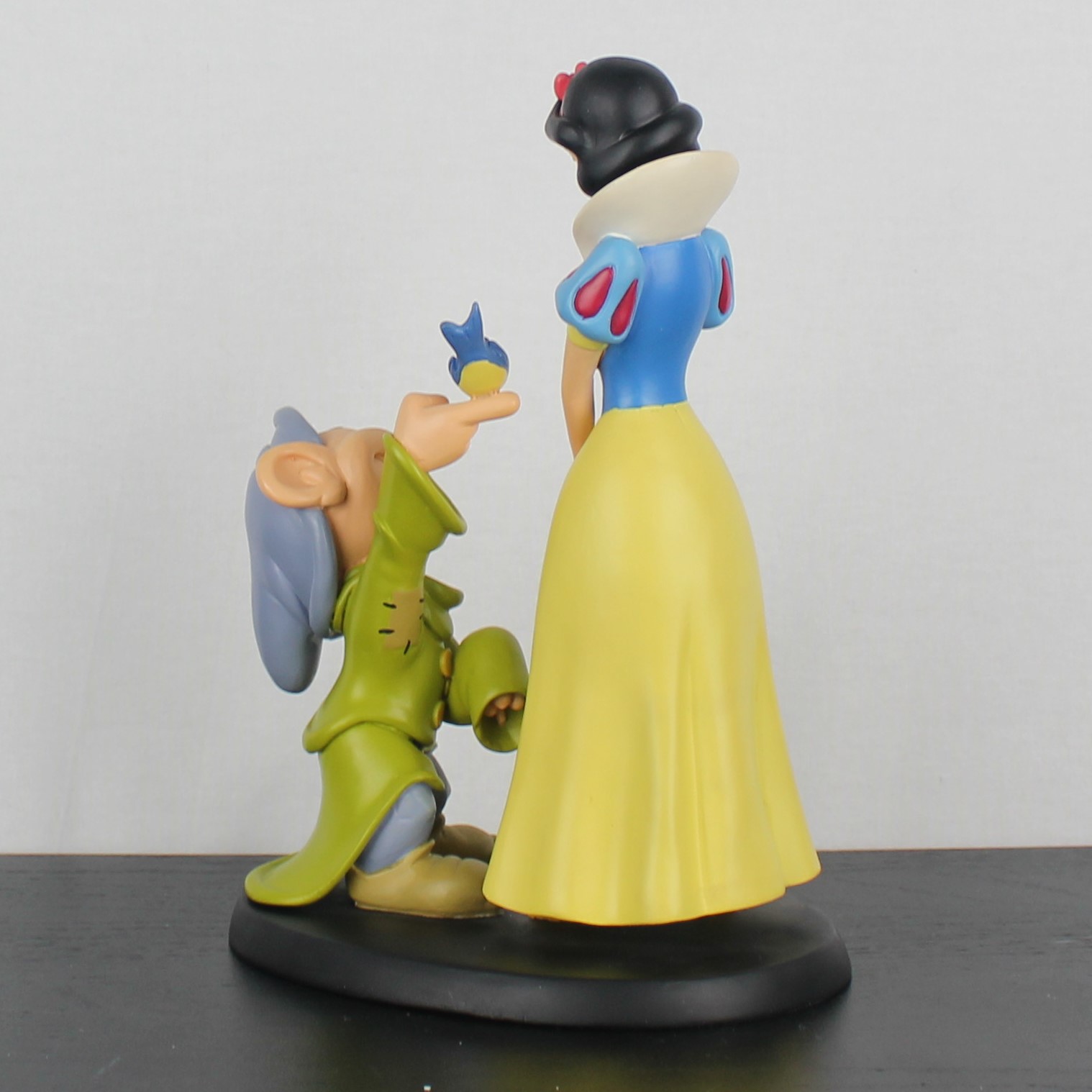 This statue from Snow White with Dopey was sculpted by Peter Mook under Walt Disney’s license. It was taken in production by Rutten. Dates back to the 1990s. Crafted from durable resin, it remains in excellent condition. Capture the enchanting magic of Disney with this delightful statue of Dopey showing Snow White a singing bird perched on his finger. Perfect for any fan, this piece beautifully illustrates the innocence and wonder of their iconic friendship. Add a touch of fairy tale charm to your collection, bringing the beloved characters and their whimsical world into your home!
