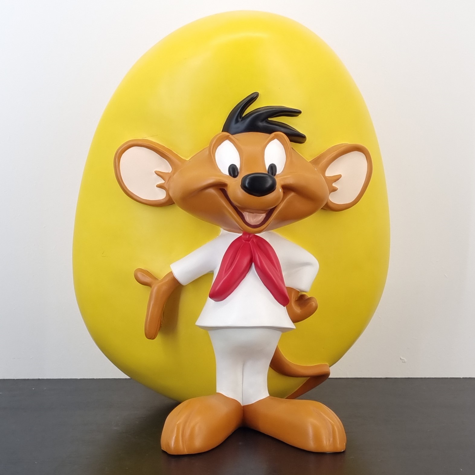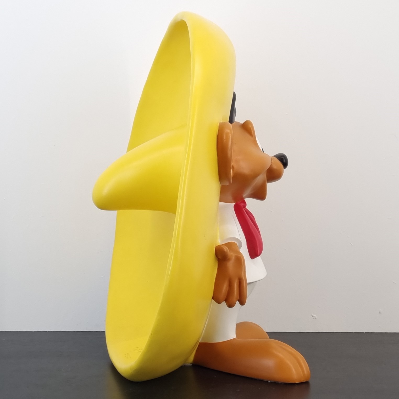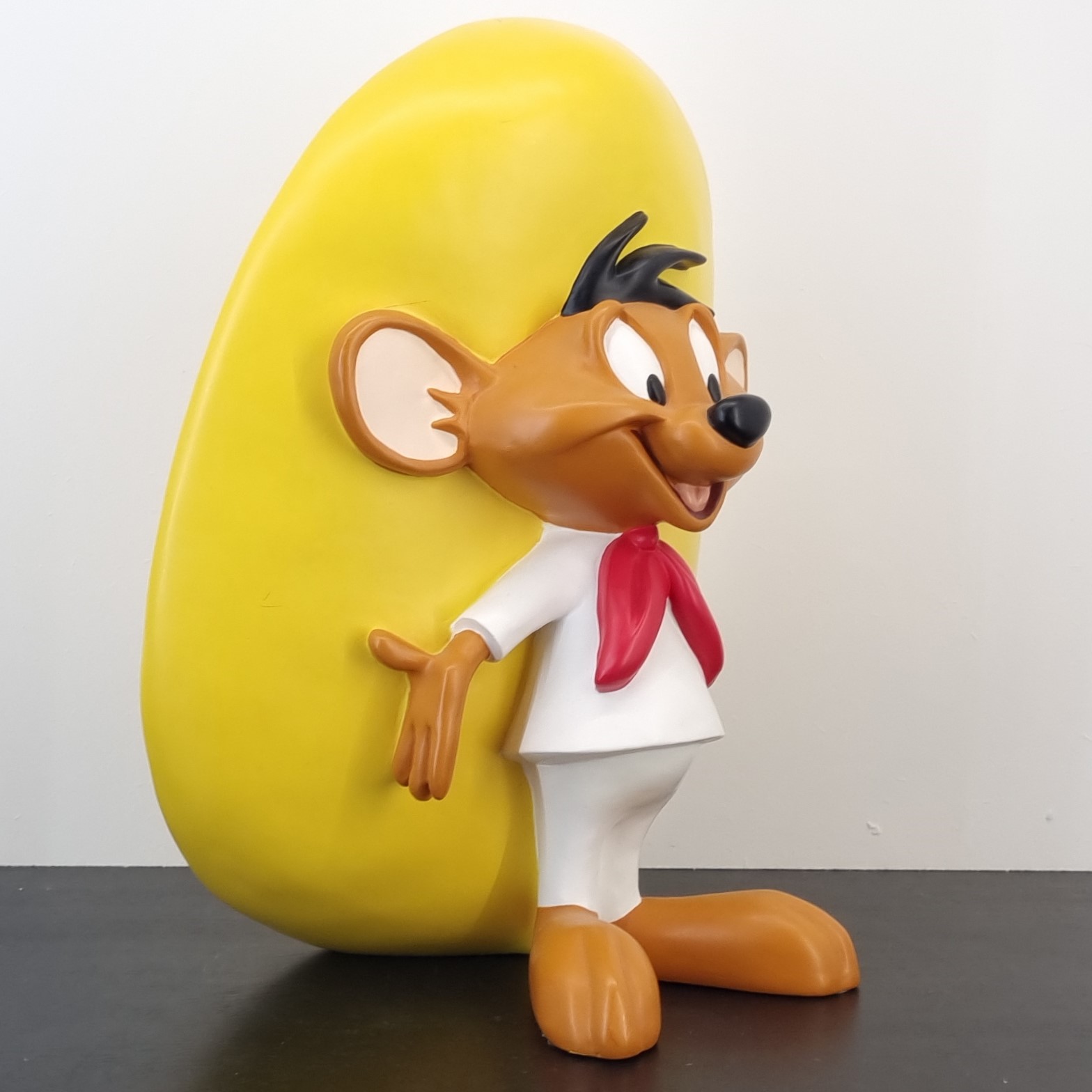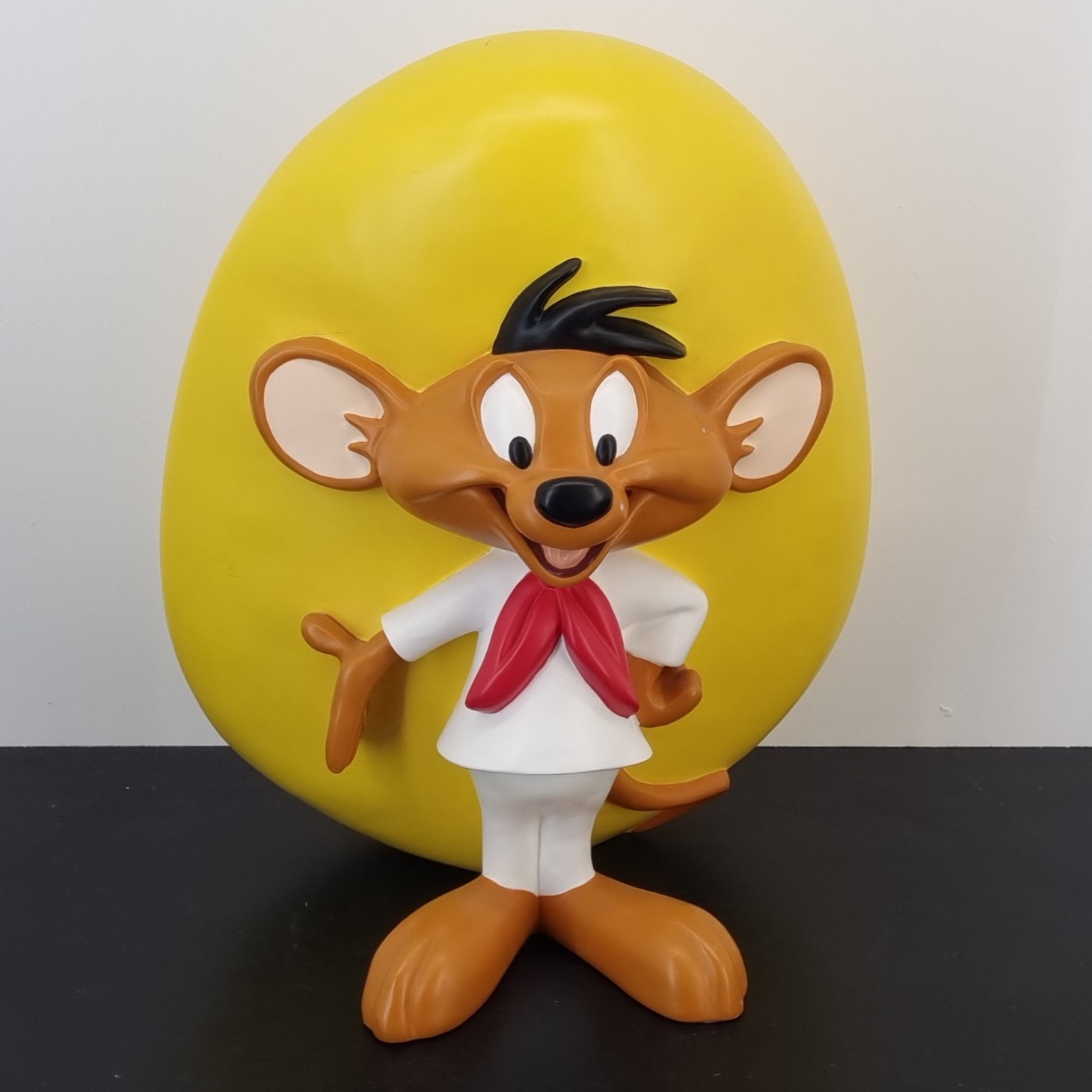 This vintage statue from Speedy Gonzales was sculpted under Warner Bros.’ license. It was taken in production for the Warner Bros. Studio Store. Dates back to 1996. Crafted from durable resin, it remains in very good condition. Bring the charm of Warner Bros. nostalgia to life with a grand statue of Speedy Gonzales, standing happily and full of vibrant energy. This iconic piece, crafted for the retired Warner Bros Studio Store, captures the quick-witted mouse in an unforgettable pose. A must-have for collectors and fans, it’s the perfect centerpiece for any themed space or memorabilia collection. Celebrate the legacy of Speedy Gonzales and let his cheerful spirit keep the good times rolling!