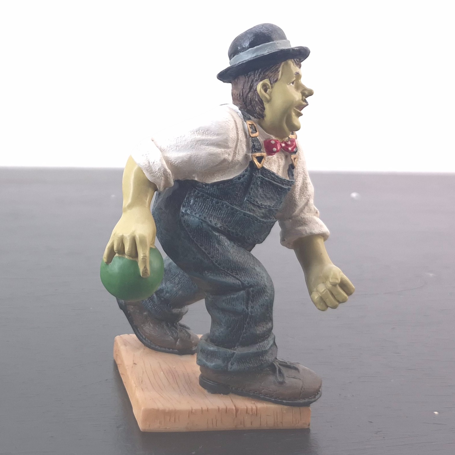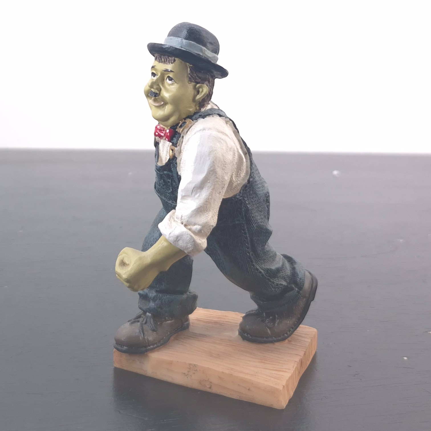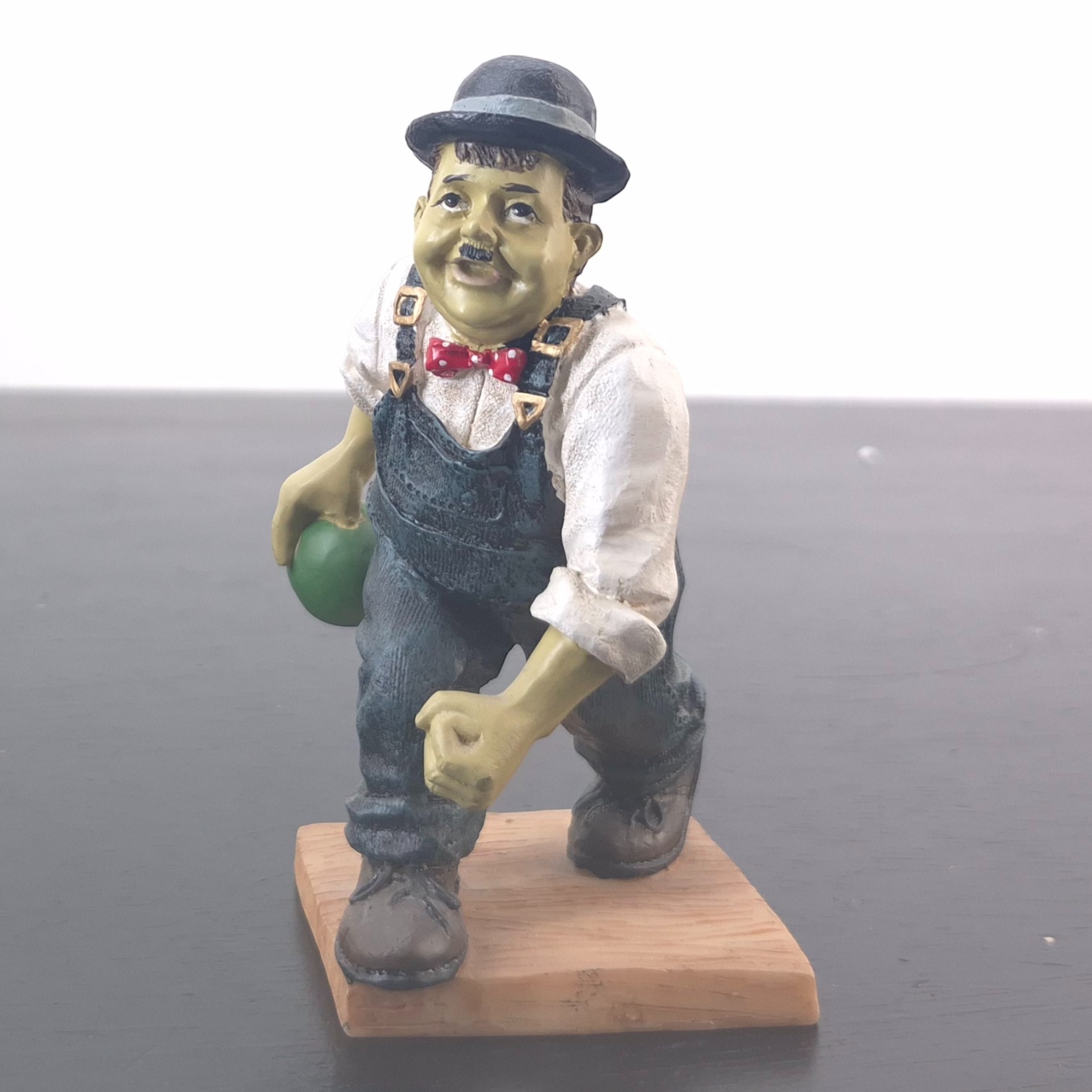 This vintage Oliver Hardy figurine was sculpted under license from Larry Harmon Pictures Corporation. Dates back to the 1990s. Made from durable resin, it remains in excellent condition. Oliver Norvell Hardy carefully preparing to roll a bowling ball, his posture full of confidence and quiet determination. Hardy’s composed expression and deliberate stance perfectly reflect his self-assured personality, even in situations destined to go wrong. The sculpt highlights his iconic bowler hat, formal shirt, bow tie, and oversized overalls, ensuring immediate recognition.