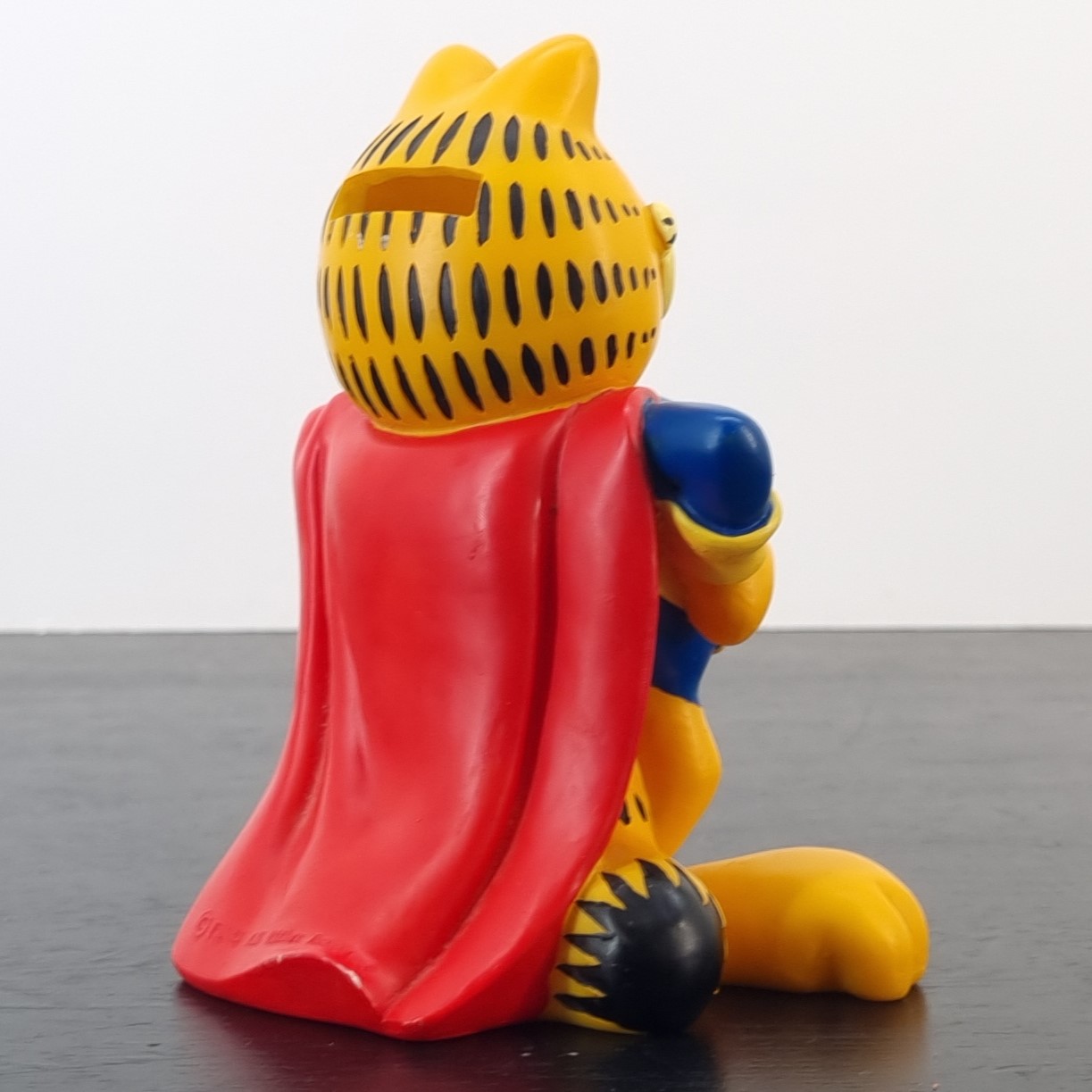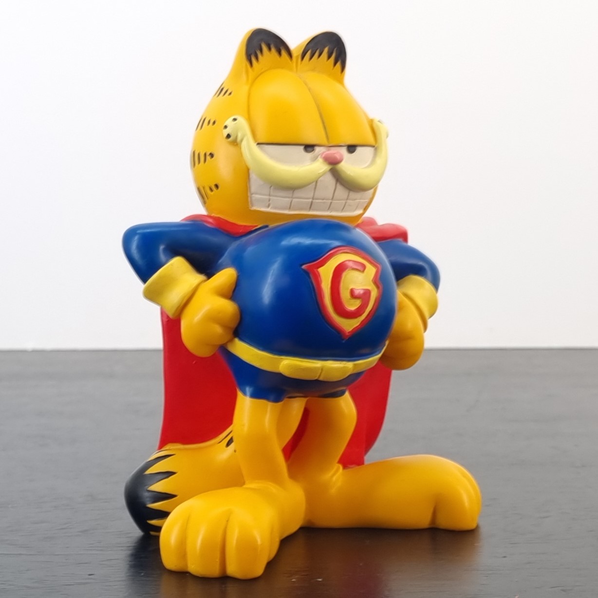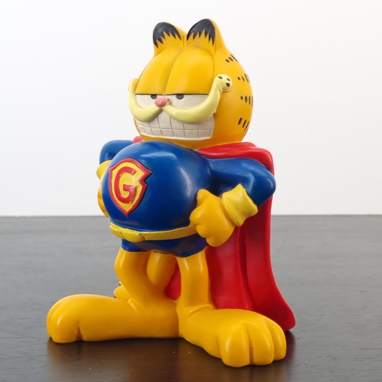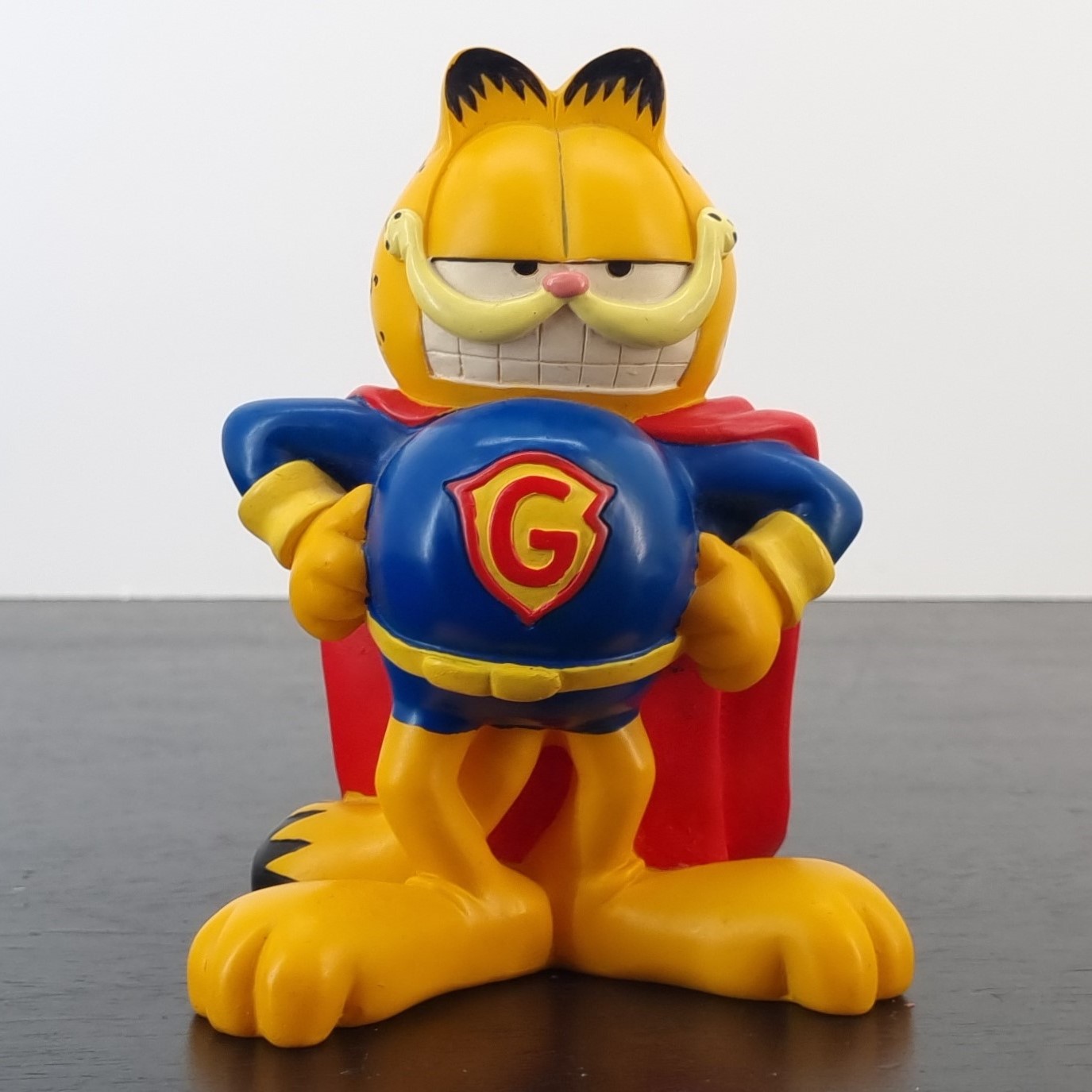 Vintage money box of Garfield, crafted by Paws. Dates back to the 1990s. Crafted from durable PVC, it remains in very good condition. Save your coins in style with this fun money box featuring Garfield dressed as Super Garfield! With his iconic lazy yet heroic expression, this money box is perfect for fans of the lasagna-loving cat. It’s a quirky and functional piece that adds a touch of humor to any room.