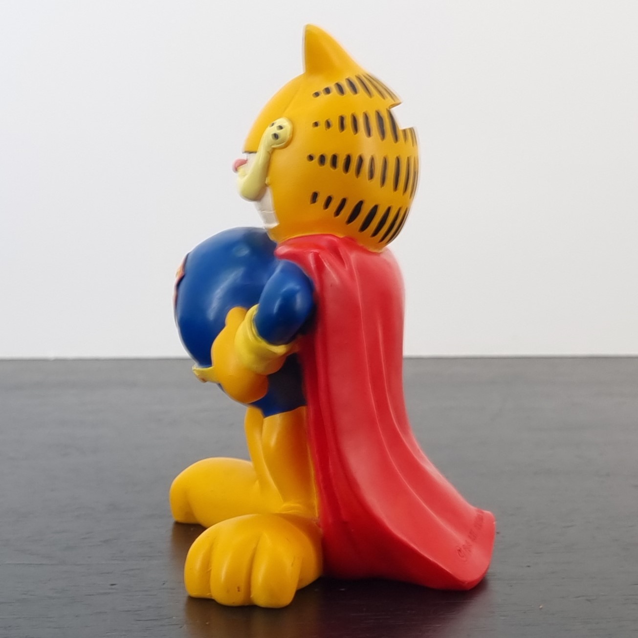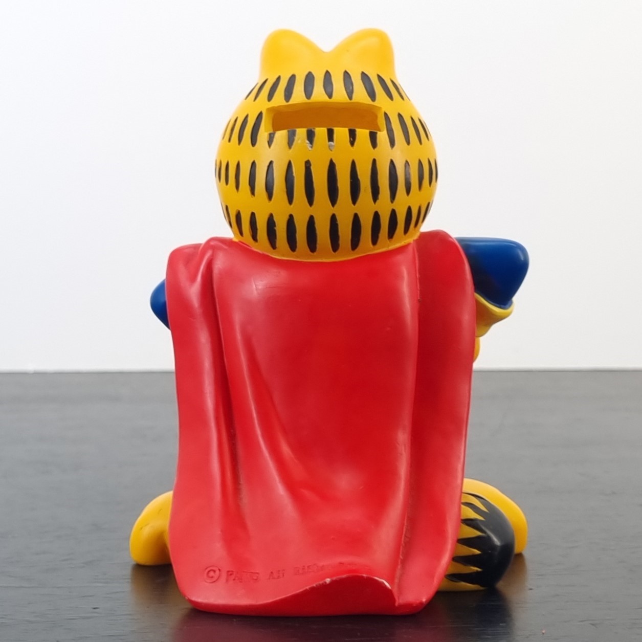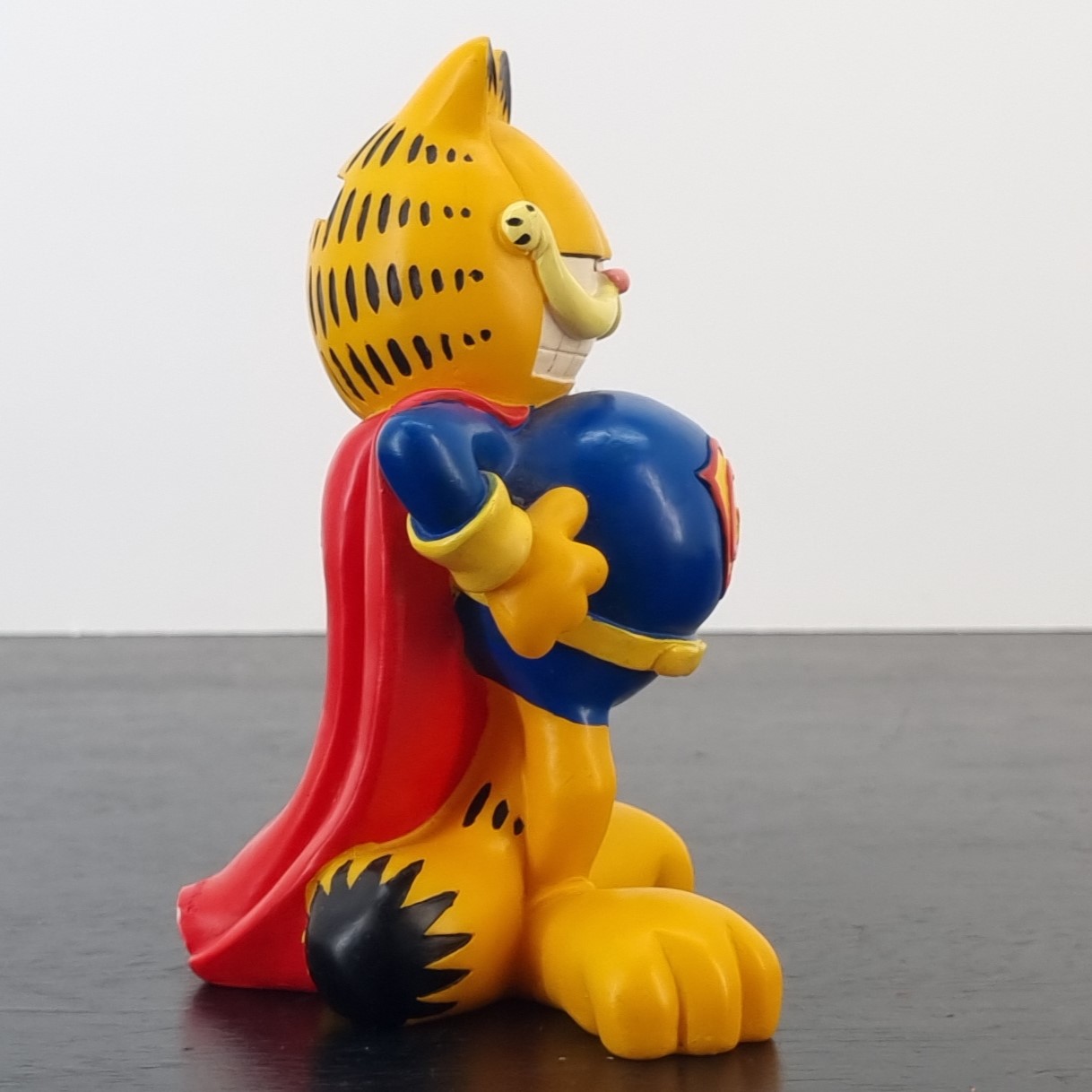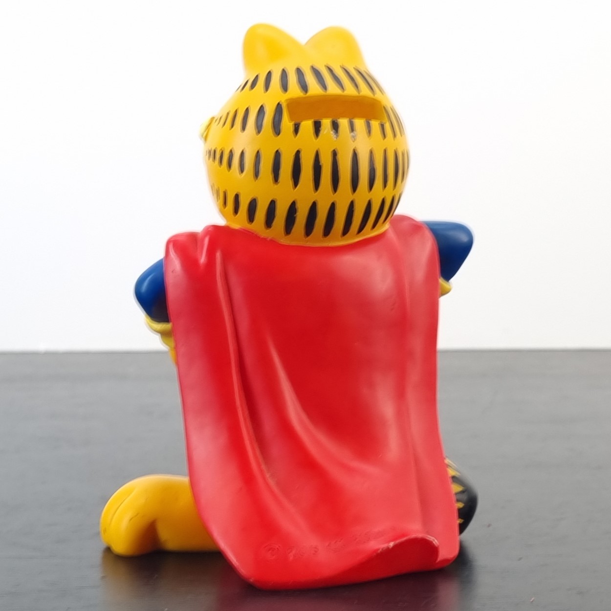 Vintage money box of Garfield, crafted by Paws. Dates back to the 1990s. Crafted from durable PVC, it remains in very good condition. Save your coins in style with this fun money box featuring Garfield dressed as Super Garfield! With his iconic lazy yet heroic expression, this money box is perfect for fans of the lasagna-loving cat. It’s a quirky and functional piece that adds a touch of humor to any room.