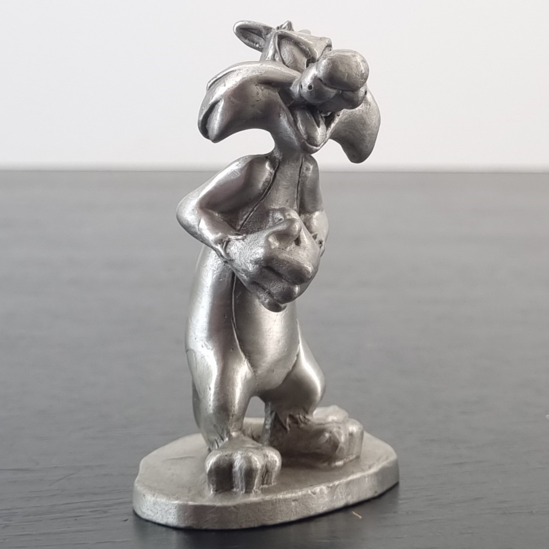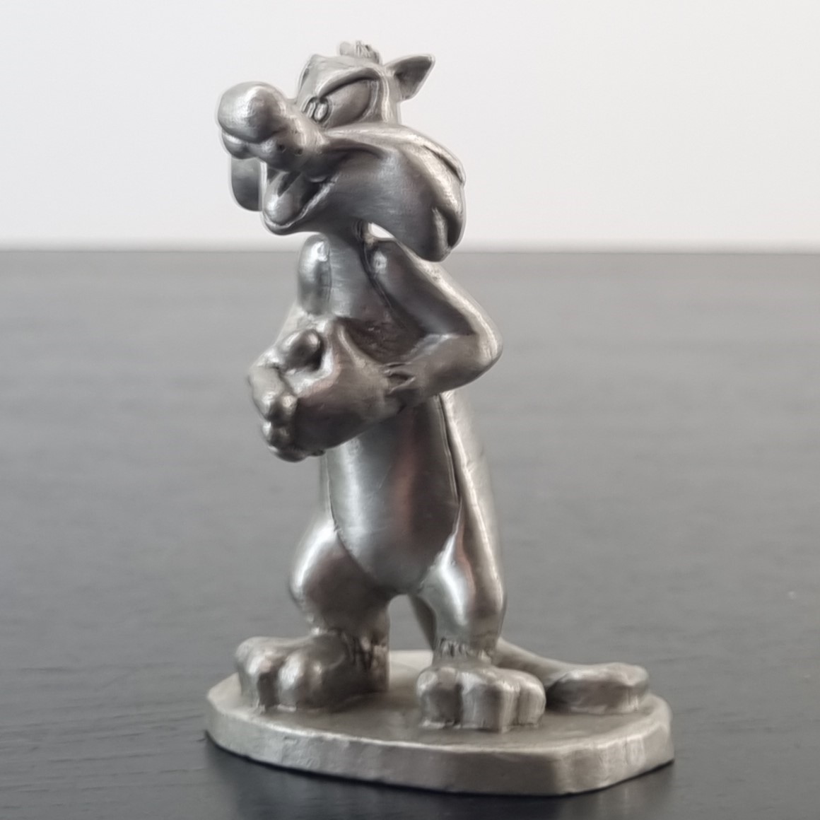 Vintage Pewter figurine of a Sylvester who is rubbing his hands together. It looks like Sylvester is plotting something. This Sylvester collectible figurine was produced by Rawcliffe in the year 1994.