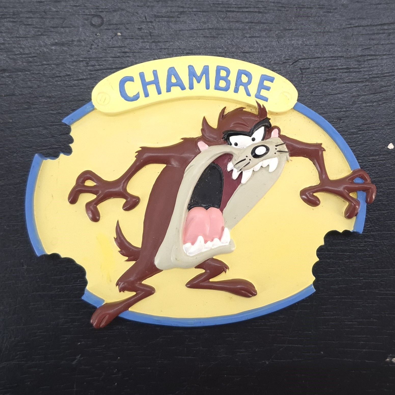Vintage chambre sign of the Tasmanian Devil, crafted by Tropico Diffusion under Warner Bros.’ license. Part of Tropico Diffusion’s Avenue of the Stars collection. Dates back to the 1990s. Crafted from durable resin, it remains in very good condition. This vibrant and durable sign features the iconic Taz in a dynamic pose, ready to bring a whirlwind of fun and energy to your space. Perfect for kids’ rooms, dorms, or any Taz enthusiast’s collection, this sign is sure to make a statement. Made from high-quality materials, it ensures long-lasting enjoyment and a touch of nostalgia.