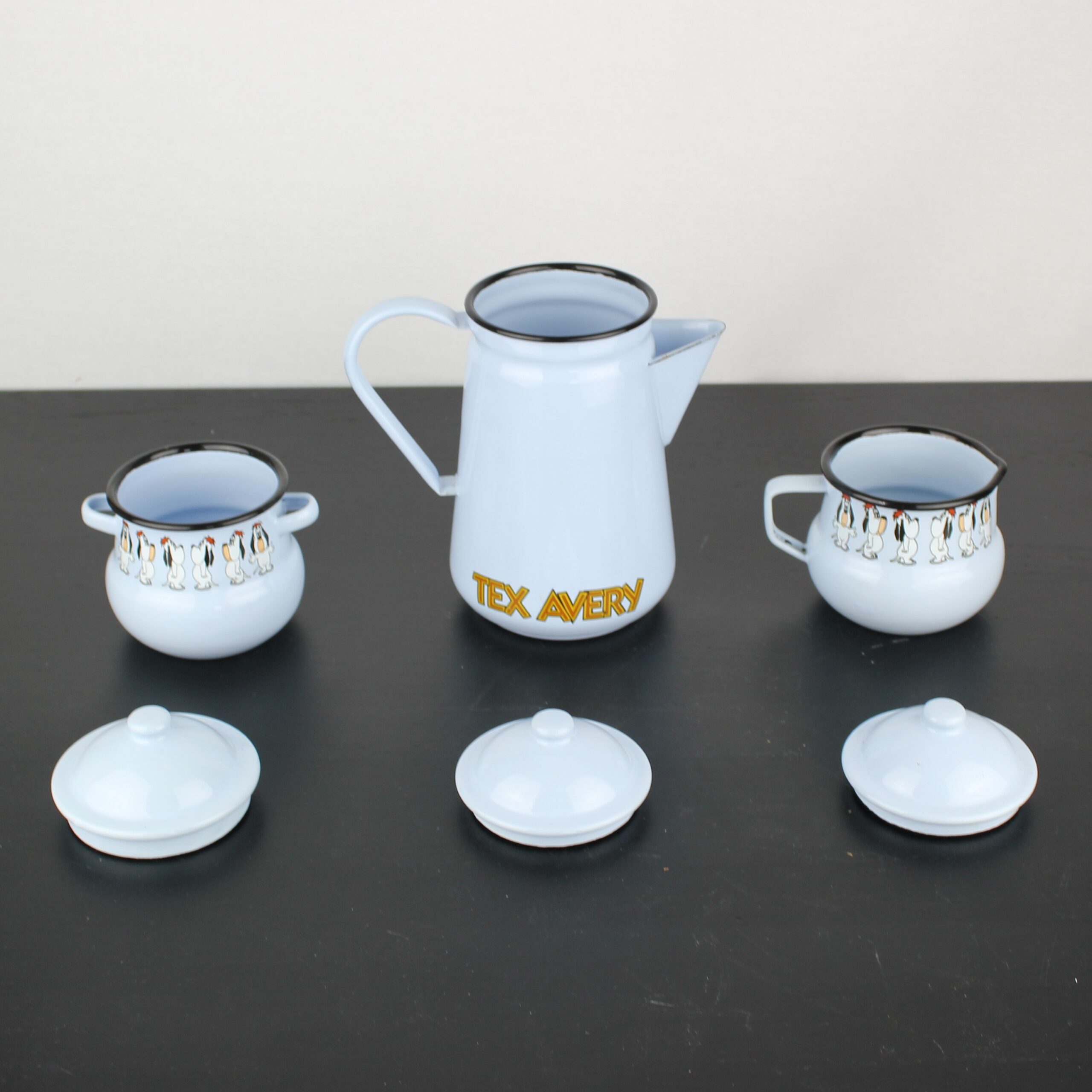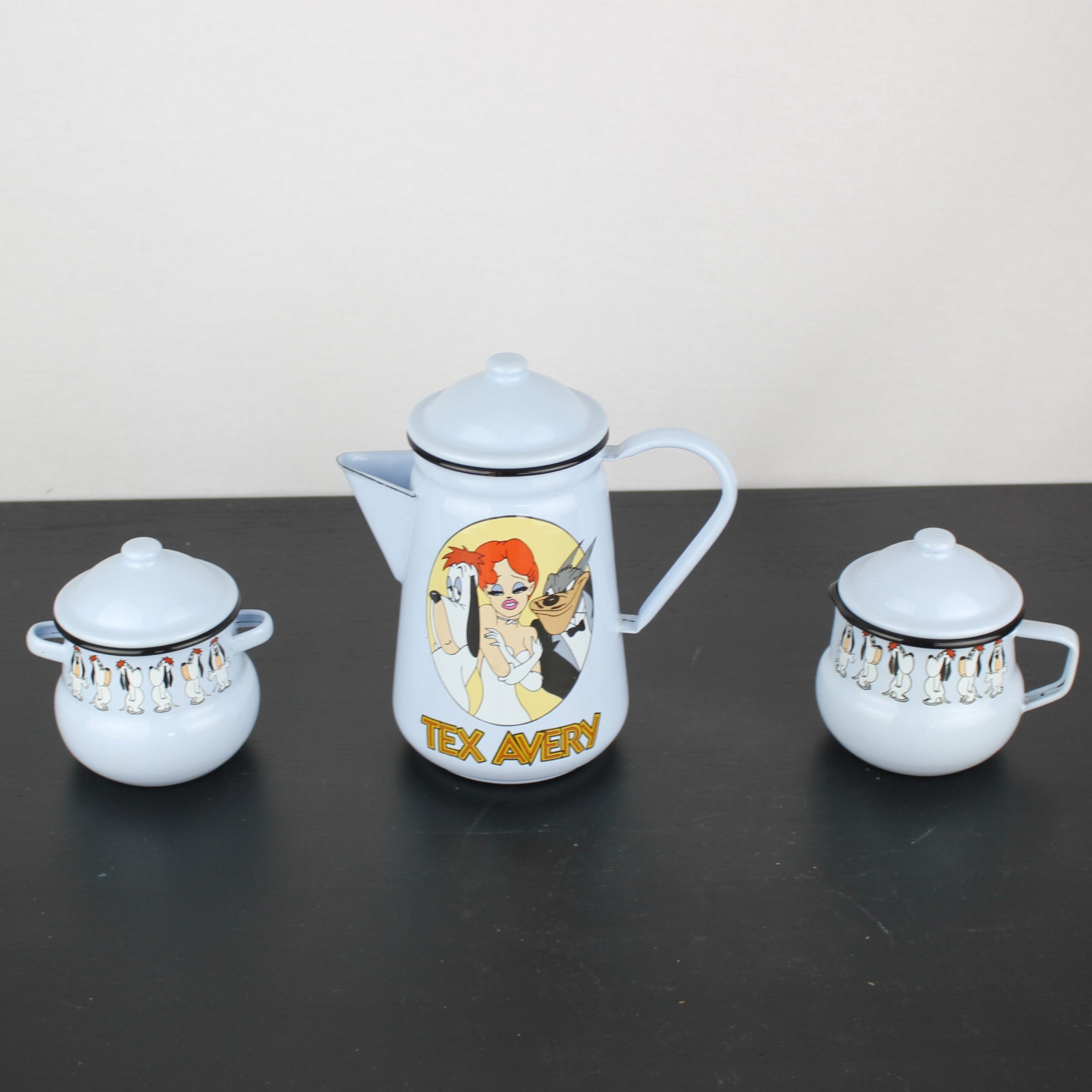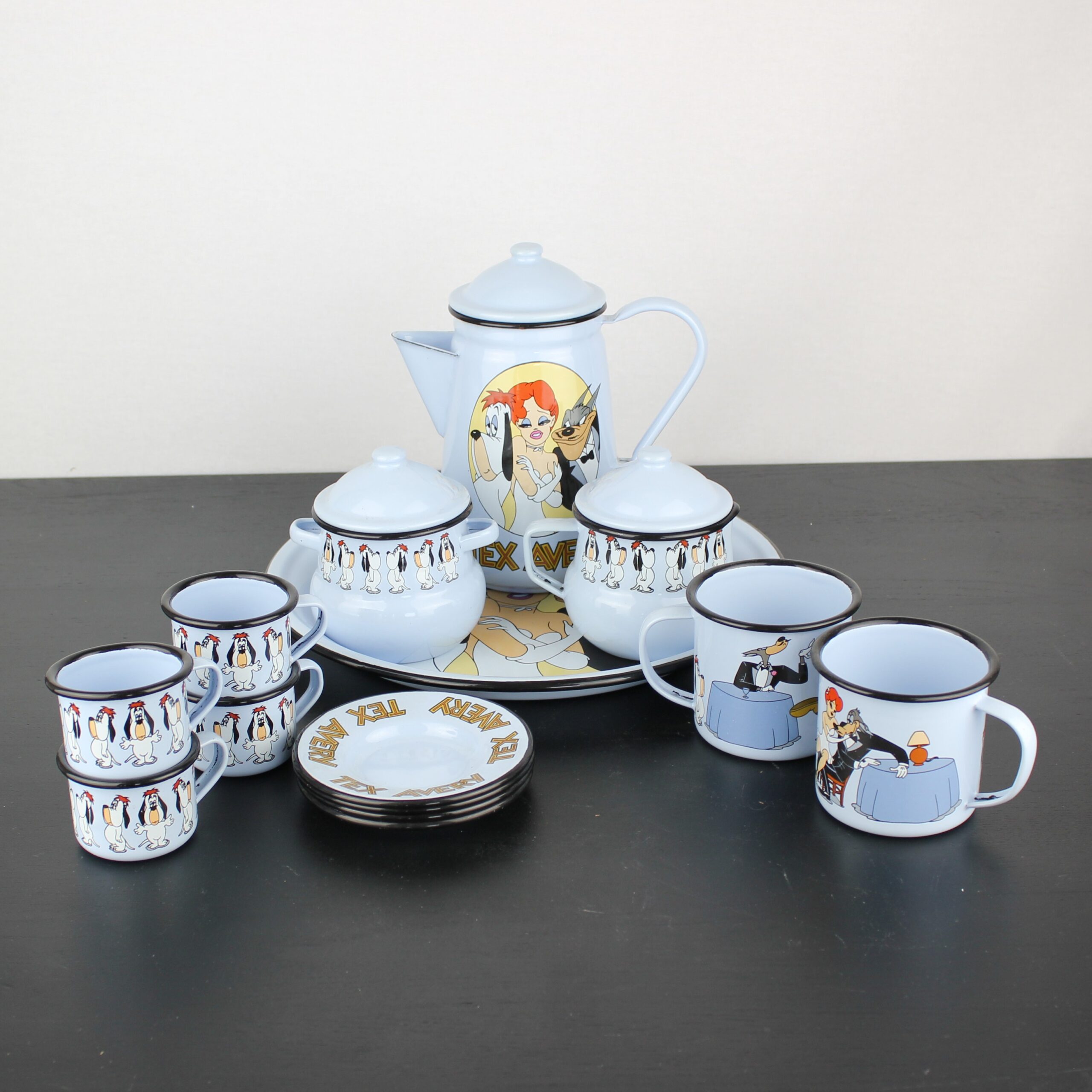 A unique and vintage set of enamel tableware from Tex Avery. For every collector and lover of Tex Avery and/or tableware this is a must have.